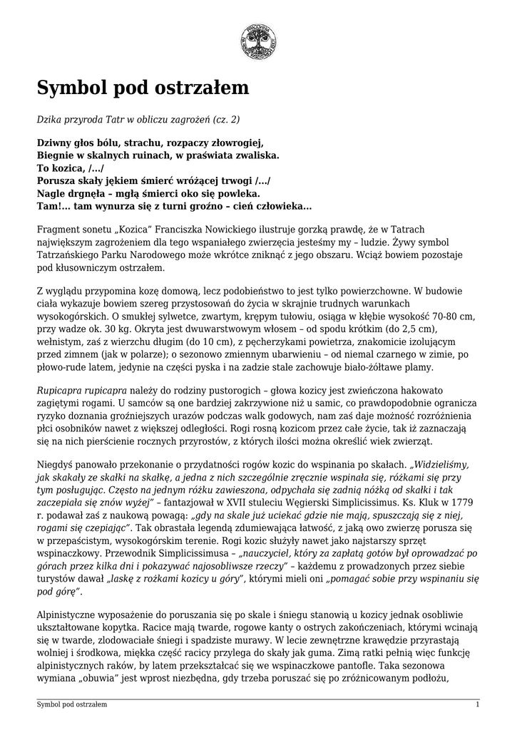 Symbol pod ostrzałem Dzika przyroda Tatr w obliczu zagrożeń (cz. 2) Dziwny głos bólu, strachu, rozpaczy złowrogiej, Biegnie w skalnych ruinach, w praświata zwaliska. To kozica, /.../ Porusza skały jękiem śmierć wróżącej trwogi /.../ Nagle drgnęła – mgłą śmierci oko się powleka. Tam!... tam wynurza się z turni groźno – cień człowieka... Fragment sonetu „Kozica” Franciszka Nowickiego ilustruje gorzką prawdę, że w Tatrach największym zagrożeniem dla tego wspaniałego zwierzęcia jesteśmy my – ludzie. Żywy symbol Tatrzańskiego Parku Narodowego może wkrótce zniknąć z jego obszaru. Wciąż bowiem pozostaje pod kłusowniczym ostrzałem. Z wyglądu przypomina kozę domową, lecz podobieństwo to jest tylko powierzchowne. W budowie ciała wykazuje bowiem szereg przystosowań do życia w skrajnie trudnych warunkach wysokogórskich. O smukłej sylwetce, zwartym, krępym tułowiu, osiąga w kłębie wysokość 70-80 cm, przy wadze ok. 30 kg. Okryta jest dwuwarstwowym włosem – od spodu krótkim (do 2,5 cm), wełnistym, zaś z wierzchu długim (do 10 cm), z pęcherzykami powietrza, znakomicie izolującym przed zimnem (jak w polarze); o sezonowo zmiennym ubarwieniu – od niemal czarnego w zimie, po płowo-rude latem, jedynie na części pyska i na zadzie stale zachowuje biało-żółtawe plamy. Rupicapra rupicapra należy do rodziny pustorogich – głowa kozicy jest zwieńczona hakowato zagiętymi rogami. U samców są one bardziej zakrzywione niż u samic, co prawdopodobnie ogranicza ryzyko doznania groźniejszych urazów podczas walk godowych, nam zaś daje możność rozróżnienia płci osobników nawet z większej odległości. Rogi rosną kozicom przez całe życie, tak iż zaznaczają się na nich pierścienie rocznych przyrostów, z których ilości można określić wiek zwierząt. Niegdyś panowało przekonanie o przydatności rogów kozic do wspinania po skałach. „Widzieliśmy, jak skakały ze skałki na skałkę, a jedna z nich szczególnie zręcznie wspinała się, różkami się przy tym posługując. Często na jednym różku zawieszona, odpychała się zadnią nóżką od skałki i tak zaczepiała się znów wyżej” – fantazjował w XVII stuleciu Węgierski Simplicissimus. Ks. Kluk w 1779 r. podawał zaś z naukową powagą: „gdy na skale już uciekać gdzie nie mają, spuszczają się z niej, rogami się czepiając”. Tak obrastała legendą zdumiewająca łatwość, z jaką owo zwierzę porusza się w przepaścistym, wysokogórskim terenie. Rogi kozic służyły nawet jako najstarszy sprzęt wspinaczkowy. Przewodnik Simplicissimusa – „nauczyciel, który za zapłatą gotów był oprowadzać po górach przez kilka dni i pokazywać najosobliwsze rzeczy” – każdemu z prowadzonych przez siebie turystów dawał „laskę z rożkami kozicy u góry”, którymi mieli oni „pomagać sobie przy wspinaniu się pod górę”. Alpinistyczne wyposażenie do poruszania się po skale i śniegu stanowią u kozicy jednak osobliwie ukształtowane kopytka. Racice mają twarde, rogowe kanty o ostrych zakończeniach, którymi wcinają się w twarde, zlodowaciałe śniegi i spadziste murawy. W lecie zewnętrzne krawędzie przyrastają wolniej i środkowa, miękka część racicy przylega do skały jak guma. Zimą ratki pełnią więc funkcję alpinistycznych raków, by latem przekształcać się we wspinaczkowe pantofle. Taka sezonowa wymiana „obuwia” jest wprost niezbędna, gdy trzeba poruszać się po zróżnicowanym podłożu, Symbol pod ostrzałem 1 wykonując 3-6-metrowe skoki w urwistym terenie, gdzie obsunięcie grozi upadkiem w przepaść. Nieodzowną jest również wysoka zdolność widzenia w różnych warunkach świetlnych. U kozic jest ona prawie trzykrotnie lepsza niż u człowieka. Ponadto – jak przystało na urodzone alpinistki – źrenice ich oczu osłaniane są wyrostkami tęczówki przed ostrym blaskiem promieni słonecznych, odbitych od śniegu. Ta adaptacja organu wzroku jest odpowiednikiem alpinistycznych okularów, chroniących od śnieżnej ślepoty. Dzięki temu specjalistycznemu „ekwipunkowi” kozice mogą bytować w ekstremalnych warunkach wysokogórskich. Jednak ich populacje odznaczają się stosunkowo znaczną, naturalną śmiertelnością. W Tatrach zdarza się, że zwierzęta te giną wyczerpane załamaniami pogody, porwane przez lawiny lub porażone piorunami; ulegają też chorobom i pasożytom, a także stają się ofiarami drapieżników: rysia i orła, a sporadycznie również wilka. Na przekór tym wszystkim naturalnym czynnikom ograniczającym, kozica przetrwała w Tatrach tysiące lat. Jest gatunkiem reliktowym. W epoce lodowcowej była szeroko rozprzestrzeniona na tundrowych obszarach Europy, jej kości znaleziono m.in. w jaskiniach pod Ojcowem. Wskutek zmian klimatycznych, po ustąpieniu lądolodu utrzymała się jedynie w wysokogórskich enklawach: od Gór Kantabryjskich i Pirenejów, przez Masyw Centralny, Alpy i Apeniny, Tatry i najwyższe masywy Karpat Południowych, Bałkanów i Gór Dynarskich, po góry Azji Mniejszej i Kaukaz. Na tych izolowanych stanowiskach genetycznie wyodrębniło się 10 jej podgatunków, z których Rupicapra rupicapra tatrica – wydzielony przez Blahouta w 1971 r. – zajmuje wysuniętą najdalej na północ, naturalną ostoję. Kozice żyją stadnie – w grupach po kilka-kilkanaście (wyjątkowo kilkadziesiąt) osobników. Każdy taki kierdel prowadzi zawsze najbardziej doświadczona samica, choć są w nim również młodsze samce. Starsze tworzą osobne koalicje po 2-4 osobniki, a najstarsze trzymają się samotnie. Capy przyłączają się do kóz na okres rui, który trwa od października do grudnia. Po ok. 170 dniach, w maju kocą się koźlęta (1-2), zdolne po paru godzinach do podążania za matką, a po 5-6 tygodniach – do samodzielnego żerowania. Jak pisał ks. Remigiusz Ładowski w wydanej w Krakowie w roku 1783 pierwszej polskiej encyklopedi