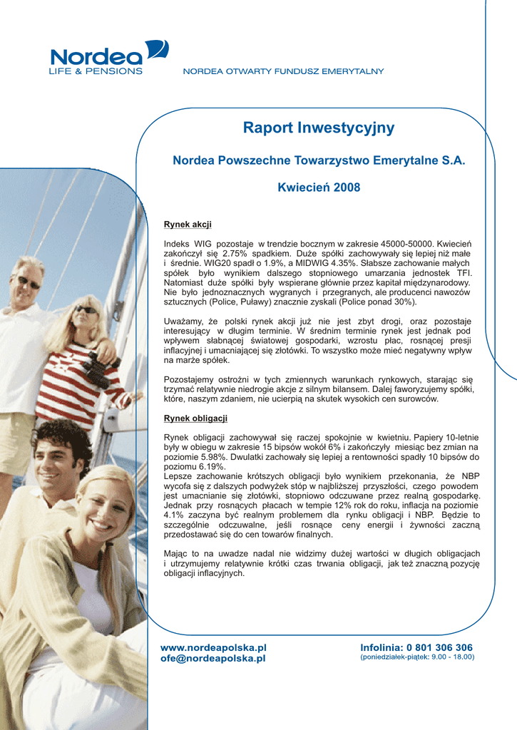 Raport Inwestycyjny Nordea Powszechne Towarzystwo Emerytalne S.A. Kwiecień 2008 Rynek akcji Indeks WIG pozostaje w trendzie bocznym w zakresie 45000-50000. Kwiecień zakończył się 2.75% spadkiem. Duże spółki zachowywały się lepiej niż małe i średnie. WIG20 spadł o 1.9%, a MIDWIG 4.35%. Słabsze zachowanie małych spółek było wynikiem dalszego stopniowego umarzania jednostek TFI. Natomiast duże spółki były wspierane głównie przez kapitał międzynarodowy. Nie było jednoznacznych wygranych i przegranych, ale producenci nawozów sztucznych (Police, Puławy) znacznie zyskali (Police ponad 30%). Uważamy, że polski rynek akcji już nie jest zbyt drogi, oraz pozostaje interesujący w długim terminie. W średnim terminie rynek jest jednak pod wpływem słabnącej światowej gospodarki, wzrostu płac, rosnącej presji inflacyjnej i umacniającej się złotówki. To wszystko może mieć negatywny wpływ na marże spółek. Pozostajemy ostrożni w tych zmiennych warunkach rynkowych, starając się trzymać relatywnie niedrogie akcje z silnym bilansem. Dalej faworyzujemy spółki, które, naszym zdaniem, nie ucierpią na skutek wysokich cen surowców. Rynek obligacji Rynek obligacji zachowywał się raczej spokojnie w kwietniu. Papiery 10-letnie były w obiegu w zakresie 15 bipsów wokół 6% i zakończyły miesiąc bez zmian na poziomie 5.98%. Dwulatki zachowały się lepiej a rentowności spadły 10 bipsów do poziomu 6.19%. Lepsze zachowanie krótszych obligacji było wynikiem przekonania, że NBP wycofa się z dalszych podwyżek stóp w najbliższej przyszłości, czego powodem jest umacnianie się złotówki, stopniowo odczuwane przez realną gospodarkę. Jednak przy rosnących płacach w tempie 12% rok do roku, inflacja na poziomie 4.1% zaczyna być realnym problemem dla rynku obligacji i NBP. Będzie to szczególnie odczuwalne, jeśli rosnące ceny energii i żywności zaczną przedostawać się do cen towarów finalnych. Mając to na uwadze nadal nie widzimy dużej wartości w długich obligacjach i utrzymujemy relatywnie krótki czas trwania obligacji, jak też znaczną pozycję obligacji inflacyjnych. Raport Inwestycyjny - Kwiecień 2008 Inwestycje alternatywne W trendzie bocznym na rynkach międzynarodowych nasza obligacja z ochroną kapitału i opcją na hedge fund zyskała 2%. Wyniki Po przeciętnym marcu Nordea OFE zanotowała w kwietniu niezły wynik. Od początku roku awansowaliśmy na czwartą pozycję w rankingu OFE. WYNIKI WARTA Ostatni miesiąc Od początku roku -0.26 -4.08 -0.33 -4.31 -0.33 -4.45 -0.33 -4.65 -0.43 -4.75 -0.46 WARTA -4.80 -0.49 -4.94 -0.54 -5.01 -0.54 -5.07 -0.56 -5.08 -0.68 -5.27 -0.68 -5.36 -0.81 -5.58 -1.00 -5.64 -1.30 -5.66 -0.53 -5.05 Średnio -0.58 Średnio -4.98 Mediana -0.54 Mediana -5.01 Spread Nordea do Benchmarku 0.20 Spread Nordea do Benchmarku 0.40 Raport przygotował Departament Inwestycji, e-mail: [email protected]