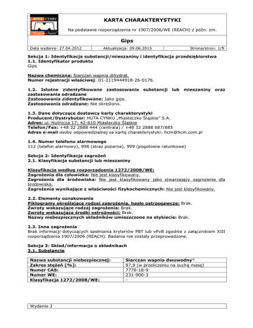 KARTA CHARAKTERYSTYKI Na podstawie rozporządzenia nr 1907/2006/WE (REACH) z późn. zm. Gips Data wydania: 27.04.2012 Aktualizacja: 09.06.2015 Strona/stron: 1/9 Sekcja 1: Identyfikacja substancji/mieszaniny i identyfikacja przedsiębiorstwa 1.1. Identyfikator produktu Gips Nazwa chemiczna: Siarczan wapnia dihydrat. Numer rejestracji właściwej: 01-2119444918-26-0176. 1.2. Istotne zidentyfikowane zastosowania zastosowania odradzane Zastosowania zidentyfikowane: Jako gips. Zastosowania odradzane: Nie określono. substancji lub mieszaniny oraz 1.3. Dane dotyczące dostawcy karty charakterystyki Producent/Dystrybutor: HUTA CYNKU „Miasteczko Śląskie” S.A. Adres: ul. Hutnicza 17; 42-610 Miasteczko Śląskie Telefon/Fax: +48 32 2888 444 (centrala) / +48 32 2888 687/885 Adres e-mail osoby odpowiedzialnej za kartę charakterystyki: [email protected] 1.4. Numer telefonu alarmowego 112 (telefon alarmowy), 998 (straż pożarna), 999 (pogotowie ratunkowe) Sekcja 2: Identyfikacja zagrożeń 2.1. Klasyfikacja substancji lub mieszaniny Klasyfikacja według rozporządzenia 1272/2008/WE: Zagrożenia dla człowieka: Nie jest klasyfikowany. Zagrożenia dla środowiska: Nie jest klasyfikowany jako stwarzający zagrożenie dla środowiska. Zagrożenia wynikające z właściwości fizykochemicznych: Nie jest klasyfikowany. 2.2. Elementy oznakowania Piktogramy określające rodzaj zagrożenia, hasło ostrzegawcze: Brak. Zwroty wskazujące rodzaj zagrożenia: Brak. Zwroty wskazujące środki ostrożności: Brak. Nazwy niebezpiecznych składników umieszczone na etykiecie: Brak. 2.3. Inne zagrożenia Brak informacji dotyczących spełniania kryteriów PBT lub vPvB zgodnie z załącznikiem XIII rozporządzenia 1907/2006 (REACH). Badania nie zostały przeprowadzone. Sekcja 3: Skład/informacja o składnikach 3.1. Substancje Nazwa substancji niebezpiecznej: Zakres stężeń [%]: Numer CAS: Numer WE: Klasyfikacja 1272/2008/WE: Wydanie 2 Siarczan wapnia dwuwodny* 97,9 (w przeliczeniu na suchą masę) 7778-18-9 231-900-3 - KARTA CHARAKTERYSTYKI Na podstawie rozporządzenia nr 1907/2006/WE (REACH) z późn. zm. Gips Data wydania: 27.04.2012 Aktualizacja: 09.06.2015 Nazwa substancji niebezpiecznej: Zakres stężeń [%]: Numer CAS: Numer WE: Klasyfikacja 1272/2008/WE: Strona/stron: 2/9 Węglan wapnia* 1,43 (w przeliczeniu na suchą masę) 471-34-1 207-439-9 - W sekcji 16 podano znaczenie zwrotów H oraz symboli. *Substancja nieklasyfikowana w Załączniku VI, Tabeli 3.1 rozporządzenia 1272/2008. Zawartość innych zanieczyszczeń nie przekracza ogółem 0,02%. 3.2. Mieszaniny Nie dotyczy. Sekcja 4: Środki pierwszej pomocy 4.1. Opis środków pierwszej pomocy Opisane poniżej zalecenia dotyczą pracy w warunkach narażenia na pyły wytwarzające się podczas pracy z gipsem. Narażenie drogą oddechową: Przenieść na świeże powietrze i zapewnić warunki do odpoczynku. W przypadku wystąpienia niepokojących objawów zasięgnąć porady lekarskiej. Kontakt ze skórą: Zdjąć zanieczyszczoną odzież i buty. Zanieczyszczone miejsce przemywać obficie wodą. W przypadku wystąpienia niepokojących objawów (np. cech podrażnienia skóry itp.) zasięgnąć porady lekarskiej. Kontakt z oczami: Usunąć szkła kontaktowe. Przemywać zanieczyszczone oczy wodą przynajmniej przez 15 minut, przy wywiniętych powiekach. Co pewien czas nakładać powiekę górną na dolną. W przypadku wystąpienia niepokojących objawów zasięgnąć porady lekarskiej. Po spożyciu: Przepłukać usta wodą. Nie wywoływać wymiotów bez zaleceń lekarza. W przypadku wystąpienia niepokojących objawów zasięgnąć porady lekarskiej. W przypadku spożycia podanie gliceryny, roztworu żelatyny lub dużych ilości wody może opóźnić proces utwardzania się gipsu w żołądku. 4.2. Najważniejsze ostre i opóźnione objawy oraz skutki narażenia Narażenie drogą oddechową: Narażenie na duże stężenia pyłów może powodować podrażnienie dróg oddechowych z kaszlem i skróceniem oddechu. Kontakt ze skórą: Może powodować podrażnienie skóry z zaczerwieniem i bólem. Kontakt z oczami: Może powodować podrażnienie oczu z zaczerwieniem i bólem. Po spożyciu: Może powodować zaczopowanie żołądka w następstwie utwardzenia w kontakcie z wodą i ból brzucha. 4.3. Wskazania dotyczące wszelkiej natychmiastowej pomocy lekarskiej i szczególnego postępowania z poszkodowanym Wyprowadzić poszkodowaną osobę z zanieczyszczonego produktem środowiska. W razie wystąpienia problemów zdrowotnych skontaktować się z lekarzem lub centrum toksykologicznym. Przekazać informacje zawarte w karcie charakterystyki. Osobie nieprzytomnej nie podawać niczego doustnie. Wydanie 2 KARTA CHARAKTERYSTYKI Na podstawie rozporządzenia nr 1907/2006/WE (REACH) z późn. zm. Gips Data wydania: 27.04.2012 Aktualizacja: 09.06.2015 Strona/stron: 3/9 Sekcja 5: Postępowanie w przypadku pożaru 5.1. Środki gaśnicze Odpowiednie środki gaśnicze: Powszechnie stosowane środki gaśnicze. Środki gaśnicze dostosować do otoczenia. Niewłaściwe środki gaśnicze: Nie określono. 5.2. Szczególne zagrożenia związane z substancją lub mieszaniną Produkt niepalny. Podczas pożaru mogą tworzyć się niebezpieczne produkty m. in. tlenki siarki. Należy unikać wdychania produktów spalania, ponieważ mogą stwarzać zagrożenie dla zdrowia. 5.3. Informacje dla straży pożarnej Stosować pełne wyposażenie ochronne oraz aparaty izolujące drogi oddechowe z niezależnym obiegiem powietrza. Pojemniki narażone na działania ognia lub wysokiej temperatury chłodzić strumieniem rozproszonej wody i w miarę możliwości usunąć z zagrożonego obszaru. Zbierać mechanicznie. Chronić kanalizację, wody powierzchniowe i glebę przed zanieczyszczeniem. Sekcja 6: Postępowanie w przypadku niezamierzonego uwolnienia do środowiska 6.1. Indywidualne środki ostrożności, wyposażenie ochronne i procedury w sytuacjach awaryjnych Dla osób nienależących do pe