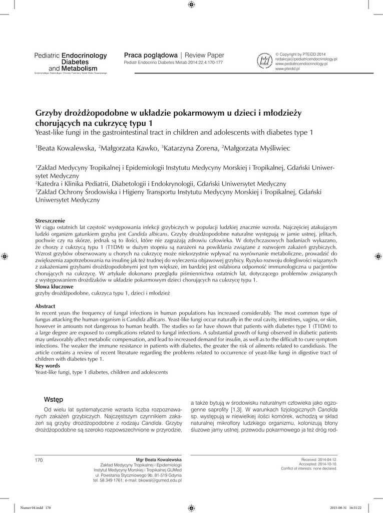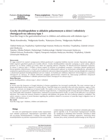 Praca poglądowa | Review Paper Pediatr Endocrino Diabetes Metab 2014;22,4:170-177 © Copyright by PTEiDD 2014 [email protected] www.pediatricendocrinology.pl www.pteidd.pl Grzyby drożdżopodobne w układzie pokarmowym u dzieci i młodzieży chorujących na cukrzycę typu 1 Yeast-like fungi in the gastrointestinal tract in children and adolescents with diabetes type 1 Beata Kowalewska, 2Małgorzata Kawko, 3Katarzyna Zorena, 2Małgorzata Myśliwiec 1 Zakład Medycyny Tropikalnej i Epidemiologii Instytutu Medycyny Morskiej i Tropikalnej, Gdański Uniwersytet Medyczny 2 Katedra i Klinika Pediatrii, Diabetologii i Endokrynologii, Gdański Uniwersytet Medyczny 3 Zakład Ochrony Środowiska i Higieny Transportu Instytutu Medycyny Morskiej i Tropikalnej, Gdański Uniwersytet Medyczny 1 Streszczenie W ciągu ostatnich lat częstość występowania infekcji grzybiczych w populacji ludzkiej znacznie wzrosła. Najczęściej atakującym ludzki organizm gatunkiem grzyba jest Candida albicans. Grzyby drożdżopodobne naturalne występują w jamie ustnej, jelitach, pochwie czy na skórze, jednak są to ilości, które nie zagrażają zdrowiu człowieka. W dotychczasowych badaniach wykazano, że chorzy z cukrzycą typu 1 (T1DM) w dużym stopniu są narażeni na powikłania związane z rozwojem zakażeń grzybiczych. Wzrost grzybów obserwowany u chorych na cukrzycę może niekorzystnie wpływać na wyrównanie metaboliczne, prowadzić do zwiększenia zapotrzebowania na insulinę jak też trudnej do wyleczenia objawowej grzybicy. Ryzyko rozwoju dolegliwości wiązanych z zakażeniami grzybami drożdżopodobnymi jest tym większe, im bardziej jest osłabiona odporność immunologiczna u pacjentów chorujących na cukrzycę. W artykule dokonano przeglądu piśmiennictwa ostatnich lat, dotyczącego problemów związanych z występowaniem drożdżaków w układzie pokarmowym dzieci chorujących na cukrzycę typu 1. Słowa kluczowe grzyby drożdżpodobne, cukrzyca typu 1, dzieci i młodzież Abstract In recent years the frequency of fungal infections in human populations has increased considerably. The most common type of fungus attacking the human organism is Candida albicans. Yeast-like fungi occur naturally in the oral cavity, intestines, vagina, or skin, however in amounts not dangerous to human health. The studies so far have shown that patients with diabetes type 1 (T1DM) to a large degree are exposed to complications related to fungal infections. A substantial growth of fungi observed in diabetic patients may unfavorably affect metabolic compensation, and lead to increased demand for insulin, as well as to the difficult to cure symptom infections. The weaker the immune resistance in patients with diabetes, the greater the risk of ailments related to candidiasis. The article contains a review of recent literature regarding the problems related to occurrence of yeast-like fungi in digestive tract of children with diabetes type 1. Key words Yeast-like fungi, type 1 diabetes, children and adolescents Wstęp Od wielu lat systematycznie wzrasta liczba rozpoznawanych zakażeń grzybiczych. Najczęstszym czynnikiem zakażeń są grzyby drożdżopodobne z rodzaju Candida. Grzyby drożdżopodobne są szeroko rozpowszechnione w przyrodzie, 170 Numer 04.indd 170 Mgr Beata Kowalewska Zakład Medycyny Tropikalnej i Epidemiologii Instytut Medycyny Morskiej i Tropikalnej GUMed ul. Powstania Styczniowego 9b, 81-519 Gdynia tel. 58 349 1761; e-mail: [email protected] a także bytują w środowisku naturalnym człowieka jako egzogenne saprofity [1,3]. W warunkach fizjologicznych Candida sp. występują w niewielkiej ilości komórek, wchodzą w skład naturalnej mikroflory ludzkiego organizmu, kolonizują błony śluzowe jamy ustnej, przewodu pokarmowego ja też dróg rod- Received: 2014-04-12. Acccepted: 2014-10-10. Conflict of interests: none declared. 2015-08-31 16:51:22 Grzyby drożdżopodobne w układzie pokarmowym u dzieci i młodzieży... Yeast-like fungi in the gastrointestinal tract in children and adolescents... nych kobiet [1–3]. Gatunkiem najczęściej izolowanym z różnych ontocenoz jest Candida albicans [4]. Grzyby z rodzaju Candida są to organizmy, które występują w formie jednokomórkowej w postaci drobnych, cienkościennych, kulistych lub owalnych komórek wegetatywnych, rozmnażających się poprzez pączkowanie. Wiele gatunków Candida posiada zdolność tworzenia pseudostrzępek, Candida albicans tworzy także strzępki właściwe [3–4]. Obecnie znanych jest ok. 190 gatunków z rodzaju Candida, z czego na podstawie wieloletnich badań za patogenne uznaje się co najmniej 15 gatunków: C.albicans, C. catenulata, C.dublinniensis C. guilliermondii, C. kefyr, C. krusei, C. lusitaniae, C. parapsilosis, C. pulcherrima, C. tropicalis, C. zeylanoides, C. dattila, C. famata, C. glabrata, C. inconspicua [5–6]. Od wielu lat prowadzone są badania nad inwazyjnością drożdżaków z rodzaju Candida, jednak nadal określenie, w którym momencie kończy się nosicielstwo, a zaczyna inwazja, kiedy należy stosować profilaktykę przeciwgrzybiczą, nie jest rozstrzygnięte. Samo zasiedlenie przewodu pokarmowego przez grzyby nie oznacza jeszcze infekcji. W rozwoju kandydozy ważna jest liczba komórek grzyba atakującego błonę śluzową i jego wirulencja zależna od zdolności namnażania, zjawiska adherencji, produkcji enzymów oraz toksycznych metabolitów [1–2, 7–8]. Przyjmuje się, że grzyby z rodzaju Candida mogą występować bezobjawowo w układzie pokarmowym u 6–60% osób zdrowych. W zdrowym organizmie ludzkim, przy prawidłowo działających mechanizmach obronnych, nie dochodzi do rozwoju zakażenia grzybiczego. Natomiast pojawienie się czynnika, który umożliwia zwiększenie liczby komórek grzyba, zapoczątkowując ich penetrację w głąb tkanki, może doprowadzić do rozwoju objawowej kandydozy [4,9]. Zakażenie następuje w wyniku zaburzeń w mechanizmach obronnych organizmu gospoda