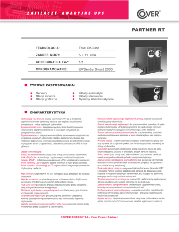 PARTNER RT TECHNOLOGIA: True On-Line ZAKRES MOCY: 5 ÷ 11 kVA KONFIGURACJA FAZ: 1/1 OPROGRAMOWANIE: UPSentry Smart 2000 Serwery Stacje robocze Stacje graficzne Uk³ady automatyki Uk³ady sterowania Systemy teleinformatyczne Technologia True On-Line Double Conversion (VFI zg. z IEC62040) zapewnia doskona³e parametry napiêcia bez wzglêdu na zak³ócenia energetyczne i rodzaj zasilanych odbiorników. Bypass automatyczny – bezprzerwowy (typu Static Switch) zapewnia nieprzerwane zasilanie odbiorników w sytuacjach krytycznych jak przegrzanie lub awaria. Bypass serwisowy – bezprzerwowy umo¿liwia serwisowanie urz¹dzenia bez wy³¹czania zasilanych odbiorników. Osobne zasilanie toru Bypass daje mo¿liwoœæ zapewnienia rezerwowego Ÿród³a zasilania dla odbiorników nawet w przypadku awarii urz¹dzenia lub zadzia³ania zabezpieczeñ UPS w torze g³ównym. Z³¹cza komunikacyjne: RS232 do monitorowania i zarz¹dzania prac¹ zasilacza oraz odbiorników, LAN – DryContact komunikacja z systemowymi modu³ami zarz¹dzania, Adapter SNMP – zintegrowane zarz¹dzania UPS z urz¹dzeniami sieciowymi. Panel kontrolny LED w czytelny sposób informuje o trybie pracy zasilacza. Panel kontrolno – monitoruj¹cy LCD daje mo¿liwoœæ diagnostyki parametrów i trybu pracy zasilacza. Ma³e wymiary, dziêki którym nie jest wymagana du¿a przestrzeñ do instalacji urz¹dzenia. Wysoka sprawnoœæ urz¹dzenia ogranicza emitowane ciep³o, dziêki czemu ewentualne ch³odzenie pomieszczeñ jest prostsze i tañsze. Tryb ECO-Mode pozwala na znaczn¹ redukcjê kosztów pracy urz¹dzenia oraz praktycznie eliminuje emisjê ciep³a. Mo¿liwoœæ wyd³u¿enia czasu podtrzymania umo¿liwia precyzyjne dobranie wymaganego czasu autonomii. Automatyczna diagnostyka gwarantuje pe³n¹ sprawnoœæ urz¹dzenia, kontrolê podzespo³ów i parametrów pracy bez koniecznoœci ingerencji u¿ytkownika. Wysoka wartoœæ wejœciowego wspó³czynnika mocy ogranicza wartoœæ pr¹du Pobieranego przez urz¹dzenie z sieci miejskiej. Wysoka wartoœæ wyjœciowego wspó³czynnika mocy pozwala na zasilanie szerokiej gamy odbiorników. Szeroki zakres napiêæ wejœciowych dla pracy normalnej powoduje, i¿ wykorzystanie baterii przez UPS jest ograniczone do niezbêdnego minimum, praktycznie jedynie w przypadkach ca³kowitego zaniku zasilania. Szeroki zakres czêstotliwoœci wejœciowej dla pracy normalnej umo¿liwia swobodne zastosowanie zasilacza w sieci mieszanej typu sieæ miejska – generator. Prostota obs³ugi – w pe³ni automatyczna praca oraz mo¿liwoœæ pracy nonstop sprawia, ¿e urz¹dzenie praktycznie nie wymaga ¿adnej interwencji ze strony u¿ytkownika. Autorestart gwarantuje bezobs³ugow¹ pracê urz¹dzenia nawet po ca³kowitym od³¹czeniu zasilania w przypadku d³ugich zaników napiêcia. Start z baterii (tzw. zimny start) daje mo¿liwoœæ uruchomienia zasilacza nawet w przypadku ca³kowitego braku napiêcia zasilaj¹cego. Zaawansowane zarz¹dzanie akumulatorami daje gwarancjê optymalnego ³adowania i wykorzystania baterii akumulatorów, zwiêksza ich ¿ywotnoœæ oraz obni¿a koszty eksploatacji. Doskona³a jakoœæ napiêcia, osi¹gana dziêki zastosowaniu falownika IGBT i modulacji PWM o wysokiej czêstotliwoœci sprawia, ¿e dostarczane jest napiêcie o wyj¹tkowo stabilnych parametrach, bez wzglêdu na zak³ócenia energetyczne i rodzaj zasilanych urz¹dzeñ. Wysoka odpornoœæ na przeci¹¿enia to pewnoœæ zasilania przy wystêpowaniu stanów nieustalonych i wysoka tolerancja na b³êdy obs³ugi. Zaawansowane oprogramowanie umo¿liwiaj¹ce u¿ytkownikowi pe³n¹ kontrolê nad urz¹dzeniem i zasilanymi odbiornikami. Konfigurowalnoœæ parametrów pracy – napiêcia nominalne, czêstotliwoœci, preferowane tryby pracy, sposób komunikacji – znacznie poszerza gamê mo¿liwych zastosowañ. Bypass rêczny – bezprzerwowy umo¿liwia za³¹czenie odbiorników o szczególnie „ciê¿kim rozruchu” bez nara¿ania uk³adów wyjœciowych zasilacza. COVER ENERGY SA - Your Power Partner PARTNER 50 - 70 - 90 - 110 RT Model Partner RT 70 Partner RT 110 Moc 5kVA 7kVA 9kVA 11kVA Iloœæ faz we / wy 1/1 Wejœcie Napiêcie nominalne 220 / 230 / 240 VAC Zakres napiêcia -30 % / +20% Czêstotliwoœæ 50 / 60 Hz Zakres czêstotliwoœci ± 5Hz Wejœciowy wspó³czynnik mocy => 0,99 Wyjœcie Moc 5000VA/3500W 7000VA/4900W 9000VA/6600W 11000VA/8000W Rozbudowa mocy do max. 7 kVA 7 kVA 11 kVA 11 kVA Wspó³czynnik mocy 0,7 Napiêcie nominalne 200 / 208 / 220 / 230 / 240 VAC Czêstotliwoœæ nominalna 50 / 60 Hz ± 0.05 Hz Przeci¹¿alnoœæ < 102% ci¹g³e, 102 - 125% - 60 sek., 125%-150% - 30 sek., > 150% / 2 sek. Sprawnoœæ w trybie on-line przy cos =0,8 i 100% obci¹¿eniu/ ECOmode 92% / 99% Wspó³czynnik szczytu 3:1 Baterie Typ Szczelne, kwasowo-o³owiowe, 12 V Modu³y bateryjne 20 baterii 7Ah 20 baterii 9Ah Czas ³adowania programowalny 4 godz. do 90% pojemnoœci Czas autonomii (min.): -UPS z 1 modu³em bat. 12 7 7 5 -UPS z 2 modu³ami bat. 30 20 17 14 -UPS z 3 modu³ami bat. 55 32 26 22 Wymiary i waga Wymiary S x G x W - mod. UPS i mod. bat. 445 mm x 563 mm x 130 mm (19“ x 3U) Waga - UPS bez baterii 20,5 kg 24,5 kg Waga - Modu³u baterii 69,5 kg Sygnalizacja i porty komunikacyjne WskaŸnik stanu pracy Wyœwietlacz LCD, wskaŸnik LED, alarm dŸwiêkowy Komunikacja RS232, port Dry Contact, SNMP Slot, REPO Warunki œrodowiskowe Poziom ha³asu < 50 dB (A) Dopuszczalna temperatura pracy 0 oC ÷ 45 oC Zalecana temperatura pracy 15 oC ÷ 25 oC Temperatura sk³adowania - 20 oC ÷ 40 oC Wilgotnoœæ 0 ÷ 95 % (bez kondensacji) Normy Odpornoœæ na zak³ócenia EN 50091-2 Bezpieczeñstwo TÜV, CE, EN 50091-1 Wyposa¿enie opcjonalne - Oprogramowanie zarz¹dzaj¹ce UPSentry Smart 2000 (CD-ROM w cenie zasilacza) - Karta SNMP/Web - Dodatkowe modu³y bateryjne - Zdalny panel sygnalizacyjny - Bypass zewnêtrzny bezprzerwowy - Wy³¹cznik p-po¿. (EPO) W publikacji podano parametry standardowych modeli. W zwi¹zku ze sta³ym udoskonalan