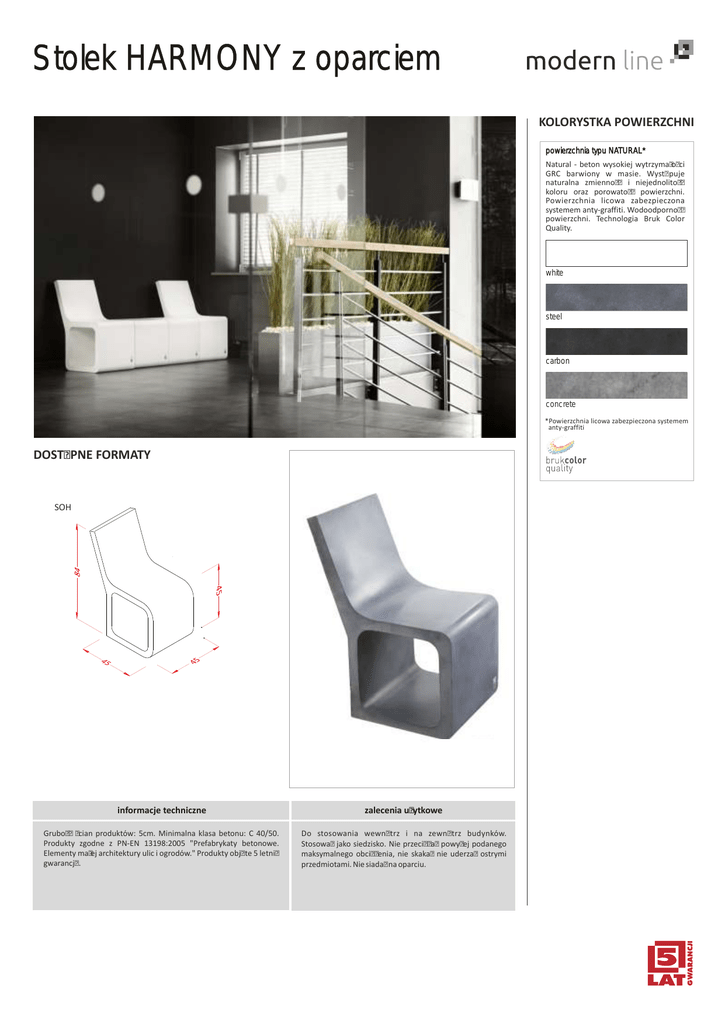 Stolek HARMONY z oparciem KOLORYSTKA POWIERZCHNI powierzchnia typu NATURAL* Natural - beton wysokiej wytrzymałości GRC barwiony w masie. Występuje naturalna zmienność i niejednolitość koloru oraz porowatość powierzchni. Powierzchnia licowa zabezpieczona systemem anty-graffiti. Wodoodporność powierzchni. Technologia Bruk Color Quality. white steel carbon concrete *Powierzchnia licowa zabezpieczona systemem anty-graffiti DOSTĘPNE FORMATY SOH informacje techniczne zalecenia użytkowe Grubość ścian produktów: 5cm. Minimalna klasa betonu: C 40/50. Produkty zgodne z PN-EN 13198:2005 "Prefabrykaty betonowe. Elementy małej architektury ulic i ogrodów." Produkty objęte 5 letnią gwarancją. Do stosowania wewnątrz i na zewnątrz budynków. Stosować jako siedzisko. Nie przeciążać powyżej podanego maksymalnego obciążenia, nie skakać nie uderzać ostrymi przedmiotami. Nie siadać na oparciu.