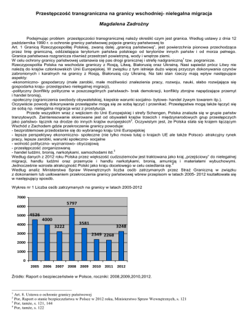 Przestępczość transgraniczna na granicy wschodniej- nielegalna migracja Magdalena Zadrożny Podejmując problem przestępczości transgranicznej należy określić czym jest granica. Według ustawy z dnia 12 października 1990 r. o ochronie granicy państwowej pojęcie granicy państwowej to Art. 1 Granicą Rzeczypospolitej Polskiej, zwaną dalej „granicą państwową”, jest powierzchnia pionowa przechodząca przez linię graniczną, oddzielająca terytorium państwa polskiego od terytoriów innych państw i od morza pełnego. Granica państwowa rozgranicza również przestrzeń powietrzną, wody i wnętrze ziemi. 1 W celu ochrony granicy państwowej ustanawia się pas drogi granicznej i strefę nadgraniczną tzw. pogranicze. Rzeczypospolita Polska na wschodzie graniczy z Rosją, Litwą, Białorusią oraz Ukrainą. Nasi sąsiedzi prócz Litwy nie należą do krajów członkowskich Unii Europejskiej. W związku z tym istnieje dużo więcej przyczyn dokonywania czynów zabronionych i karalnych na granicy z Rosją, Białorusią czy Ukrainą. Na taki stan rzeczy mają wpływ następujące aspekty: -ekonomiczno- gospodarczy (małe zarobki, małe możliwości znalezienia pracy, rozwoju, nauki, słabo rozwijająca się gospodarka kraju- przestępstwo nielegalnej migracji), -polityczny (konflikty polityczne w poszczególnych państwach- brak demokracji, konflikty zbrojne napędzające przemyt i handel bronią), -społeczny (ograniczenia swobody obywatelskiej, kiepskie warunki socjalno- bytowe- handel żywym towarem itp.). Oczywiście powody dokonywania przestępstw mogą się ze sobą łączyć i przenikać. Przestępstwa mogą także łączyć się ze sobą np. nielegalna migracja wraz z prostytucja. Przede wszystkim wraz z wejściem do Unii Europejskiej i strefy Schengen, Polska znalazła się w grupie państw tranzytowych. Zainteresowanie skierowane jest od obywateli krajów trzecich i międzynarodowych grup przestępczych 2 jako państwo- łącznik na drodze do innych krajów europejskich . Oczywistym jest, że Polska stała się krajem łączącym Wschód z Zachodem gdzie przekroczenie granicy powoduje: - bezproblemowe przedostanie się do wybranego kraju Unii Europejskiej - lepsze perspektywy ekonomiczno- społeczne (nie tylko mowa tutaj o krajach UE ale także Polsce)- atrakcyjny rynek pracy, lepsze zarobki, warunki społeczno- socjalne - wolność polityczno- wyznaniowo- obyczajową - przestępczość zorganizowaną 3 - handel ludźmi, bronią, narkotykami, samochodami itd. Według danych z 2012 roku Polska przez większość cudzoziemców jest traktowana jako kraj „przejściowy” do nielegalnej migracji, handlu ludźmi oraz przemycie i handlu narkotykami, bronią, amunicją i materiałami wybuchowymi. 4 Jednocześnie wzrosła atrakcyjność Polski jako kraju docelowego w celu osiedlania się. Według analiz Ministerstwa Spraw Wewnętrznych liczba osób zatrzymanych przez Straż Graniczną w związku z dokonaniem lub usiłowaniem przekroczenia granicy państwowej wbrew przepisom w latach 2005- 2012 kształtowała się w następujący sposób. Wykres nr 1 Liczba osób zatrzymanych na granicy w latach 2005-2012 7000 5797 6000 5000 4526 4000 4000 3000 3581 3248 3222 2349 2268 2000 1000 0 2005 2006 2007 2008 2009 2010 2011 2012 Źródło: Raport o bezpieczeństwie w Polsce, roczniki: 2008,2009,2010,2012. 1 Art. 8. Ustawa o ochronie granicy państwowej Por, Raport o stanie bezpieczeństwa w Polsce w 2012 roku, Ministerstwo Spraw Wewnętrznych, s. 121 3 Por, tamże, s. 121, 144 4 Por, tamże, s. 122 2 Jak powyższy wykres przedstawia liczba przestępstw migracyjnych w latach 2005-2006 utrzymywała się na zbliżonym poziomie. W roku 2007 trochę spadła, natomiast w roku 2008 osiągnęła najwyższą liczbę. W roku 2009 liczba ta powróciła do poziomu z lat 2005-2007 a w 2010 i w 2011 spadła. W zeszłym roku liczba migracji znów wzrosła. Istotnym jest to, że zatrzymani należeli do państw trzeciego świata, co ujmowane jest w analizach jako wszystkie państwa nie należące do Unii Europejskiej oraz bezpaństwowców. Jeżeli zaś mowa o najwyższym wyniku to interpretuje się tak ogromny wzrost jako efekt przystąpienia do strefy Schengen. Według kolejnych danych najczęściej nielegalnie przekraczaną granicą jest granica z Ukrainą. Odcinek ten jest najbardziej zagrożony przestępczością oraz najbardziej pilnowany przez patrole funkcjonariuszy polsko- ukraińskich. Tabela nr 1 Nielegalne przekraczanie granicy Rosja Białoruś 2005 39 114 2006 39 95 2007 44 131 2008 72 469 2009 188 245 Źródło: Raport o bezpieczeństwie Polski, rok 2009 Ukraina 931 1082 881 2829 935 Litwa 40 51 46 295 83 W roku 2010 na odcinku granicy z Ukrainą zatrzymano 41,1% cudzoziemców co stanowi ponad 950 osób. W 2011 było ich 32,3% czyli około 732 osób oraz w 2012 roku 24,4% to jest około 792 osoby. Dodatkowo na granicy z Białorusią 5 w roku 2010 zatrzymano 7% cudzoziemców, w 2011 było ich 9% a w 2012 roku 14,4% . 6 W latach 2005-2012 największa liczba osób nielegalnie przekraczających polską granicę pochodziła z Ukrainy następnie 7 8 z Rosji , Białorusi oraz w zależności od lat z Mołdawii, Wietnamu, Gruzji i Chin. W latach 2011-2012 dołączyła liczna grupa migrantów z Pakistanu oraz Syrii. Najczęściej wykorzystywane są niżej wymienione formy migracji i legalizacji pobytu w Polsce: 1. Fikcyjne związki małżeńskie cudzoziemców z obywatelami RP; 2. Nadużywanie możliwości wjazdu na teren RP pod pretekstem podejmowania nauki, pracy, w celach turystycznych, biznesowych, kulturalnych poprzez wykorzystanie w tym celu fałszywych lub poświadczających nieprawdę dokumentów, uprawniających do otrzymania stosowanej wizy; 3. Nadużywanie procedury nadania statusu uchodźcy w RP; 4. Fałszowanie stempli kontroli granicznej w celu potwierdzenia „legalności” okresów pobytu na terytorium UE oraz uzyskania kolejnej wizy (głównie ob. Ukrainy) 5. Przedstawianie w cel