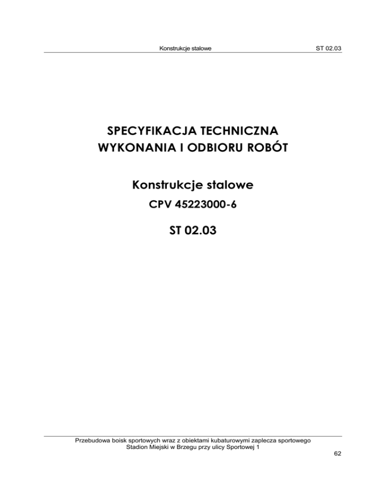 Konstrukcje stalowe ST 02.03 SPECYFIKACJA TECHNICZNA WYKONANIA I ODBIORU ROBÓT Konstrukcje stalowe CPV 45223000-6 ST 02.03 Przebudowa boisk sportowych wraz z obiektami kubaturowymi zaplecza sportowego Stadion Miejski w Brzegu przy ulicy Sportowej 1 62 Konstrukcje stalowe ST 02.03 1. WSTĘP 1.1 Przedmiot i zakres specyfikacji Niniejszy tom specyfikacji obejmuje wymagania dotyczące wykonania, montażu i odbioru konstrukcji stalowych dla zadania: „Przebudowa boisk sportowych wraz z obiektami kubaturowymi zaplecza sportowego”, Stadion Miejski w Brzegu, ul. Sportowa 1. Wykonawca jest odpowiedzialny za jakość wykonania oraz za zgodność z projektem i specyfikacją techniczną oraz poleceniami Inspektora nadzoru. 1.2 Określenia podstawowe Określenia podstawowe, użyte w niniejszej specyfikacji są zgodne z obowiązującymi odpowiednimi normami i określeniami zawartymi w ST 00.01 – Wymagania ogólne. 1.3 Klasyfikacja robót wg Wspólnego Słownika Zamówień (CPV) Grupy 45200000-9 Klasy Kategorie 45220000-5 45223000-6 Opis Roboty budowlane w zakresie wznoszenia kompletnych obiektów budowlanych lub ich części oraz roboty w zakresie inżynierii lądowej i wodnej Roboty inżynieryjne i budowlane Konstrukcje 2. WYMAGANIA DOTYCZĄCE WŁAŚCIWOŚCI WYROBÓW I MATERIAŁÓW Odpowiednie certyfikaty pochodzenia będą wymagane przez Inspektora nadzoru przy dokonywaniu odbioru wykonanych robót. Materiałami stosowanymi przy wykonaniu robót będących przedmiotem niniejszej specyfikacji są: balustrady schodowe balustrady stalowe pochylni Balustrady systemowe z rur i kształtowników ze stali nierdzewnej Brama dwuskrzydłowa np. system NYLOFOR szerokość 3,40 m, wys. 2,03 m, kompletna, ze słupkami stalowymi z okuciami i zamkami ocynkowana z powłoką poliestrową RAL 6005 brama dwuskrzydłowa np. system NYLOFOR szerokość 4,0 m, kompletna, ze słupkami i okuciem, ocynkowana i z powłoką poliestrową dodatkowe słupki, zastrzały i poprzeczki z kształtowników stalowych ocynkowanych z powłoką poliestrową RAL 6005 drut - linka stalowa ocynkowana śr. 5 mm elementy konstrukcji zabezpieczone antykorozyjnie furtka jednoskrzydłowa np. system NYLOFOR, szerokość 100 cm, wys. 2,03 m, kompletna, ze słupkami stalowymi z okuciami i zamkiem, ocynkowana, z powłoką poliestrową Ral 6005 furtka jednoskrzydłowa np. z systemu NYLOFOR z przystosowaniem do szerokości 2,10 i wys. 2,03 m, ze słupkami stalowymi, kompletna, z okuciami i zamkiem ocynkowana z powloką poliestrową kolor Ral 6005 furtka jednoskrzydłowa z systemu np. NYLOFOR o wys. 2,03 m, kompletna, ze słupkami stalowymi, okuciem i zamkiem ocynkowana z powłoką poliestrową kolor RAL 6005 klamry włazowe konstrukcja stalowa bramki obrotowej pojedynczej, typ BR3-1, systemowa; cześć dolna przykręcana ze stali zwykłej, malowana fabrycznie proszkowo, cześć obrotowa ze stali nierdzewnej konstrukcja stalowa szkieletu osłony śmietnika wykonana z kształtowników stalowych zimnogiętych i blach, malowanych farbą podkładową lub alternatywnie ocynkowanych ogniowo konstrukcje stalowe ramy i balustrady arkad, wykonane z kształtowników stalowych i rur, ocynkowane ogniowo Przebudowa boisk sportowych wraz z obiektami kubaturowymi zaplecza sportowego Stadion Miejski w Brzegu przy ulicy Sportowej 1 63 Konstrukcje stalowe ST 02.03 kratki Mostostal ocynkowane typ KWO o oczkach 30*30, płaskownik nośny 40/2 mm, płaskownik poprzeczny 10/2 mm, o wym. kratek (110,5 i 104,5)*141 cm kratki Mostostal ocynkowane typ KWO o oczkach 30*30, płaskownik nośny 40/2 mm, płaskownik poprzeczny 10/2 mm, o wym. kratki 96,5 *141 cm Obramienia z kątownika 75x75x3 mm ze stali nierdzewnej panele ogrodzenia z siatki np. systemu NYLOFOR F, ocynkowane z powłoką poliestrową Kolor RAL 6005 o zmiennej długości i wys. 2,23 m panele systemowe wypełniające na zwieńczeniu arkady, np. panel aluminiowy kompozytowy typ GARSON, gr. 4 mm, faktura szczotkowana, anodowana przęsła ogrodzenia z siatki np. systemu NYLOFOR, o zmiennej długości (nietypowe) i wys. 2,03 ruszty stalowe słupki stalowe z kształtowników zamkniętych 70*70*5 mm L-4,70 m kompletne, z uchwytami, ocynkowane i pomalowane farbą poliestrową w kolorze RAL słupki z kształtowników stal zamkn. ocynkowanych powłoką poliestrową 60*60*1,5 m L-2,60 stalowe słupy bramy wejściowej z kształtowników stalowych i blach, oczyszczone i pomalowane farbą antykorozyjną Wycieraczka do obuwia systemowa 2x 60/45 cm Wycieraczki do obuwia o wym. 45*60 cm typowe z kształtowników ocynkowanych Własności mechaniczne i technologiczne stali Do wytwarzania stalowych konstrukcji należy używać stal zgodnie z PN-90/B-03200. Inne gatunki stali (np. pochodzące z importu) mogą być zastosowane przez Wytwórcę za zgodą Inspektora nadzoru, jeśli posiadają : aprobaty techniczne ITB dopuszczające materiał do stosowania w budownictwie Certyfikat lub Deklaracje Zgodności z Aprobatą Techniczną lub PN Certyfikat zgodności ze zharmonizowaną norma europejską wprowadzona do zbioru norm polskich Na opakowaniach powinien znajdować się termin przydatności do stosowania Stal dostarczana na budowę powinna: mieć trwałe ocechowania dokonane przez Komisarza Odbiorczego MTiMG; mieć wybite znaki cechowania, oznaczenia cechowania kolorowego, spełniać wymagania określone w normach przedmiotowych: - dla blach uniwersalnych i grubych wg PN-EN 10163-1:1999 - dla blach żeberkowych wg PN-73/H-92127 - dla walcówki, prętów i kształtowników wg PN-EN 10016-2:1999/Ap1:2003 - dla kątowników równoramiennych wg, PN-EN 10056-1:2000 i PN-EN 10056-2:1998 - dla ceowników, wg PN-EN 10162:2005 Składowanie konstrukcji na placu budowy Obowiązkiem Wykonawcy montażu jest przygotowanie placu składowego konstrukcji i udostępnienie go Wytwórcy, by mógł dokonać rozładunku dostarczonej konstrukcji i usunąć ew. uszkodzenia powstałe w transporcie. Konstrukcję na placu budowy należy układać zgodnie z projek