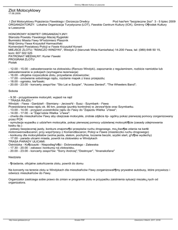 Gminny O¶rodek Kultury w Lasecznie Zlot Motocyklowy 17.06.2009. I Zlot Motocyklowy Pojezierza I³awskiego i Dorzecza Drwêcy Pod has³em "bezpieczne 2oo" 3 - 5 lipiec 2009 ORGANIZATORZY: Lokalna Organizacja Turystyczna (LOT), I³awskie Centrum Kultury (ICK), Gminny O¶rodek Kultury w Lasecznie HONOROWY KOMITET ORGANIZACYJNY: Starosta Powiatu I³awskiego Maciej Rygielski Burmistrz Miasta I³awy W³odzimierz Ptasznik Wójt Gminy I³awa Krzysztof Harmaciñski Komendant Powiatowy Policji w I³awie Krzysztof Konert MIEJSCE ZLOTU: "RANCZO WINDYKI", Windyki 2 (kierunek Wola Kamieñska) 14-200 I³awa, tel: (089) 648 50 15, kom: 607 502 525 PATRONAT MEDIALNY: Kurier I³awski PROGRAM ZLOTU Pi±tek - 12.00 - 15.00 - zakwaterowanie na zlotowisku (Ranczo Windyki), zapoznanie z regulaminem, rozbicie namiotów lub zakwaterowanie w pokojach (wymagana rezerwacja) - 16.00 - oficjalne rozpoczêcie zlotu, przywitanie zlotowiczów; - 17.00 - omówienie sobotniego rajdu, rozdanie mapek z tras± przejazdu; - 18.00 - ognisko, kie³baski; - 20.00 - 23.00 - koncerty zespo³ów: "Sto Lat w Szopie", "Access Denied", "The Wheelers Band"; Sobota - 9.30 - przygotowanie motocykli, wyjazd na rajd * TRASA RAJDU * Windyki - I³awa - Gardzieñ - Siemiany - Jerzwa³d - Susz - Szymbark - I³awa Przewidziana trasa rajdu ok. 80 km, postoje (punkty kontrolne) w Jerzwa³dzie oraz Szymbarku. - 13.00 - 14.00 - przyjazd uczestników rajdu do I³awy do "Zajazdu Wielka ¯u³awa"; - 14.00 - 17.00 - w "Zaje¼dzie Wielka ¯u³awa": - chwila dla mieszkañców I³awy aby obejrzeæ motocykle, zrobiæ zdjêcia itp- ogólny pokaz pierwszej pomocy zorganizowany przez PCK - symulacja wypadku z udzia³em motocykla, pokaz pierwszej pomocy udzielanej motocykli¶cie (zasady zdejmowania kasku itp.) - pokazy bezpiecznej jazdy, konkurs znajomo¶ci przepisów ruchu drogowego, mo¿liwo¶æ zdania na kartê motorowerowš przy wspó³pracy z Komendš Policji w I³awie (miasteczko ruchu drogowego) - konkursy dla motocyklistów (wolna jazda, slalom, pochylnia, toczenie beczki, szybki start, g³o¶ne wydechy) - 17.00 - parada ulicami miasta, powrót na zlotowisko w Windykach TRASA PARADY ULICAMI: Ostródzka - Ko¶ciuszki - Niepodleg³o¶ci - D±browskiego - Zalewska - 17.30 - 20.00 - zabawa i konkursy na zlotowisku, - 20.00 - 23.00 - koncerty zespo³ów: "Sorry Andrzej","Destroyer", "Ananakofana" Niedziela - ¶niadanie, oficjalne zakoñczenie zlotu, powrót do domu Na koncerty na terenie zlotu w Windykach dla mieszkañców I³awy zorganizowali¶my prywatne autobusy, które przywioz± i odwioz± mieszkañców do I³awy. Organizator zastrzega sobie prawo do zmian w programie zlotu w przypadku zaistnienia sytuacji niezale¿nych od organizatora. http://www.goklaseczno.pl Kreator PDF Utworzono 3 March, 2017, 23:50