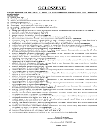 OGŁOSZENIE Uprzejmie zawiadamiam, że w dniu 27.01.2017 r. o godzinie 10.00 w Ratuszu odbędzie się sesja Rady Miejskiej Brzegu z następującym porządkiem obrad: Porządek obrad: 1) Otwarcie obrad sesji. 2) Wnioski do porządku obrad. 3) Przyjęcie protokołów z sesji Rady Miejskiej z dnia 25.11.2016 i 16.12.2016 r. 4) Interpelacje i wnioski radnych. 5) Sprawozdanie Burmistrza z bieżącej działalności. 6) Sprawozdanie z realizacji planu pracy Rady Miejskiej za rok 2016. 7) Sprawozdania z realizacji planów pracy Komisji Stałych Rady za rok 2016. 8) Przyjęcie uchwał w sprawie: a) zmian w budżecie Gminy Brzeg na 2017r. oraz zmiany uchwały w sprawie uchwalenia budżetu Gminy Brzeg na 2017 rok (druk nr 1), b) uchwalenia wieloletniej prognozy finansowej (druk nr 2), c) przekazania środków finansowych dla Policji (druk nr 3), d) sposobu sprawienia pogrzebu przez Gminę Brzeg (druk nr 4), e) Regulaminu dostarczania wody i odprowadzania ścieków na terenie Gminy Brzeg (druk nr 5), f) zbycia nieruchomości stanowiącej własność Gminy Brzeg położonej w Brzegu przy ul. Wolności 14 (druk nr 6), g) przystąpienia Gminy Brzeg do projektu: „Aktywny Kreatywny Maluch – program wsparcia przedszkoli na terenie Gminy Brzeg” i zabezpieczenia środków finansowych, jako wkładu własnego Gminy Brzeg na realizację projektu (druk nr 7), h) ustalenia opłat za korzystanie z wychowania przedszkolnego w przedszkolach prowadzonych przez Gminę Brzeg (druk nr 8), i) projektu dostosowania sieci szkół podstawowych i gimnazjów na terenie Gminy Brzeg do nowego ustroju szkolnego (druk nr 9), j) uchylenia Uchwały Nr XVI/120/03 Rady Miejskiej Brzegu z dnia 24.10.2003r. w sprawie ustalenia zasad odpłatności za korzystanie z wyżywienia przez pracowników przedszkoli publicznych w Brzegu (druk nr 10), k) udzielenia Wspólnocie Mieszkaniowej Plac Młynów 8 w Brzegu dotacji na prace konserwatorskie, restauratorskie lub roboty budowlane przy zabytku wpisanym do rejestru zabytków (druk nr 11), l) udzielenia Wspólnocie Mieszkaniowej Plac Zamkowy 6 w Brzegu dotacji na prace konserwatorskie, restauratorskie i roboty budowlane przy zabytku wpisanym do rejestru zabytków (druk nr 12), m) udzielenia Parafii Rzymsko – Katolickiej p.w. Świętego Mikołaja w Brzegu, dotacji na prace konserwatorskie, restauratorskie i roboty budowlane przy zabytku wpisanym do rejestru zabytków (druk nr 13), n) udzielenia Wspólnocie Mieszkaniowej Rybacka 13 w Brzegu dotacji na prace konserwatorskie, restauratorskie i roboty budowlane przy zabytku wpisanym do rejestru zabytków (druk nr 14), o) udzielenia Wspólnocie Mieszkaniowej Jabłkowa 6 w Brzegu, dotacji na prace konserwatorskie, restauratorskie i roboty budowlane przy zabytku wpisanym do rejestru zabytków (druk nr 15), p) udzielenia Wspólnocie Mieszkaniowej Krzyszowica 5 w Brzegu, dotacji na prace konserwatorskie, restauratorskie i roboty budowlane przy zabytku wpisanym do rejestru zabytków (druk nr 16), q) udzielenia Wspólnocie Mieszkaniowej Plac Zamkowy 4 w Brzegu dotacji na prace konserwatorskie, restauratorskie i roboty budowlane przy zabytku wpisanym do rejestru zabytków (druk nr 17), r) udzielenia Spółdzielni Rzemieślniczej „PIAST” z siedzibą w Brzegu, Plac Zamkowy 5, dotacji na roboty budowlane przy zabytku wpisanym do rejestru zabytków (druk nr 18), s) udzielenia Wspólnocie Mieszkaniowej Szkolna 36 w Brzegu dotacji na prace konserwatorskie, restauratorskie lub roboty budowlane przy zabytku wpisanym do rejestru zabytków (druk nr 19), t) udzielenia Wspólnocie Mieszkaniowej Staromiejska 11 w Brzegu dotacji na prace konserwatorskie, restauratorskie i roboty budowlane przy zabytku wpisanym do rejestru zabytków (druk nr 20), u) udzielenia Wspólnocie Mieszkaniowej Chrobrego 11 w Brzegu, dotacji na prace konserwatorskie, restauratorskie i roboty budowlane przy zabytku wpisanym do rejestru zabytków (druk nr 21), v) udzielenia Wspólnocie Mieszkaniowej Jana Pawła II 11 w Brzegu w Brzegu, dotacji na prace konserwatorskie, restauratorskie i roboty budowlane przy zabytku wpisanym do rejestru zabytków (druk nr 22), w) wyrażenia zgody na zawarcie kolejnych umów najmu nieruchomości stanowiących własność Gminy Brzeg oraz na odstąpienie od obowiązku przetargowego trybu zawarcia umów (druk nr 23), x) wyrażenia zgody na zawarcie kolejnej umowy dzierżawy nieruchomości stanowiącej własność Gminy Brzeg oraz na odstąpienie od obowiązku przetargowego trybu zawarcia umowy (druk nr 24), y) wyrażenia zgody na zawarcie kolejnych umów dzierżaw nieruchomości stanowiących własność Gminy Brzeg oraz na odstąpienie od obowiązku przetargowego trybu zawarcia umów (druk nr 25), z) wyrażenia zgody na zawarcie kolejnych umów dzierżaw nieruchomości stanowiących własność Gminy oraz na odstąpienie od obowiązku przetargowego trybu zawarcia umów (druk nr 26), aa) wyrażenia zgody na zawarcie kolejnych umów dzierżaw nieruchomości stanowiących własność Gminy Brzeg oraz na odstąpienie od obowiązku przetargowego trybu zawarcia umów (druk nr 27), bb) wyrażenia zgody na zawarcie kolejnej umowy dzierżawy nieruchomości stanowiącej własność Gminy Brzeg oraz na odstąpienie od obowiązku przetargowego trybu zawarcia umowy (druk nr 28), cc) opinii dotyczącej rozłożenia na raty wierzytelności Gminy Brzeg (druk nr 29), dd) opinii dotyczącej rozłożenia na raty wierzytelności Gminy Brzeg (druk nr 30), ee) opinii dotyczącej częściowego umorzenia i rozłożenia na raty wierzytelności Gminy Brzeg (druk nr 31), Serdecznie zapraszam mieszkańców miasta do wzięcia udziału Przewodnicząca Rady Miejskiej Brzegu Barbara Mrowiec