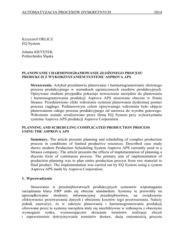 AUTOMATYZACJA PROCESÓW DYSKRETNYCH 2014 Krzysztof ORLICZ EQ System Jolanta KRYSTEK Politechnika Śląska PLANOWANIE I HARMONOGRAMOWANIE ZŁOŻONEGO PROCESU PRODUKCJI Z WYKORZYSTANIEM SYSTEMU ASPROVA APS Streszczenie. Artykuł przedstawia planowanie i harmonogramowanie złożonego procesu produkcyjnego w warunkach ograniczonych zasobów produkcyjnych. Opisywane studium przypadku pokazuje nowoczesne narzędzie do planowania i harmonogramowania produkcji Asprova APS stosowane obecnie w firmie Strauss. Przedstawiono efekt wdrożenia systemu planowania dyskretnej postaci procesu ciągłego. Podstawowym celem opisywanego wdrożenia było objęcie planowaniem całego procesu produkcyjnego od surowca do wyrobu gotowego. Wdrożenie zostało zrealizowane przez firmę EQ System przy wykorzystaniu systemu Asprova APS produkcji Asprova Corporation. PLANNING AND SCHEDULING COMPLICATED PRODUCTION PROCESS USING THE ASPROVA APS Summary. The article presents planning and scheduling of complex production process in conditions of limited productive resources. Described case study shows modern Production Scheduling System Asprova APS currently used in a Strauss company. The article presents the effects of implementation of planning a discrete form of continuous process. The primary aim of implementation of production planning was to plan entire production process from raw material to final product. The implementation was carried out by EQ System using a system Asprova APS made by Asprova Corporation. 1. Wprowadzenie Stosowanie w przedsiębiorstwach produkcyjnych systemów wspomagania zarządzania klasy ERP stało się obecnie standardem. Systemy te pozwoliły na uporządkowanie struktury informacyjnej przedsiębiorstwa, na zwiększenie efektywności przetwarzania danych i obniżenie kosztów tego przetwarzania. Należy jednak zauważyć, że w zakresie planowania i harmonogramowania produkcji oferowane przez te systemy narzędzia stały się nieefektywne w zetknięciu z obecnymi wymogami rynku, wymuszającymi skracanie terminów realizacji zleceń i zapewnieniem dotrzymywania terminów dostaw, dużą zmiennością procesu 170 K. Orlicz, J. Krystek produkcji, oraz elastycznym dostosowaniu się do zmieniających się potrzeb klientów. W takiej sytuacji mogą wystąpić problemy przy wyznaczaniu optymalnych planów produkcyjnych, opartych na prognozach popytu i zamówieniach klienta. Pojawiła się potrzeba zastosowania nowych metod planowania i harmonogramowania produkcji a co za tym idzie stosowania narzędzi APS (ang. Advanced Planning and Scheduling). Narzędzia APS wykorzystywane są w warstwie planowania wykonawczego. Służą do przetworzenia planu produkcyjnego przedsiębiorstwa w szczegółowy harmonogram tak aby plan ten mógł być jak najlepiej wykonany. Podają więc odpowiedź na pytania co, gdzie, kiedy, ile, czym i jak ma być wykonywane (który zasób co powinien wykonać, w jaki sposób, przy pomocy jakich narzędzi i kiedy). Narzędzia APS dają możliwość planowania i harmonogramowania produkcji z uwzględnieniem ograniczeń materiałowych, zasobowych oraz logistycznych. Podstawową cechą narzędzi APS jest to, że opierają się rzeczywistych i aktualnych danych a nie wartościach średnich i zgrubnych oszacowaniach. Reakcja na wypadki losowe w systemie produkcyjnym (awarie, spóźnienie dostaw, anulowanie zleceń) może być natychmiastowa a korekty harmonogramu dokonywane są w czasie rzeczywistym bez zagrożenia wprowadzenia dodatkowych zakłóceń w proces wytwarzania. Narzędzia APS wyposażane są również funkcje symulacji, analiz ”cojeśli” i przewidywania stanu systemu produkcyjnego – przydatne np. przy sprawdzaniu możliwości wykonania dodatkowych zleceń czy rozpatrywaniu różnych strategii produkcji. Harmonogramowanie produkcji można zdefiniować jako zadanie wyznaczenia takiego rozdziału w czasie dostępnych zasobów produkcyjnych, który zapewni zaspokojenie zapotrzebowania na produkowane wyroby przy najlepszym ich wykorzystaniu. Niezbędna jest szczegółowa znajomości struktury informacyjnej procesu produkcyjnego oraz szybka reakcja na zmiany występujące w systemie produkcyjnym (popyt, awarie) przy zachowaniu możliwego do realizacji harmonogramu produkcyjnego. Większość producentów nie jest w stanie szybciej reagować na rosnące potrzeby klientów oraz na obniżkę kosztów produkcji, dopóki nie zastosuje odpowiedniej metodyki harmonogramowania. Musi ona uwzględniać wszystkie ograniczenia w procesie produkcji oraz integrować proces harmonogramowania z funkcjonalnością procesu produkcyjnego [4]. Firma Strauss Firma Strauss Cafe Poland sp. z o. o. jest znajdującym się w czołówce palarni kawy w Polsce producentem, który wytwarza rocznie 20 000 ton kawy, sprzedając ją pod różnymi markami. Zakład produkcyjny zlokalizowany w miejscowości Tarnowo Podgórne-Swadzim k. Poznania, to podmiot należący do międzynarodowej Grupy Strauss, wyspecjalizowanej w produkcji kawy ziarnistej, mielonej i rozpuszczalnej. Wiodącą marką Strauss Cafe Poland jest MK CAFE, oraz cała gama marek własnych skierowanych do różnych segmentów rynku. Procesy logistyczne realizowane w firmie obejmują zarówno bezpośredni import zielonej kawy wraz z jej zamorskim transportem, jak i zakupy uzupełniające na europejskich giełdach towarowych surowców i elementów pomocniczych takich jak np. opakowania. Klienci firmy, w tym wielkopowierzchniowe sieci handlowe, Planowanie i harmonogramowanie złożonego procesu … 171 wymagają krótkich lub bardzo krótkich terminów realizacji zamówień z czasem realizacji zbliżonym lub tylko nieco dłuższym niż cykl produkcyjny, który średnio wynosi kilka dni. Przekłada się to na dużą zmienność przebiegu procesów logistycznych i produkcyjnych i znaczący poziom niestabilności portfela zamówień. Realizowany proces produkcji kawy obejmuje kilka procesów technologicznych, począwszy od określenia proporcji mies