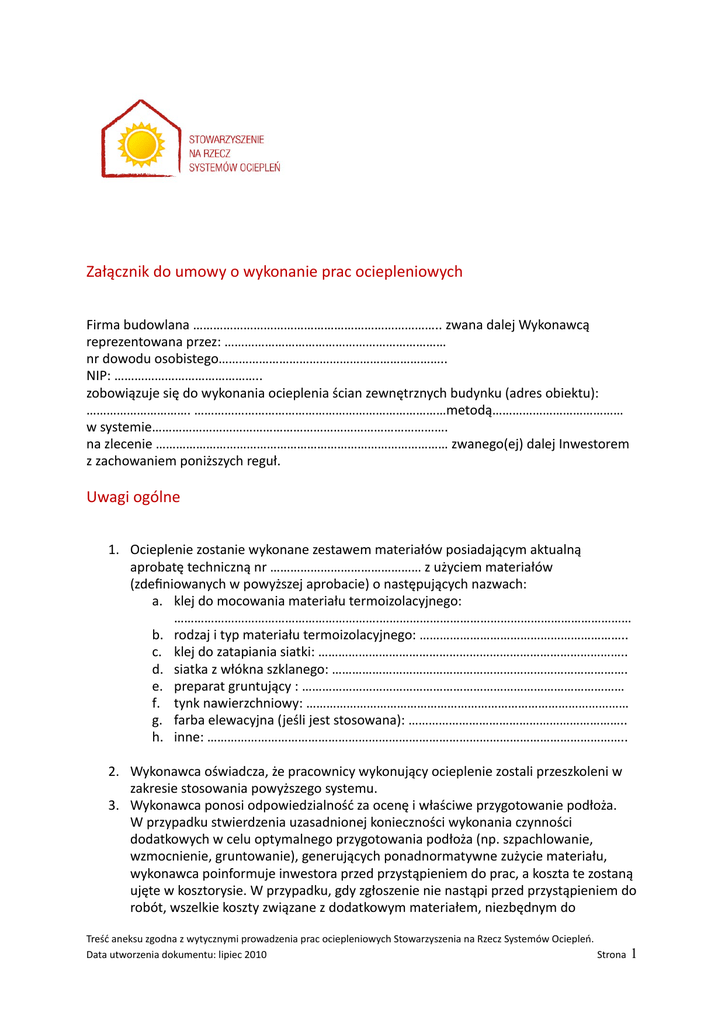 Załącznik do umowy o wykonanie prac ociepleniowych Firma budowlana ……………………………………………………………….. zwana dalej Wykonawcą reprezentowana przez: ………………………………………………………… nr dowodu osobistego………………………………………………………….. NIP: …………………………………….. zobowiązuje się do wykonania ocieplenia ścian zewnętrznych budynku (adres obiektu): …………………………. …………………………………………………………………metodą………………………………… w systemie……………………………………………………………………………. na zlecenie …………………………………………………………………………… zwanego(ej) dalej Inwestorem z zachowaniem poniższych reguł. Uwagi ogólne 1. Ocieplenie zostanie wykonane zestawem materiałów posiadającym aktualną aprobatę techniczną nr ……………………………………… z użyciem materiałów (zdefiniowanych w powyższej aprobacie) o następujących nazwach: a. klej do mocowania materiału termoizolacyjnego: …………………………………………………….………………………………………………………………… b. rodzaj i typ materiału termoizolacyjnego: …………………………………………………….. c. klej do zatapiania siatki: ……………………………………………………………………………….. d. siatka z włókna szklanego: ……………………………………………………………………………. e. preparat gruntujący : …………………………………………………………………………………… f. tynk nawierzchniowy: …………………………………………………………………………………… g. farba elewacyjna ( jeśli jest stosowana): ……………………………………………………….. h. inne: …………………………………………………………………………………………………………….. 2. Wykonawca oświadcza, że pracownicy wykonujący ocieplenie zostali przeszkoleni w zakresie stosowania powyższego systemu. 3. Wykonawca ponosi odpowiedzialność za ocenę i właściwe przygotowanie podłoża. W przypadku stwierdzenia uzasadnionej konieczności wykonania czynności dodatkowych w celu optymalnego przygotowania podłoża (np. szpachlowanie, wzmocnienie, gruntowanie), generujących ponadnormatywne zużycie materiału, wykonawca poinformuje inwestora przed przystąpieniem do prac, a koszta te zostaną ujęte w kosztorysie. W przypadku, gdy zgłoszenie nie nastąpi przed przystąpieniem do robót, wszelkie koszty związane z dodatkowym materiałem, niezbędnym do Treść aneksu zgodna z wytycznymi prowadzenia prac ociepleniowych Stowarzyszenia na Rzecz Systemów Ociepleń. Data utworzenia dokumentu: lipiec 2010 Strona 1 prawidłowego przygotowania podłoża i prowadzenia dalszych etapów prac w zgodzie z wytycznymi wykonawstwa, ponosi Wykonawca. Ponadnormatywne zużycie materiału na właściwie przygotowanym podłożu, przy przestrzeganiu wszystkich zaleceń producenta, pozostaje przedmiotem roszczeń wykonawcy w stosunku do producenta. Kolejne etapy prac: 1. Za pomocą łączników mechanicznych i w razie nierówności podkładek poziomujących zostaną zamontowane listwy cokołowe: a. właściwie wypoziomowane b. pomiędzy listwami zostanie zachowana odległość ok. 1 mm umożliwiająca ruchy termiczne listwy (zaleca się dodać łączniki międzylistwowe) Odbiór etapu nastąpi poprzez oględziny zewnętrzne 2. Płyty termoizolacyjne zostaną przyklejone do ściany jedną z dwóch poniższych metod (zaznaczyć wybrane pole): „obwodowo-‐punktową” całopowierzchniową Odbiór tego etapu nastąpi po przerwie technologicznej (określonej w kartach technicznych producenta systemu) , poprzez ucisk (kciukiem lub dłonią) wybranych miejsc, ze szczególnym uwzględnieniem narożników płyt. W przypadku wątpliwości, czy płyty zostały przyklejone zgodnie z pkt.2 Wykonawca wykona odkrywkę (zdjęcie całej płyty termoizolacyjnej) w miejscu wskazanym przez inwestora. 3. Dodatkowe mocowanie płyt termoizolacyjnych z użyciem łączników mechanicznych nastąpi po przerwie technologicznej (zgodnie z okresem przewidzianym przez systemodawcę). W zależności od rodzaju materiału termoizolacyjnego łączniki posiadać będą trzpień stalowym lub tworzywowym. a. Mocowanie przy pomocy łączników mechanicznych posiadających aprobatę techniczną nr…………………………………….. będzie wykonane w następujący sposób: w podwyższonym standardzie: łączniki będą zagłębione w otworach a następnie zadeklowane krążkiem z materiału termoizolacyjnego (tzw. termodyble) metodą zwykłą: talerzyki łączników zlicowane z płaszczyzną elewacji 1) łączniki nie są wymagane Odbiór etapu nastąpi poprzez oględziny zewnętrzne 4. Wszystkie szczeliny pomiędzy płytami zostaną wypełnione: przeznaczoną do tego niskorozprężną pianką PU paskami materiału zastosowanego do termoizolacji Odbiór etapu nastąpi poprzez oględziny zewnętrzne 5. Nierówności powierzchni przyklejonych płyt termoizolacyjnych zostaną zniwelowane przez szlifowanie Treść aneksu zgodna z wytycznymi prowadzenia prac ociepleniowych Stowarzyszenia na Rzecz Systemów Ociepleń. Data utworzenia dokumentu: lipiec 2010 Strona 2 6. Przed wykonaniem warstwy zbrojącej wszystkie narożniki otworów zostaną zazbrojone paskami siatki (wymienionej w pkt. 1 Uwag Ogólnych) o wymiarach min. 25x35 cm, wklejanymi pod kątem 45º Odbiór etapu nastąpi poprzez oględziny zewnętrzne 7. Ocieplenie ościeży okien i drzwi zostanie wykonane: z zastosowaniem profili przyokiennych lub taśm rozprężnych bez wyżej wymienionych elementów Odbiór et
