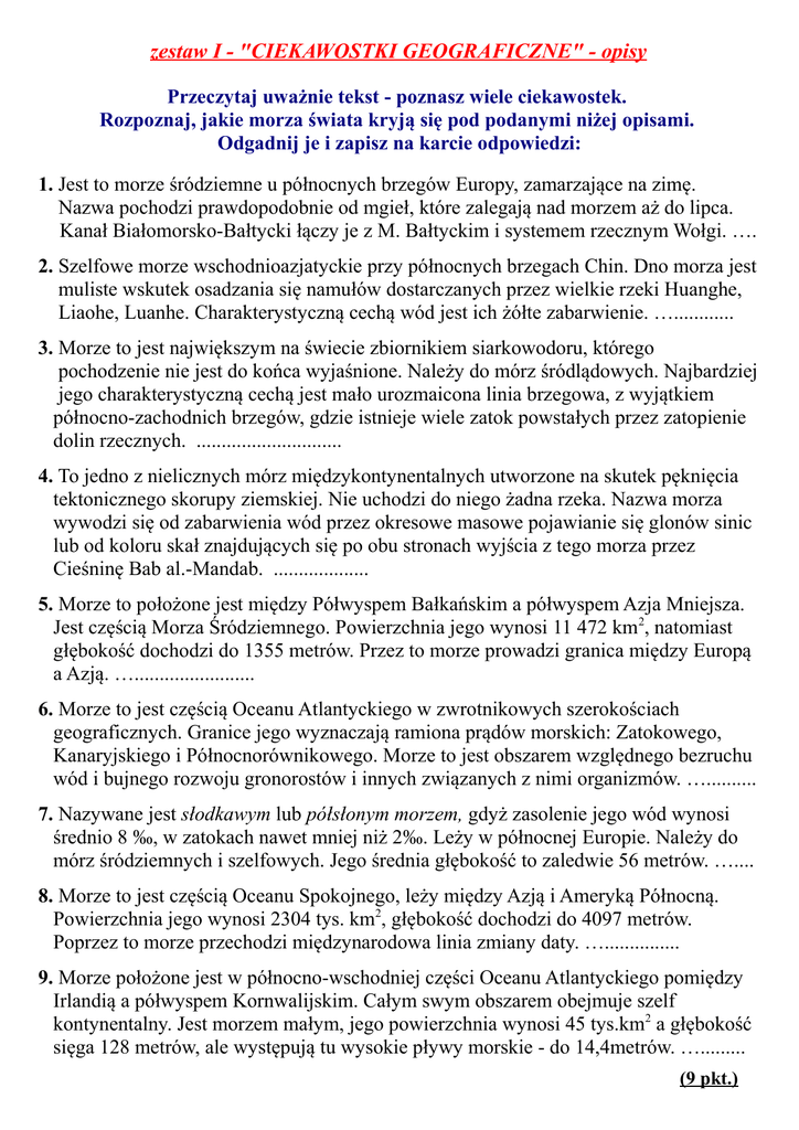 zestaw I - "CIEKAWOSTKI GEOGRAFICZNE" - opisy Przeczytaj uważnie tekst - poznasz wiele ciekawostek. Rozpoznaj, jakie morza świata kryją się pod podanymi niżej opisami. Odgadnij je i zapisz na karcie odpowiedzi: 1. Jest to morze śródziemne u północnych brzegów Europy, zamarzające na zimę. Nazwa pochodzi prawdopodobnie od mgieł, które zalegają nad morzem aż do lipca. Kanał Białomorsko-Bałtycki łączy je z M. Bałtyckim i systemem rzecznym Wołgi. …. 2. Szelfowe morze wschodnioazjatyckie przy północnych brzegach Chin. Dno morza jest muliste wskutek osadzania się namułów dostarczanych przez wielkie rzeki Huanghe, Liaohe, Luanhe. Charakterystyczną cechą wód jest ich żółte zabarwienie. …............ 3. Morze to jest największym na świecie zbiornikiem siarkowodoru, którego pochodzenie nie jest do końca wyjaśnione. Należy do mórz śródlądowych. Najbardziej jego charakterystyczną cechą jest mało urozmaicona linia brzegowa, z wyjątkiem północno-zachodnich brzegów, gdzie istnieje wiele zatok powstałych przez zatopienie dolin rzecznych. ............................. 4. To jedno z nielicznych mórz międzykontynentalnych utworzone na skutek pęknięcia tektonicznego skorupy ziemskiej. Nie uchodzi do niego żadna rzeka. Nazwa morza wywodzi się od zabarwienia wód przez okresowe masowe pojawianie się glonów sinic lub od koloru skał znajdujących się po obu stronach wyjścia z tego morza przez Cieśninę Bab al.-Mandab. ................... 5. Morze to położone jest między Półwyspem Bałkańskim a półwyspem Azja Mniejsza. Jest częścią Morza Śródziemnego. Powierzchnia jego wynosi 11 472 km2, natomiast głębokość dochodzi do 1355 metrów. Przez to morze prowadzi granica między Europą a Azją. …........................ 6. Morze to jest częścią Oceanu Atlantyckiego w zwrotnikowych szerokościach geograficznych. Granice jego wyznaczają ramiona prądów morskich: Zatokowego, Kanaryjskiego i Północnorównikowego. Morze to jest obszarem względnego bezruchu wód i bujnego rozwoju gronorostów i innych związanych z nimi organizmów. ….......... 7. Nazywane jest słodkawym lub półsłonym morzem, gdyż zasolenie jego wód wynosi średnio 8 ‰, w zatokach nawet mniej niż 2‰. Leży w północnej Europie. Należy do mórz śródziemnych i szelfowych. Jego średnia głębokość to zaledwie 56 metrów. ….... 8. Morze to jest częścią Oceanu Spokojnego, leży między Azją i Ameryką Północną. Powierzchnia jego wynosi 2304 tys. km2, głębokość dochodzi do 4097 metrów. Poprzez to morze przechodzi międzynarodowa linia zmiany daty. …............... 9. Morze położone jest w północno-wschodniej części Oceanu Atlantyckiego pomiędzy Irlandią a półwyspem Kornwalijskim. Całym swym obszarem obejmuje szelf kontynentalny. Jest morzem małym, jego powierzchnia wynosi 45 tys.km2 a głębokość sięga 128 metrów, ale występują tu wysokie pływy morskie - do 14,4metrów. …......... (9 pkt.) zestaw II – "REKORDY GEOGRAFICZNE" – morza i oceany 1. Największy, najgłębszy i najpotężniejszy ocean świata – podaj jego dwie nazwy. 2. Najmłodszy ocean świata, który jest jednocześnie najdłuższym oceanem świata (21 300 km). 3. Jedyne morze świata na otwartym oceanie, bez granic brzegów lądowych. 4. Morze o największej powierzchni (5 726 mln km2 ) i największej średniej głębokości (4 108 m). 5. Najpłytsze morze świata, jego średnia głębokość wynosi zaledwie 7 metrów a maksymalna tylko 13 metrów. 6. Największe śródlądowe morze międzykontynentalne o powierzchni około 2,5mln km2. 7. Najmniejsze morze świata o powierzchni 12 tys. km2. 8. Najbardziej zasolone morze świata (do 42 ‰). 9. Morze, nad którym położony jest największy port towarowy świata (ok.525 mln ton towarów) – podaj nazwę morza i portu morskiego. 10. Akwen morski nazywany zatoką, ale ze względu na powierzchnię (około 240 tys. km2) uznawany za morze śródlądowe. Pod jego dnem oraz w rejonach nadbrzeżnych znajdują się największe na świecie złoża ropy naftowej. 11. Ocean posiadający największe zlewisko na świecie (51,6% powierzchni lądowej). 12. Morze, nad którym położonych jest najwięcej państw świata. (14 pkt. - po 1 pkt. za każdą prawidłową odpowiedź) …............................................................................................................................................................................... zestaw III - "CZY ZNASZ MAPĘ ŚWIATA?" A. Rozpoznaj oceany i morza: Na rysunkach widzisz kontury 14 mórz (w tym jezior, które w nazwie mają słowo „morze”) i oceanów narysowanych w różnych skalach i w różnym położeniu. Spośród podanych nazw wybierz te, które rozpoznasz i zapisz w karcie odpowiedzi. I.O. Arktyczny VI. M. Czerwone II.M. Karaibskie VII. M. Azowskie X. M. Czarne XI. O. Indyjski III.M. Południowo-chińskie XII. O. Spokojny IV.M. Bałtyckie VIII. M. Kaspijskie XIII. M. Śródziemne V.M. Martwe IX. XIV. O. Atlantycki M. Północne (14 pkt. - po 1 pkt. za każdą prawidłową odpowiedź) B. Rozwiąż krzyżówkę dotyczącą znanych cieśnin świata. Litery w krzyżówce oznaczone cyframi utworzą nazwę dodatkowej cieśniny. Napisz, jakie obszary łączy ta cieśnina. POZIOMO: 5. Cieśnina między Półwyspem Jutlandzkim a Skandynawskim 6. Cieśnina między Azją a Ameryką Północną 7. Cieśnina między Półwyspem Malajskim a Sumatrą PIONOWO: 1. Cieśnina łącząca Morze Czarne z Morzem Marmara, leży nad nią miasto Stambuł 2. Cieśnina między Ameryką Południową a wyspami Ziemi Ognistej, bardzo niebezpieczna dla żeglugi 3. Cieśnina między Nową Gwineą a Półwyspem Jork w Australii, łączy Morze Arafura z Morzem Koralowym 4. Cieśnina łącząca Morze Egejskie z Morzem Marmara CIEŚNINA: 1 2 3 4 5 6 7 8 9 10 11 12 łączy ..................................................................................................