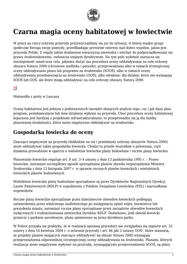 Czarna magia oceny habitatowej w łowiectwie W pracy na rzecz ochrony przyrody przyzwyczailiśmy się już do sytuacji, w której wąskie grupy społeczne forsują swoje pomysły, przedkładając prywatne interesy nad dobro wspólne, jakim jest przyroda Polski. Z reguły takim działaniom towarzyszą niewiedza i niechęć do podporządkowania się prawu środowiskowemu, zwłaszcza unijnym dyrektywom. Na tym polu wybitnie zaznacza się nieznajomość zasad oraz celu, jakiemu służyć ma procedura oceny oddziaływania na cele ochrony obszaru Natura 2000 (chronione siedliska i gatunki), przeprowadzana albo w ramach strategicznej oceny oddziaływania planu lub programu na środowisko (SOOŚ), albo w ramach oceny oddziaływania przedsięwzięcia na środowisko (OOŚ), albo odrębnie, dla działań, które nie wymagają SOOŚ lub OOŚ, ale które mogą oddziaływać na cele ochrony obszaru Natura 2000. Malowidło z groty w Lascaux Ocena habitatowa jest jednym z podstawowych narzędzi służących analizie tego, czy i jak dany plan, program, przedsięwzięcie lub inne działanie wpłynie na przyrodę. Choć procedura oceny habitatowej kojarzona jest bardziej z projektami infrastrukturalnymi, to przeprowadza się ją dla każdej planowanej działalności, która może negatywnie oddziaływać na środowisko. Gospodarka łowiecka do oceny Znacząco negatywnie na przyrodę (dokładnie na cel i przedmioty ochrony obszarów Natura 2000) może oddziaływać także gospodarka łowiecka. Chodzi tu przede wszystkim o polowania, czyli działania prowadzone w oparciu o wieloletnie łowieckie plany hodowlane i roczne plany łowieckie. Planowanie łowieckie reguluje art. 8 ust. 3–4 ustawy z dnia 13 października 1995 r. – Prawo łowieckie, natomiast szczegółowy sposób sporządzania planów określa rozporządzenie Ministra Środowiska z dnia 13 listopada 2007 r. w sprawie rocznych planów łowieckich i wieloletnich łowieckich planów hodowlanych. Wieloletnie łowieckie plany hodowlane sporządzane są przez Dyrektorów Regionalnych Dyrekcji Lasów Państwowych (RDLP) w uzgodnieniu z Polskim Związkiem Łowieckim (PZŁ) i marszałkami województw. Roczne plany łowieckie sporządzane przez dzierżawców obwodów łowieckich podlegają zatwierdzeniu przez właściwego nadleśniczego po zasięgnięciu opinii wójta, burmistrza lub prezydenta miasta, natomiast roczne plany sporządzane przez zarządców obwodów łowieckich wyłączonych z wydzierżawiania zatwierdza Dyrektor RDLP. Dodatkowo, jeśli obwód łowiecki graniczy z parkiem narodowym, plany opiniowane są przez dyrektora parku. W Polsce przyjęła się praktyka, że w realizacji opisanej procedury nie uwzględnia się zapisów art. 33 ustawy z dnia 16 kwietnia 2004 r. o ochronie przyrody i art. 46 pkt 3 ustawy OOŚ1, które stanowią, że projekty planów mogących znacząco oddziaływać na obszar Natura 2000 wymagają przeprowadzenia odpowiedniej (strategicznej) oceny oddziaływania na środowisko. Planami, których realizacja może negatywnie wpływać na przyrodę, wymagającymi przeprowadzenia SOOŚ, są plany Czarna magia oceny habitatowej w łowiectwie 1 łowieckie: wieloletni plan hodowlany oraz pełniące funkcję wykonawczą roczne plany łowieckie. Takie stanowisko Komisji Europejskiej oficjalnie przedstawiły władze Polski (sprawa EU-PILOT 1996/2011). Jak dotychczas jednak, w Polsce w praktyce nadal nie prowadzi się procedury SOOŚ dla planów łowieckich, co stoi w sprzeczności także z prawem wspólnotowym – art. 6(3) dyrektywy Rady 92/43/EWG z dnia 21 maja 1992 r. w sprawie ochrony siedlisk przyrodniczych oraz dzikiej fauny i flory (tzw. dyrektywa siedliskowa lub habitatowa). Brak SOOŚ dla planów stanowiących podstawę prowadzenia gospodarki łowieckiej stanowi istotny wyłom w systemie ocen oddziaływania na środowisko, tym bardziej, że dla gospodarki leśnej prowadzonej w oparciu o analogiczne dokumenty (plany urządzania lasu) procedura SOOŚ jest już standardem i mimo częstych zastrzeżeń co do jakości, pozwala przeciwdziałać działaniom, których skutki mogłyby być szkodliwe dla środowiska, a zwłaszcza dla siedlisk i gatunków chronionych w ramach sieci Natura 2000. Wstrzymać odstrzał Z uwagi na fakt, że ustalenia planów stanowiących podstawę prowadzenia odstrzałów wiążą się z potencjalnymi skutkami przyrodniczymi istotnymi dla celów ochrony obszarów Natura 2000, Stowarzyszenie Pracownia na rzecz Wszystkich Istot na podstawie art. 37 ustawy o ochronie przyrody skierowało do Regionalnych Dyrekcji Ochrony Środowiska w Białymstoku i Rzeszowie wnioski o wstrzymanie odstrzału zwierząt kopytnych (prowadzonych w ramach polowań i odstrzałów redukcyjnych, traktowanych jako zabiegi służące ochronie przyrody) do czasu zbadania ich wpływu na przyrodę obszarów Natura 2000 „Puszcza Białowieska” i „Ostoja Magurska”. Przepis art. 37 ustawy o ochronie przyrody stosuje się w sytuacjach, w których podjęte działania mogą znacząco negatywnie oddziaływać na obszar Natura 2000. Istotny dla sprawy jest fakt, że procedurę uruchamia już samo podejrzenie możliwości wystąpienia negatywnych oddziaływań, nie zaś dowód na ich wystąpienie w przeszłości. Zasadność tego zapisu wynika z unijnej zasady przezorności, która wymaga, aby wszelkie prawdopodobieństwo wystąpienia negatywnych skutków dla przyrody traktować jako pewność ich wystąpienia. Pracownia z istotnych powodów skorzystała z możliwości, jaką daje art. 37 ustawy o ochronie przyrody. Po pierwsze odstrzał zwierząt kopytnych ma bezpośredni wpływ na przyrodę obszarów Natura 2000, które stanowią cenne siedliska dużych drapieżników oraz miejsce występowania wielu chronionych siedlisk przyrodniczych i gatunków zwierząt. Implikacje dla ochrony wynikające z polowań nie dotyczą tylko bazy żerowej dużych drapieżników, ale rozciągają się m.in. na stan odnowienia lasu, jakość siedlisk chron