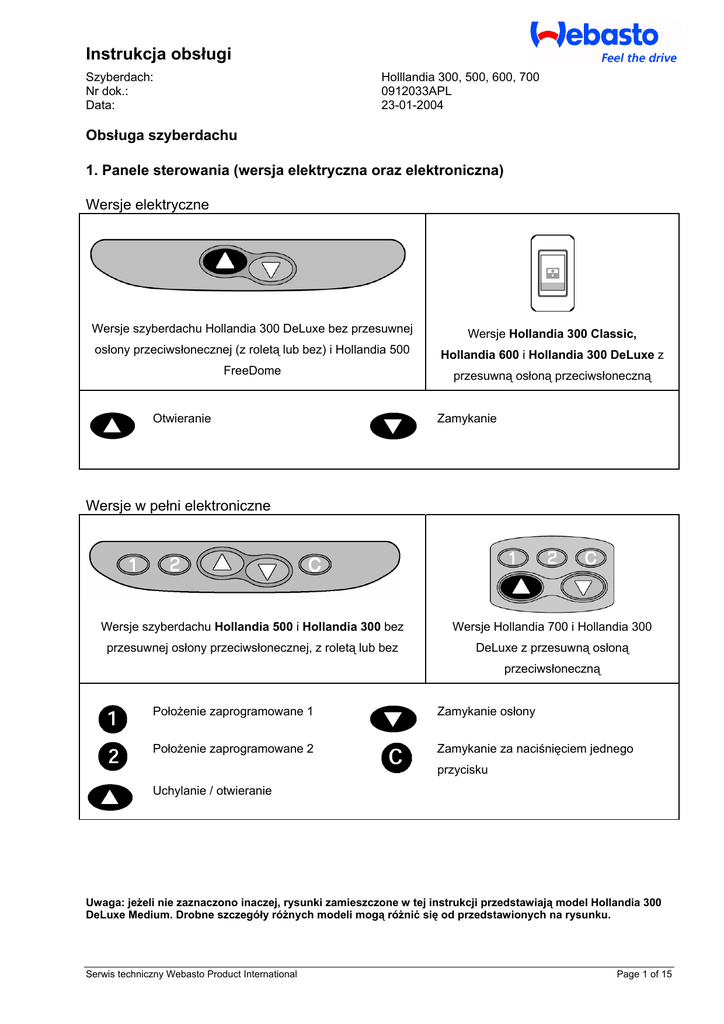 Instrukcja obsługi Szyberdach: Nr dok.: Data: Holllandia 300, 500, 600, 700 0912033APL 23-01-2004 Obsługa szyberdachu 1. Panele sterowania (wersja elektryczna oraz elektroniczna) Wersje elektryczne Wersje szyberdachu Hollandia 300 DeLuxe bez przesuwnej Wersje Hollandia 300 Classic, osłony przeciwsłonecznej (z roletą lub bez) i Hollandia 500 Hollandia 600 i Hollandia 300 DeLuxe z FreeDome przesuwną osłoną przeciwsłoneczną Otwieranie Zamykanie Wersje w pełni elektroniczne Wersje szyberdachu Hollandia 500 i Hollandia 300 bez Wersje Hollandia 700 i Hollandia 300 przesuwnej osłony przeciwsłonecznej, z roletą lub bez DeLuxe z przesuwną osłoną przeciwsłoneczną Położenie zaprogramowane 1 Zamykanie osłony Położenie zaprogramowane 2 Zamykanie za naciśnięciem jednego przycisku Uchylanie / otwieranie Uwaga: jeżeli nie zaznaczono inaczej, rysunki zamieszczone w tej instrukcji przedstawiają model Hollandia 300 DeLuxe Medium. Drobne szczegóły różnych modeli mogą różnić się od przedstawionych na rysunku. Serwis techniczny Webasto Product International Page 1 of 15 Instrukcja obsługi Szyberdach: Nr dok.: Data: Holllandia 300, 500, 600, 700 0912033APL 23-01-2004 2. Obsługa ręczna Otwieranie szyberdachu. Zamykanie szyberdachu. Serwis techniczny Webasto Product International Page 2 of 15 Instrukcja obsługi Szyberdach: Nr dok.: Data: 3. Holllandia 300, 500, 600, 700 0912033APL 23-01-2004 Obsługa wersji elektrycznych Włączyć zapłon. Otworzyć do pozycji maks. wychylonej. Nacisnąć przycisk otwierania, po czym zwolnić go, gdy szyberdach znajdzie się w pozycji maks. wychylonej. Otworzyć do pozycji maks. przesuniętej. Zamknąć do końca. Serwis techniczny Webasto Product International Page 3 of 15 Instrukcja obsługi Szyberdach: Nr dok.: Data: Holllandia 300, 500, 600, 700 0912033APL 23-01-2004 3. Obsługa wersji w pełni elektronicznych 3.1. Programowanie szyberdachu przed pierwszym użyciem Włączyć zapłon. Zamknąć szyberdach do końca, zwolnić przycisk, nacisnąć ponownie i przytrzymać przez co najmniej 5 sekund. Otworzyć szyberdach do końca (krótko nacisnąć przycisk U). W położeniu końcowym słyszane będzie kliknięcie. Jednostka sterująca szyberdachu została zaprogramowana. Serwis techniczny Webasto Product International Page 4 of 15 Instrukcja obsługi Szyberdach: Nr dok.: Data: Holllandia 300, 500, 600, 700 0912033APL 23-01-2004 3. 2. Otwieranie szyberdachu. Otwieranie szyberdachu w pozycji przesuniętej: Przy włączonym zapłonie nacisnąć krótko przycisk otwierania. Ponownie krótko nacisnąć przycisk, kiedy szyberdach osiągnął pożądane położenie. Otwieranie szyberdachu do pozycji maks. wychylonej: Przy włączonym zapłonie nacisnąć i przytrzymać przycisk otwierania, po czym zwolnić go, gdy szyberdach znajdzie się w pozycji maks. wychylonej. Przytrzymując przycisk otwierania można wybrać 4 różne położenia panelu. Po zwolnieniu przycisku szyberdach pozostaje w danym położeniu. Serwis techniczny Webasto Product International Page 5 of 15 Instrukcja obsługi Szyberdach: Nr dok.: Data: Holllandia 300, 500, 600, 700 0912033APL 23-01-2004 3.3. Zamykanie szyberdachu. Krótko nacisnąć przycisk V - panel zamknie się do końca. Ponowne krótkie naciśnięcie przycisku V spowoduje zatrzymanie panelu. Krótkie naciśnięcie przycisku © spowoduje zamknięcie panelu niezależnie od położenia. Serwis techniczny Webasto Product International Page 6 of 15 Instrukcja obsługi Szyberdach: Nr dok.: Data: Holllandia 300, 500, 600, 700 0912033APL 23-01-2004 3.4. Programowanie dwóch zapamiętywanych położeń Umieścić panel w pierwszym pożądanym położeniu i wcisnąć przycisk X na trzy sekundy, aby zapamiętać to położenie jako uruchamiane przyciskiem X. Krótki sygnał dźwiękowy potwierdzi zaprogramowanie. Umieścić panel w drugim pożądanym położeniu i wcisnąć przycisk Y na trzy sekundy, aby zapamiętać to położenie jako uruchamiane przyciskiem Y. Krótki sygnał dźwiękowy potwierdzi zaprogramowanie. Po naciśnięciu przycisku X lub Y panel otworzy się do zaprogramowanego położenia. W celu zaprogramowania nowego położenia i skasowania starego, należy powtórzyć działania opisane powyżej. Serwis techniczny Webasto Product International Page 7 of 15 Instrukcja obsługi Szyberdach: Nr dok.: Data: Holllandia 300, 500, 600, 700 0912033APL 23-01-2004 3.5. Zamykanie automatyczne Po wyłączeniu zapłonu rozlegnie się krótki sygnał dźwiękowy, oznaczający, że szyberdach zamknie się za trzy sekundy. Po upływie trzech sekund panel zamyka się. 2 sygnały dźwiękowe oznaczają zamknięcie. W celu zapobieżenia automatycznemu zamknięciu, należy krótko nacisnąć przycisk otwierania w okresie 3 sekund od wyłączenia zapłonu. Serwis techniczny Webasto Product International Page 8 of 15 Instrukcja obsługi Szyberdach: Nr dok.: Data: Holllandia 300, 500, 600, 700 0912033APL 23-01-2004 3.6. Ochrona przed zakleszczeniem Przy zamykaniu szyberdachu........ …….szyberdach otworzy się automatycznie, kiedy panel napotka jakąkolwiek przeszkodę. Po wyjęciu przeszkody panel ponownie się zamknie. Serwis techniczny Webasto Product International Page 9 of 15 Instrukcja obsługi Szyberdach: Nr dok.: Data: Holllandia 300, 500, 600, 700 0912033APL 23-01-2004 4. Uwagi dotyczące wersji elektrycznej i w pełni elektronicznej 4.1. Obsługa zasłony przeciwsłonecznej Zasłona przeciwsłoneczna może zostać ustawiona w dowolnym pożądanym położeniu. Podczas jazdy z prędkością ponad 50 km/godz. z otwartym szyberdachem... ... nie jest zalecane całkowite zamknięcie osłony. Aby uniknąć wstrząsów rolety przeciwsłonecznej, osłona powinna być otwarta na ok. 3 cm podczas jazdy z prędkością przekraczającą 50 km/godz. Serwis techniczny Webasto Product International Page 10 of 15 Instrukcja obsługi Szyberdach: Nr dok.: Data: Holllandia 300, 500, 600, 700 0912033APL 23-01-2004 4.2. Uwagi specj