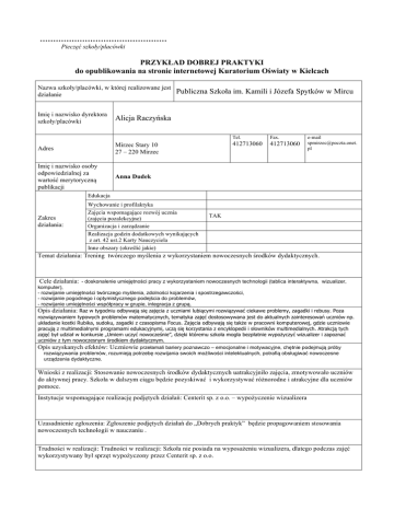 ………………………………………… Pieczęć szkoły/placówki PRZYKŁAD DOBREJ PRAKTYKI do opublikowania na stronie internetowej Kuratorium Oświaty w Kielcach Nazwa szkoły/placówki, w której realizowane jest działanie Imię i nazwisko dyrektora szkoły/placówki Alicja Raczyńska Adres Mirzec Stary 10 27 – 220 Mirzec Imię i nazwisko osoby odpowiedzialnej za wartość merytoryczną publikacji Anna Dudek Publiczna Szkoła im. Kamili i Józefa Spytków w Mircu Tel. Fax. 412713060 412713060 e-mail [email protected]. pl Edukacja Zakres działania: Wychowanie i profilaktyka Zajęcia wspomagające rozwój ucznia (zajęcia pozalekcyjne) Organizacja i zarządzanie Realizacja godzin dodatkowych wynikających z art. 42 ust.2 Karty Nauczyciela Inne obszary (określić jakie) TAK Temat działania: Trening twórczego myślenia z wykorzystaniem nowoczesnych środków dydaktycznych. Cele działania: - doskonalenie umiejętności pracy z wykorzystaniem nowoczesnych technologii (tablica interaktywna, wizualizer, komputer), - rozwijanie umiejętności twórczego myślenia, zdolności kojarzenia i spostrzegawczości, - rozwijanie pogodnego i optymistycznego podejścia do problemów, - rozwijanie umiejętności współpracy w grupie, integracja z grupą. Opis działania: Raz w tygodniu odbywają się zajęcia z uczniami lubiącymi rozwiązywać ciekawe problemy, zagadki i rebusy. Poza rozwiązywaniem typowych problemów matematycznych, tematyka zajęć dostosowywana jest do aktualnych zainteresowań uczniów np. układanie kostki Rubika, sudoku, zagadki z czasopisma Focus. Zajęcia odbywają się także w pracowni komputerowej, gdzie uczniowie pracują z multimedialnymi programami edukacyjnymi, uczą się korzystania z encyklopedii i słowników multimedialnych. Atrakcją tych zajęć był udział w konkursie „Umiem uczyć nowocześnie”, dzięki któremu szkoła mogła bezpłatnie wypożyczyć wizualizer i zapoznać uczniów z tym nowoczesnym środkiem dydaktycznym. Opis uzyskanych efektów: Uczniowie przełamali bariery poznawczo – emocjonalne i motywacyjne, chętnie podejmują próby rozwiązywania problemów, rozumieją potrzebę rozwijania swoich możliwości intelektualnych, potrafią obsługiwać nowoczesne urządzenia dydaktyczne. Wnioski z realizacji: Stosowanie nowoczesnych środków dydaktycznych uatrakcyjniło zajęcia, zmotywowało uczniów do aktywnej pracy. Szkoła w dalszym ciągu będzie pozyskiwać i wykorzystywać różnorodne i atrakcyjne dla uczniów pomoce. Instytucje wspomagające realizację podjętych działań: Centerit sp. z o.o. – wypożyczenie wizualizera Uzasadnienie zgłoszenia: Zgłoszenie podjętych działań do „Dobrych praktyk” będzie propagowaniem stosowania nowoczesnych technologii w nauczaniu . Trudności w realizacji: Trudności w realizacji: Szkoła nie posiada na wyposażeniu wizualizera, dlatego podczas zajęć wykorzystywany był sprzęt wypożyczony przez Centerit sp. z o.o. Wykaz załączników: : - scenariusz przykładowych zajęć „Trening twórczego myślenia”, - prezentacja multimedialna z przeprowadzonych zajęć. Wyrażam zgodę na opublikowanie na stronie internetowej Kuratorium Oświaty w Kielcach przedstawionego przykładu dobrej praktyki. Mirzec, 15.04.2011r. Miejscowość, data Alicja Raczyńska Podpis dyrektora szkoły/placówki UWAGI ! Przykłady dobrej praktyki można przesyłać pocztą elektroniczną na adres [email protected] Wymagania: 1. Opracowanie proszę przygotować w formie plików tekstowych: pdf, doc lub prezentacji ppt. Można uzupełnić 6 zdjęciami do 400 kb każde (dołączone osobno). 2. Publikacja nie może przekroczyć 5 Mb. Świętokrzyski Kurator Oświaty zastrzega sobie prawo do zamieszczenia na stronie Kuratorium Oświaty w Kielcach tylko wybranych przykładów dobrej praktyki.