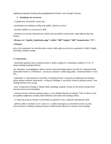 Aplikacja najlepiej działa pod przeglądarkami Firefox oraz Google Chrome. 1. Instalacja na serwerze: - wypakować zawartość wizyty.zip - przekopiować katalogi config oraz public_html na serwer, - atrybuty plików na serwerze to 660, - umieścić na stronie internetowej, która musi posiadać rozszerzenie .php odpowiedni tag iframe: <iframe src="public_html/index.php" width="400" height="400" frameborder="0"> </iframe> przy czym parametr src określa adres strony index.php na serwerze, parametry width i height określają wielkość ramki. 2. Ustawienia: - domyślne godziny pracy (umieszczone w pliku config.txt w katalogu config) to 8-16, 15 minut obsługi każdego klienta, -po wpisaniu w przeglądarce adresu strony ustawienia.php pojawi się pole do wpisania hasła (domyślne hasło to: Z1RsKmA - można je zmienić w pliku loguj.php - zmienna $haslo w linii 23), - kalendarz w ustawieniach wyświetla 14 kolejnych dni w których po kliknięciu na kolejny dzień można zmienić ustawienia - wyłączyć obsługę w ten dzień, ustawić godziny pracy, czas obsługi klienta oraz uwagi, - przy wyłączeniu obsługi w danym dniu, próbując zapisać wizytę na ten dzień użytkownik otrzyma stosowny komunikat, - można również ustawić godziny pracy i czas obsługi klienta na kolejne 7 lub 14 dni (w tym przypadku nadpisane zostaną indywidualne ustawienia dla każdego dnia), - w ramce po prawej stronie wyświetlane są godziny wraz z danymi zapisanych osób, - główny plik ze stylami css to: style.css, w pliku messages.css przechowywane są style używane przy walidacji podanych przez użytkownika danych na stronie rezerwuj.php