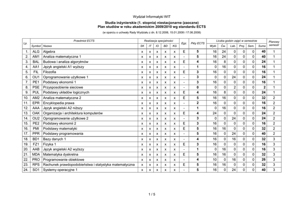 Wydział Informatyki WIT Studia inŜynierskie (1. stopnia) niestacjonarne (zaoczne) Plan studiów w roku akademickim 2009/2010 wg standardu ECTS (w oparciu o uchwały Rady Wydziału z dn. 8.12.2006, 15.01.2008 i 17.06.2008) Przedmiot ECTS Lp. Symbol Nazwa Realizacja specjalności Egz. SK IT IO BD KG Pkty ECTS Liczba godzin zajęć w semestrze Wykł. Ćw. Lab. Proj. Sem. Suma Planowy semestr 1. 2. 3. 4. 5. 6. 7. 8. 9. ALG AM1 BAL AA1 FIL OU1 PE1 PSE PUL Algebra Analiza matematyczna 1 Budowa i analiza algorytmów Język angielski A1 wyŜszy Filozofia Oprogramowanie uŜytkowe 1 Podstawy ekonomii 1 Przysposobienie sieciowe Podstawy układów logicznych x x x x x x x x x x x x x x x x x x x x x x x x x x x x x x x x x x x x x x x x x x x x x E E E E 5 5 4 1 3 3 3 0 4 16 16 16 0 16 0 16 0 16 24 24 8 16 0 0 0 0 8 0 0 0 0 0 24 0 2 0 0 0 0 0 0 0 0 0 0 0 0 0 0 0 0 0 0 0 40 40 24 16 16 24 16 2 24 1 1 1 1 1 1 1 1 1 10. 11. 12. 13. 14. 15. 16. 17. AM2 EPR AAA OAK OU2 PE2 PMI PPR Analiza matematyczna 2 Encyklopedia prawa Język angielski A2 niŜszy Organizacja i architektura komputerów Oprogramowanie uŜytkowe 2 Podstawy ekonomii 2 Podstawy matematyki Podstawy programowania x x x x x x x x x x x x x x x x x x x x x x x x x x x x x x x x x x x x x x x x E E E E - 5 2 1 4 3 3 5 5 16 16 0 24 0 16 16 16 16 0 16 0 0 0 16 0 0 0 0 0 24 0 0 24 0 0 0 0 0 0 0 0 0 0 0 0 0 0 0 0 32 16 16 24 24 16 32 40 2 2 2 2 2 2 2 2 18. 19. 20. 21. 22. 23. 24. BD1 FZ1 AAB MDA PRO RPS SO1 Bazy danych 1 Fizyka 1 Język angielski A2 wyŜszy Matematyka dyskretna Programowanie obiektowe Rachunek prawdopodobieństwa i statystyka matematyczna Systemy operacyjne 1 x x x x x x x x x x x x x x x x x x x x x x x x x x x x x x x x x x x E E E - 4 3 1 5 4 5 5 16 16 0 16 10 16 16 0 0 16 16 0 16 0 16 0 0 0 16 0 24 0 0 0 0 0 0 0 0 0 0 0 0 0 0 32 16 16 32 26 32 40 3 3 3 3 3 3 3 1/5 Przedmiot ECTS Lp. Symbol Nazwa Realizacja specjalności Egz. SK IT IO BD KG Pkty ECTS Liczba godzin zajęć w semestrze Wykł. Ćw. Lab. Proj. Sem. Suma Planowy semestr 25. 26. 27. 28. 29. 30. 31. 32. BD2 FZ2 GRS ABA PO2 SO2 SWD WIT Bazy danych 2 Fizyka 2 Grafy i sieci Język angielski B1 niŜszy Programowanie obiektowe 2 Systemy operacyjne 2 Statystyczne metody wspomagania decyzji Wprowadzenie do Internetu x x x x x x x x x x x x x x x x x x x x x x x x x x x x x x x x x x x x x x x x E E E E E - 4 3 5 1 3 5 4 2 16 16 16 0 6 16 16 0 0 0 16 16 0 0 0 0 16 0 0 0 8 16 16 16 0 0 0 0 0 0 0 0 0 0 0 0 0 0 0 0 32 16 32 16 14 32 32 16 4 4 4 4 4 4 4 4 33. 34. 35. 36. 37. 38. 39. 40. 41. 42. 43. 44. 45. 46. 47. AS1 BD3 BOP PG1 INO ABB LIO OPT PLS PMA PRS PTK SSR SST XML Algorytmy i struktury danych 1 Bazy danych 3 Badania operacyjne Projektowanie graficzne 1 InŜynieria oprogramowania Język angielski B1 wyŜszy Laboratorium inŜynierii oprogramowania Odwzorowania przestrzeni trójwymiarowej Język PL/SQL Podstawy modelowania i animacji Programowanie systemowe Podstawy telekomunikacji Sieci i systemy rozproszone Sieci i systemy telekomunikacyjne Język XML x x x x x x x x x x x x x x x x x E E E E E - 3 3 4 2 4 1 2 3 3 3 3 3 5 3 3 16 16 16 12 32 0 0 8 0 0 8 16 16 16 0 0 0 8 12 0 16 0 0 0 0 0 0 0 0 0 0 0 12 0 0 0 16 16 16 24 8 0 16 8 16 0 0 0 0 0 0 0 0 0 0 0 0 0 0 0 0 0 0 0 0 0 0 0 0 0 0 0 0 0 0 16 16 36 24 32 16 16 24 16 24 16 16 32 24 16 5 5 5 5 5 5 5 5 5 5 5 5 5 5 5 48. 49. 50. 51. 52. 53. 54. 55. 56. AS2 BD4 PG2 GRT IB1 ABC JAV LO2 OST Algorytmy i struktury danych 2 Bazy danych 4 Projektowanie graficzne 2 Grafika dwuwymiarowa i trójwymiarowa Internetowe bazy danych 1 Język angielski B2 niŜszy Język Java Laboratorium inŜynierii oprogramowania 2 Organizacja sektora telekomunikacji E E E - 5 3 2 4 2 1 4 2 4 16 16 12 0 0 0 16 0 16 0 0 12 0 0 16 0 0 8 16 0 0 24 16 0 16 16 0 0 0 0 0 0 0 0 0 0 0 0 0 0 0 0 0 0 0 32 16 24 24 16 16 32 16 24 6 6 6 6 6 6 6 6 6 x x x x x x x x x x x x x x x x x x x x x x x x x x x x x x x x x 2/5 x x x x x x x x Przedmiot ECTS Lp. Symbol Nazwa 57. 58. 59. 60. 61. 62. 63. 64. 65. 66. PAP POB PSC PWK SKO TB1 TLI WKR ZPI PRZ Programowanie aplikacji klient-serwer Przetwarzanie obrazów Programowanie sieciowe Projektowanie wspomagane komputerowo Sieci komputerowe Tworzenie aplikacji bazodanowych 1 Teleinformatyka Wstęp do kryptologii Zarządzanie projektami informatycznymi Praktyka zawodowa 67. 68. 69. 70. 71. 72. 73. 74. 75. 76. 77. 78. 79. 80. 81. 82. 83. 84. 85. 86. ABO APO BSK ELC PG3 GR2 HDA ISO ABD KPP MGB PAI PK2 PN1 PS2 TB2 TEC UAS ZSK ZST Administracja baz danych Oracle Algorytmy przetwarzania obrazów Bezpieczeństwo systemów komputerowych Elektronika cyfrowa Projektowanie graficzne 3 Grafika dwuwymiarowa i trójwymiarowa 2 Hurtownie danych Inteligentne systemy obliczeniowe Język angielski B2 wyŜszy Komputerowe przygotowanie publikacji Modelowanie i generowanie aplikacji bazodanowych Programowanie aplikacji internetowych Projektowanie wspomagane komputerowo 2 Programowanie niskopoziomowe 1 Programowanie sieciowe 2 Tworzenie aplikacji bazodanowych 2 Technika cyfrowa Urzadzenia aktywne sieci Zarządzanie sieciami komputerowymi Zarządzanie sieciami telekomunikacyjnymi Realizacja specjalności SK x x IT x x IO x x BD x Egz. x x x x x x x x x x x x x x x x x x x x x x x x x x x x x x x x x x x x x x x x x x x x x x x x x x x x x x 3/5 Pkty ECTS KG Liczba godzin zajęć w semestrze Wykł. Ćw. Lab. Proj. Sem. Suma Planowy semestr E E E E - 3 5 3 4 5 3 3 5 3 2 8 16 8 0 16 0 16 16 16 0 0 0 0 0 0 0 0 16 0 0 16 16 8 24 16 16 4 0 8 0 0 0 0 0 0 0 0 0 0 0 0 0 0 0 0 0 0 0 0 0 24 32 16 24 32 16 20 32 24 0 6 6 6 6 6 6 6 6 6 6 E E E E E E E E E - 5 4 4 3 2 3 4 3 1 5 3 4 3 2 2 3 5 5 5 2 16 8 16 16 12 0 0 16 0 16 0 0 0 0 0 0 16 16 16 16 0 0 0 0 12 0 0 0 16 0 0 0 0 0 0 0 0 0 0 0 16 16 8 0 0 24 24 0 0 16 16 32 24 12 16 16 16 16 16 0 0 0 0 0 0 0 0 0 0 0 0 0 0 0 0 0 0 0 0 0 0 0 0 0 0 0 0 0 0 0 0 0 0 0 0 0 0 0 0 0 32 24 24 16 24 24 24 16 16 32 16 32 24 12 16 16 32 32 32 16 7 7 7 7 7 7 7 7 7 7 7 7 7 7 7 7 7 7 7 7 Przedmiot ECTS Lp. Realizacja specjalności Symbo