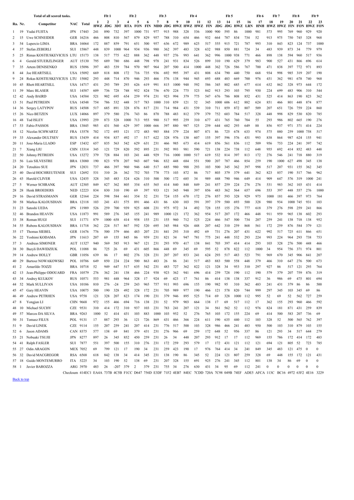 Total of all scored tasks. Ra. Nr. Competitor NAC Flt 1 Total Flt 2 Flt 3 Flt 4 Flt 5 Flt 6 Flt 7 Flt 8 Flt 9 1 2 3 4 5 6 7 8 9 10 11 12 13 14 15 16 17 18 19 20 21 22 23 HWZ JDG 3DT RTA FON FIN MDD JDG HWZ HWZ HWZ FIN JDG JDG HWZ LRN HNH HWZ HWZ FIN FON HWZ FON 1 19 Yudai FUJITA JPN 17443 241 890 732 397 1000 731 977 915 988 328 536 1000 900 595 86 1000 981 573 995 769 960 929 920 2 15 Uwe SCHNEIDER GER 16216 466 808 810 567 879 957 788 310 654 466 932 787 834 734 52 913 975 750 745 328 968 3 54 Lupercio LIMA BRA 16064 172 887 859 791 651 500 957 636 672 989 625 517 555 915 721 787 993 310 843 823 124 737 1000 4 37 Stefan ZEBERLI SUI 15867 448 839 1000 964 934 936 980 362 397 483 328 632 988 850 881 724 34 483 939 873 34 779 979 5 25 Rimas KOSTIUSKEVICIUS LTU 15173 138 517 775 622 888 362 448 937 276 993 641 362 996 1000 938 771 466 898 138 594 960 517 936 6 4 AUT 15130 795 689 780 686 448 798 978 241 931 834 526 899 310 190 629 379 983 900 527 431 866 696 614 7 35 Artem DENISENKO RUS 15096 397 483 539 784 970 907 964 207 500 414 1000 448 362 726 586 767 700 471 838 397 772 971 893 8 44 Joe HEARTSILL USA 15092 669 818 808 172 716 735 936 692 995 397 431 808 634 790 440 750 668 934 998 985 319 207 190 9 24 Rokas KOSTIUSKEVICIUS LTU 15002 Gerald STUERZLINGER 829 664 293 448 714 870 946 293 466 576 138 944 945 693 688 483 669 700 976 431 362 981 678 740 968 USA 14717 431 293 789 293 626 619 991 815 1000 948 592 586 345 802 685 677 614 632 862 328 973 644 172 11 39 Marc BLASER SUI 14587 609 736 728 748 952 824 756 670 224 775 523 842 913 293 103 795 930 224 699 483 906 310 544 12 42 Andy BAIRD USA 14584 521 902 695 654 259 974 231 923 994 379 775 547 676 786 808 852 431 525 414 863 190 823 362 13 51 Paul PETREHN USA 14548 754 786 532 448 517 783 1000 310 859 121 52 345 1000 606 612 882 624 851 466 801 448 874 877 14 36 Sergey LATYPOV RUS 14508 517 685 891 328 876 817 231 714 984 431 539 310 711 859 872 807 509 207 651 726 759 224 860 15 26 Nico BETZEN LUX 14066 897 379 580 276 743 86 870 788 483 812 379 379 752 603 784 517 328 448 998 829 530 820 785 16 48 Tod ISLEY USA 13993 259 873 528 1000 713 955 980 517 995 259 310 677 431 765 760 704 55 293 986 802 665 190 276 17 53 Fabio PASSOS BRA 13845 985 431 560 629 397 1000 666 397 880 987 525 259 644 682 293 649 88 856 937 971 371 414 224 18 12 Nicolas SCHWARTZ FRA 13578 702 172 693 121 172 483 985 884 379 224 807 871 86 725 678 633 974 575 880 259 1000 758 19 33 Alexander DULTSEV RUS 13439 414 934 837 492 17 517 622 328 976 138 607 155 397 596 576 431 993 838 864 987 624 10 45 Rhett HEARTSILL 155 517 941 20 11 Jose-Maria LLADO ESP 13432 657 835 563 542 629 631 231 466 985 673 414 619 856 561 836 112 509 956 753 224 241 397 742 21 7 CHN 13314 345 121 729 820 592 895 231 592 993 981 590 721 138 224 738 112 648 955 692 414 852 483 448 Xiang LIU 22 50 Johnny PETREHN USA 13272 379 728 884 103 241 448 929 716 1000 1000 517 619 532 814 397 813 172 276 546 241 718 880 319 23 56 Luis SILVESTRE BRA 13080 190 823 978 207 943 607 946 832 448 684 551 500 207 787 466 854 259 190 1000 627 498 345 138 24 20 Tetsuhiro SUE JPN 12831 737 466 397 960 946 640 517 685 980 988 293 103 500 345 362 397 998 517 207 931 155 362 345 25 40 David HOCHREUTENER SUI 12692 531 310 26 362 752 703 778 773 103 872 86 717 803 379 379 641 362 823 857 190 517 766 962 26 43 Harold CLIVER USA 12435 328 345 483 524 626 310 500 500 172 685 34 989 448 790 946 649 414 909 647 576 319 1000 241 27 5 AUT 12305 849 827 362 805 354 635 565 414 840 848 849 241 857 259 224 276 276 531 983 362 103 431 28 28 Henk BROEDERS Werner SCHRANK NED 12223 834 830 310 190 69 397 933 121 345 948 397 856 483 362 564 657 696 553 397 448 557 276 414 1000 29 16 David STRASMANN GER 12164 224 598 584 661 354 52 231 724 155 670 172 276 857 593 328 929 975 1000 181 466 397 973 764 103 30 58 Markus KALOUSDIAN BRA 12118 103 241 431 575 891 466 431 86 630 103 591 397 379 580 693 500 328 980 934 1000 745 931 31 23 Satoshi UEDA JPN 11989 526 259 700 939 925 608 231 975 972 34 492 728 155 155 276 777 618 379 276 598 259 241 866 32 46 Brandon HEAVIN USA 11873 991 589 276 345 155 241 989 1000 121 172 362 954 517 207 172 466 448 911 959 965 138 602 293 33 38 Roman HUGI SUI 11771 879 1000 658 414 958 155 231 155 960 712 525 224 466 547 500 734 207 259 241 138 718 138 952 34 55 Rubens KALOUSDIAN BRA 11718 362 224 517 867 592 520 695 345 984 926 448 207 642 310 259 868 561 172 259 876 584 379 121 35 17 Thomas SIEBEL GER 11676 776 500 379 466 483 207 231 841 293 310 492 69 731 276 207 431 622 992 517 725 611 866 651 36 22 Yoshimi KODAMA JPN 11613 207 69 155 845 86 959 231 821 34 947 781 775 241 448 532 293 224 993 224 964 293 738 753 37 3 AUT 11327 940 569 585 913 967 121 231 293 970 417 138 841 703 397 414 414 293 103 328 276 500 448 466 38 30 Bazyli DAWIDZIUK POL 11088 86 725 26 69 431 605 866 448 69 345 69 595 52 878 822 112 1000 34 954 756 371 974 801 39 14 Andrew HOLLY GBR 11056 639 86 17 802 276 328 231 207 207 853 241 624 293 517 483 523 791 969 670 345 906 841 207 40 29 Bartosz NOWAKOWSKI POL 10786 649 850 224 224 500 863 483 26 86 241 517 483 883 500 558 448 379 466 310 647 276 500 673 41 2 764 Andreas SIMONER Amarildo TOZZI BRA 10718 52 949 647 517 635 542 231 483 727 362 822 121 328 34 953 310 297 927 86 517 121 293 42 13 Jean-Philippe ODOUARD FRA 10579 276 362 241 138 466 224 938 923 362 941 696 414 259 728 190 112 190 579 379 207 759 876 319 43 34 Andrey KULKOV RUS 10571 553 981 448 964 328 17 924 69 423 17 761 86 414 138 138 337 912 36 986 69 801 694 44 52 Mark SULLIVAN USA 10186 810 276 -24 259 243 965 757 911 993 696 155 190 982 95 310 362 483 241 431 379 86 86 500 45 47 Gary HEAVIN USA 10075 500 190 328 492 328 172 231 705 989 977 190 466 121 578 820 744 999 297 345 103 345 69 86 46 49 Andrew PETRHEN USA 9758 121 328 207 823 174 190 231 379 946 895 525 714 69 328 1000 112 995 52 69 52 562 727 259 47 8 Yongjun LI 475 CHN 9668 972 155 466 694 716 138 231 52 979 903 664 138 17 69 517 112 17 362 155 293 960 466 592 4