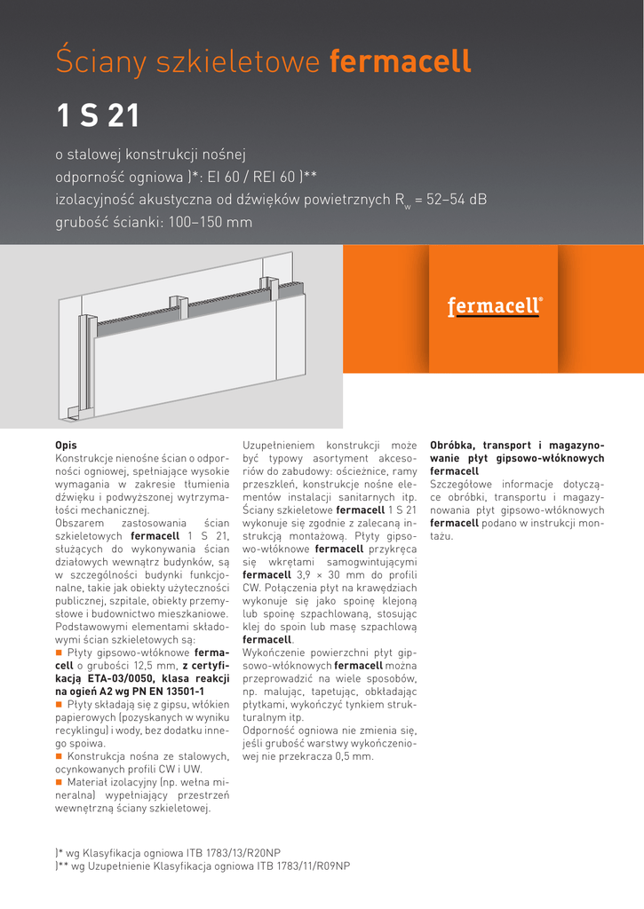 Ściany szkieletowe fermacell 1 S 21 o stalowej konstrukcji nośnej odporność ogniowa )*: EI 60 / REI 60 )** izolacyjność akustyczna od dźwięków powietrznych Rw = 52–54 dB grubość ścianki: 100–150 mm Opis Konstrukcje nienośne ścian o odporności ogniowej, spełniające wysokie wymagania w zakresie tłumienia dźwięku i podwyższonej wytrzymałości mechanicznej. Obszarem zastosowania ścian szkieletowych fermacell 1 S 21, służących do wykonywania ścian działowych wewnątrz budynków, są w szczególności budynki funkcjonalne, takie jak obiekty użyteczności publicznej, szpitale, obiekty przemysłowe i budownictwo mieszkaniowe. Podstawowymi elementami składowymi ścian szkieletowych są: Płyty gipsowo-włóknowe fermacell o grubości 12,5 mm, z certyfikacją ETA-03/0050, klasa reakcji na ogień A2 wg PN EN 13501-1 Płyty składają się z gipsu, włókien papierowych (pozyskanych w wyniku recyklingu) i wody, bez dodatku innego spoiwa. Konstrukcja nośna ze stalowych, ocynkowanych profili CW i UW. Materiał izolacyjny (np. wełna mineralna) wypełniający przestrzeń wewnętrzną ściany szkieletowej. Uzupełnieniem konstrukcji może być typowy asortyment akcesoriów do zabudowy: ościeżnice, ramy przeszkleń, konstrukcje nośne elementów instalacji sanitarnych itp. Ściany szkieletowe fermacell 1 S 21 wykonuje się zgodnie z zalecaną instrukcją montażową. Płyty gipsowo-włóknowe fermacell przykręca się wkrętami samogwintującymi fermacell 3,9 × 30 mm do profili CW. Połączenia płyt na krawędziach wykonuje się jako spoinę klejoną lub spoinę szpachlowaną, stosując klej do spoin lub masę szpachlową fermacell. Wykończenie powierzchni płyt gipsowo-włóknowych fermacell można przeprowadzić na wiele sposobów, np. malując, tapetując, obkładając płytkami, wykończyć tynkiem strukturalnym itp. Odporność ogniowa nie zmienia się, jeśli grubość warstwy wykończeniowej nie przekracza 0,5 mm. )* wg Klasyfikacja ogniowa ITB 1783/13/R20NP )** wg Uzupełnienie Klasyfikacja ogniowa ITB 1783/11/R09NP Obróbka, transport i magazynowanie płyt gipsowo-włóknowych fermacell Szczegółowe informacje dotyczące obróbki, transportu i magazynowania płyt gipsowo-włóknowych fermacell podano w instrukcji montażu. Ściany szkieletowe fermacell 1 S 21 o stalowej konstrukcji nośnej odporność ogniowa )*: EI 60 / REI 60 )** izolacyjność akustyczna od dźwięków powietrznych Rw = 52–54 dB grubość ścianki: 100–150 mm Dane techniczne Obustronna obudowa Rozstaw konstrukcji metalowej Odporność ogniowa Grubość ścianki [mm] 100 125 150 Konstrukcja nośna 75 × 0,6 100 × 0,6 125 × 0,6 Płyta gipsowo-włóknowa fermacell maksymalna odległość osiowa EI 60 )* Izolacja MW Grubość/gęstość objętościowa [mm]/ [kg/m3] 70/30 70/30 70/30 Montaż Położenie ścian należy wytyczyć na podłodze, stropie i ścianach (uwzględniając otwory drzwiowe itp.). Profile UW należy zakotwić do podłogi i stropu, a profile CW do ścian bocznych, z uszczelnieniem wszystkich połączeń. Następnie należy przyciąć profile CW na odpowiednią długość, wsunąć je do profili UW i zamocować przy maksymalnym rozstawie 62,50 cm. Należy zwrócić uwagę na dokładność montażu i zachowanie pionu. W otworach drzwiowych i ścianach przeszklonych stosuje się profile usztywniające UA, odpowiednio dobrane do rozmiarów otworów / ścian, ich rodzaju i wykonania. Z jednej strony konstrukcja zostaje obudowana warstwą płyt gipsowo -włóknowych fermacell o grubości 12,5 mm. Pionowy styk płyt tworzy spoina klejona. Spoinę klejoną należy wykonać, stosując klej do spoin fermacell zgodnie z instrukcją montażu. Spoinę szpachlowaną wykonuje się, stosując masę szpachlową fermacell bez taśmy wzmacniającej, również zgodnie z instrukcją montażu, dotrzymując jednocześnie jej min. szerokości wynoszącej grubość płyty. Do połączeń równoległych płyt preferowana jest spoina klejona bez podkładki. Natomiast poziomą spoinę szpachlowaną należy podłożyć pasem odciętym z płyty fermacell lub profilem metalowym. Wysokość maksymalna ściany [cm] Dla określonych wymagań ppoż. bez z 550 400 550 400 550 400 Płyty gipsowo-włóknowe mocuje się do profili CW wyłącznie za pomocą wkrętów samogwintujących fermacell 3,9 × 30 mm, w rozstawie < 25 cm, następnie zostaną zamontowane konstrukcje nośne elementów wyposażenia, a wolna przestrzeń zostanie wypełniona zalecanym materiałem izolacyjnym (lekkie ściśnięcie zapobiegnie wypadaniu podczas montażu). Obudowę drugiej strony konstrukcji płytami gipsowo-włóknowymi fermacell należy wykonać tym samym sposobem. Następnie spoiny klejona i szpachlowana oraz wpuszczone łby wkrętów samogwintujących zostaną zaszpachlowane zgodnie z instrukcją wykonania szpachlówką / masą do wykonywania warstwy wykończeniowej. Wypusty, elementy kotwiące i inne materiały chroni się przed zaszpachlowaniem taśmą oddzielającą. Jeśli nie zostały określone wymagania odporności ogniowej, przy wyprowadzeniach przewodów / mediów można użyć masy elastycznej. Szczeliny dylatacyjne ścian szkieletowych fermacell należy wykonać w miejscach dylatacji konstrukcji nośnej budynku, z możliwościami ruchu odpowiadającymi tym szczelinom. 12,5 mm 62,5 cm Ciężar po- Tłumienie wierzch- dźwięków niowy Rw [kg/m2] 36 36 37 [dB] 52 52 54 Odporność ogniowa EI 60 Ponieważ ściany szkieletowe fermacell wykazują minimalne odchyłki pod wpływem zmian parametrów otoczenia, należy je obserwować. Zalecane są następujące odległości szczelin dylatacyjnych: Maksymalnie co 8 m w przypadku spoiny szpachlowanej. Maksymalnie co 10 m w przypadku spoiny klejonej. Wykonanie szczeliny dylatacyjnej musi uwzględniać wymagania izolacji dźwiękowej i odporności ogniowej. Ściany szkieletowe fermacell 1 S 21 o stalowej konstrukcji nośnej odporność ogniowa )*: EI 60 / REI 60 )** izol