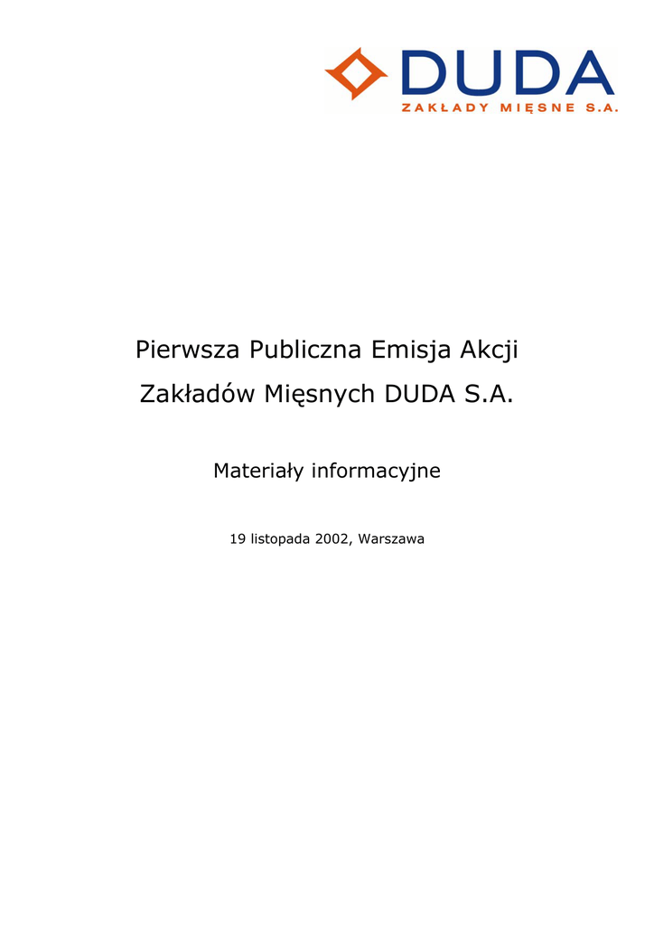 Pierwsza Publiczna Emisja Akcji Zakładów Mięsnych DUDA S.A.