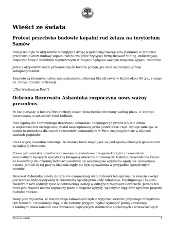 Wieści ze świata Protest przeciwko budowie kopalni rud żelaza na terytorium Samów Policja usunęła 50 aktywistów blokujących drogę w północnej Szwecji koło Jokkmokk w proteście przeciwko planom budowy kopalni rud żelaza przez brytyjską firmę Beowulf Mining, zamierzającą rozpocząć testy z ładunkami wybuchowymi w miejscu będącym ważnym miejscem wypasu reniferów. Jeden z aktywistów został przewieziony do lekarza po tym, jak oblał się benzyną grożąc samopodpaleniem. Samowie są rdzennym ludem zamieszkującym północną Skandynawię w liczbie około 80 tys., z czego ok. 20 tys. mieszka w Szwecji. („The Washington Post”) Ochrona Rezerwatu Ashaninka rozpoczyna nowy ważny precedens Po raz pierwszy w historii Peru rozległy obszar leśny będzie chroniony według planu, w którego opracowaniu uczestniczyli leśni Indianie. Plan Ogólny dla Komunalnego Rezerwatu Ashaninka, obejmującego prawie 0,5 mln akrów w większości dziewiczego lasu, został zaakceptowany przez peruwiański rząd. Istnieje nadzieja, że będzie to precedens dla innych rezerwatów komunalnych w Peru, znajdujących się w różnych stadiach projektów. Coraz więcej dowodów wskazuje, że obszary leśne znajdujące się pod opieką lokalnych społeczności są najlepiej chronione. Prawo peruwiańskie umożliwia rdzennym mieszkańcom czerpanie korzyści z rezerwatów komunalnych będących specyficzną kategorią obszarów chronionych. Ostatnio zatwierdzone Prawo do konsultacji dla rdzennej ludności umożliwia im wcześniejsze wyrażenie zgody ws. korzystania z ziemi. Jednak do tej pory ta klauzula nigdy nie była sprawdzona w przypadku specyficznych terenów. Rezerwat Ashaninka należy do terenów o najwyższej różnorodności biologicznej na świecie i wciąż jest szeroko wykorzystywany w różnorodny sposób przez ludy Ashaninka, Machiguenga i Kakinte. Niektóre z nich wybrały życie w dobrowolnej izolacji w odległych zakątkach Rezerwatu. Jednak ten teren jest również mocno zagrożony przez nielegalne wyręby, wydobycie ropy oraz ogromne projekty hydrotechniczne. Nowy plan zapewnia, że własna wizja Ashaninków będzie wytyczać kierunki przyszłego zarządzania tym terenem. Eksploatacja ropy, o ile zostanie przyjęta, będzie wymagać pełnej konsultacji z lokalnymi mieszkańcami oraz wdrożenia najwyższych standardów społecznych i środowiskowych. Wieści ze świata 1 (Rainforest Foundation) Rzeki amerykańskiego północnego-wschodu ponownie udrażniane dla łososi i kajakarzy W amerykańskim stanie Maine trwa rozbiórka liczącej już 100 lat dużej tamy Veazie na rzece Penobscot. Wcześniej na tej samej rzece rozebrano już pierwszą tamę. Dzięki temu rzeka ponownie stanie się tarliskiem zagrożonych łososi atlantyckich i jesiotrów, ponadto przekształci się w atrakcyjny szlak kajakowy. Renaturyzacja Penobscot jest o tyle ważna, że rzeka tworzy największe dorzecze w Maine, które jest domem Indian Penobscot, od wieków utrzymujących się z połowu ryb aż do czasu, gdy populacja tych ostatnich załamała się na skutek przegrodzenia rzeki. „Największą sprawą jest przywrócenie rzece wysokiej populacji ryb” – mówi Scott Phillips, Indianin z plemienia Penobscot. – „Mój 73-letni ojciec, członek starszyzny plemiennej, nie może się doczekać powrotu łososi atlantyckich do rzeki. Już ma przygotowany oszczep do tradycyjnego połowu ryb”. Jednak czy jego ojciec oraz sam Phillips doczekają znacznej odbudowy populacji łososi nie jest jeszcze wiadome. Usuwanie tamy potrwa 2 lata. W 1999 r. dokonano historycznej rozbiórki tamy na innej rzece w Maine – Kennebec. Wówczas po raz pierwszy Federalna Komisja ds. Energetyki przyznała, że ekologiczna wartość swobodnie płynącej rzeki przewyższa ekonomiczną wartość zapory. Rzeka Kennebec przeżywa obecnie prawdziwy renesans rozwoju turystyki wodnej, ale najważniejsze jest zaobserwowane przywrócenie tarlisk ryb. (outsideonline.com) Opracowanie: Tomasz Nakonieczny Wieści ze świata 2