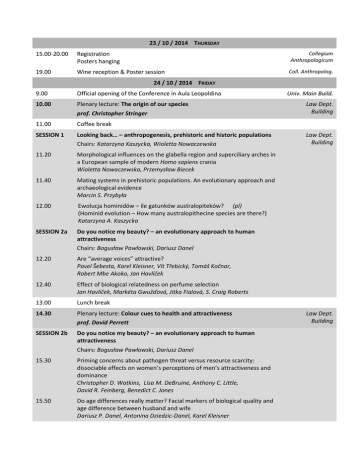 23 / 10 / 2014 THURSDAY 15.00-20.00 Registration Posters hanging Collegium Anthropologicum 19.00 Wine reception & Poster session Coll. Anthropolog. 24 / 10 / 2014 FRIDAY 9.00 Official opening of the Conference in Aula Leopoldina 10.00 Plenary lecture: The origin of our species prof. Christopher Stringer 11.00 Coffee break SESSION 1 Looking back… – anthropogenesis, prehistoric and historic populations Chairs: Katarzyna Kaszycka, Wioletta Nowaczewska 11.20 Morphological influences on the glabella region and superciliary arches in a European sample of modern Homo sapiens crania Wioletta Nowaczewska, Przemysław Biecek 11.40 Mating systems in prehistoric populations. An evolutionary approach and archaeological evidence Marcin S. Przybyła 12.00 Ewolucja hominidów – ile gatunków australopiteków? (pl) (Hominid evolution – How many australopithecine species are there?) Katarzyna A. Kaszycka SESSION 2a Do you notice my beauty? – an evolutionary approach to human attractiveness Chairs: Bogusław Pawłowski, Dariusz Danel 12.20 Are “average voices” attractive? Pavel Šebesta, Karel Kleisner, Vít Třebický, Tomáš Kočnar, Robert Mbe Akoko, Jan Havlíček 12.40 Effect of biological relatedness on perfume selection Jan Havlíček, Markéta Gwužďová, Jitka Fialová, S. Craig Roberts 13.00 Lunch break 14.30 Plenary lecture: Colour cues to health and attractiveness prof. David Perrett SESSION 2b Do you notice my beauty? – an evolutionary approach to human attractiveness Chairs: Bogusław Pawłowski, Dariusz Danel 15.30 Priming concerns about pathogen threat versus resource scarcity: dissociable effects on women’s perceptions of men’s attractiveness and dominance Christopher D. Watkins, Lisa M. DeBruine, Anthony C. Little, David R. Feinberg, Benedict C. Jones 15.50 Do age differences really matter? Facial markers of biological quality and age difference between husband and wife Dariusz P. Danel, Antonina Dziedzic-Danel, Karel Kleisner Univ. Main Build. Law Dept. Building Law Dept. Building Law Dept. Building 16.10 The speed of distinguishing attractive and unattractive faces – testing “good” and “bad” genes hypotheses Bogusław Pawłowski, Piotr Sorokowski 16.30 Coffee break SESSION 3 Look at me differently – evolutionary physiology and psychology Chairs: Jan Havlićek, Piotr Sorokowski 16.50 Changes in testosterone, cortisol, and vocal displays during virtual courtship in young adult men Jakub Binter, Juan David Leongómez, Pavel Šebesta, Sven Mueller, Klára Bártová, Lucie Krejčová, Kateřina Klapilová 17.10 How does area-level deprivation affect lactational investment in England? Laura J. Brown, Rebecca Sear 17.30 Disgust in pregnancy and foetus sex: a longitudinal study Agnieszka Żelaźniewicz, Bogusław Pawłowski 17.50 Egocentrism as a key component of cultural evolution T. Mark Ellison, Nicholas Fay 18.10 Applied evolutionary psychology in the field of education Michał Misiak 18.3020.00 Poster session The list of posters below Coll. Anthropolog. 25 / 10 / 2014 SATURDAY 9.00 Plenary lecture: The evolution of cultural norms in real world settings prof. Ruth Mace SESSION 4 What shapes our reproductive success? – mating strategies and fertility Chairs: Ilona Nenko, Monika Krzyżanowska 10.00 How does childhood socioeconomic hardship affect reproductive strategy? Pathways of development Paula Sheppard, Mark Pearce, Rebecca Sear 10.20 Is human mating for height associated with fertility? Results from a British national cohort study Monika Krzyżanowska, C.G. Nicholas Mascie-Taylor, Jean-Christophe Thalabard 10.40 Does early-life environment cause differences in costs of reproduction in a preindustrial human population? Ilona Nenko, Adam D. Hayward, Mirre J. P. Simons, Virpi Lummaa 11.00 Coffee break SESSION 5 In group we trust ? – social behaviour from an evolutionary point of view Chairs: Krzysztof Kościński, Agnieszka Sorokowska 11.20 Null effect of birth order on relationship satisfaction Petr Tureček, Jan Havlíček 11.40 The Cooperative Breeding Questionnaire Jan Rybak, Andrzej Łukasik Law Dept. Building 12.00 Attachment style and gender differences in dictator game in children aged 7-13 Łukasz Tanaś, Agnieszka Niemczyk, Monika Tarnowska 12.20 Interpersonal distance preferences: data from 42 cultures Agnieszka Sorokowska, Piotr Sorokowski 12.40 Lunch break SESSION 6 Evolution rules? – culture, economics and law Chairs: Jacek Wiewiórowski, Jan Polowczyk 14.10 An overview of modern evolutionary theories of culture Kinga Kowalczyk-Purol 14.30 Evolutionary perspective in economics Jan Polowczyk 14.50 Gene-culture interactions: What can nature teach us? Ian Upchurch 15.10 Universal Man? – How evolutionary psychology can help winning the struggle for global human rights recognizance Przemysław Andrzej Lewicki 15.30 Juvenile persons in Roman law and natural sciences Jacek Wiewiórowski 15.50 Coffee break SESSION 7 How do we communicate? – linguistics & evolution Chairs: Przemysław Żywiczyński, Sławomir Wacewicz 16.10 Evolution works by natural selection. A linguistic perspective on personification in the theory of evolution Anna Drogosz 16.30 (Not so striking) Differences between iterated learning in children and in adults Katarzyna Rogalska, Natalia Pałka 16.50 Rezonans ruchowy (movement resonance): ukryty wymiar współpracy (pl) (Movement resonance: a hidden dimension of cooperation) Sylwester Orzechowski, Sławomir Wacewicz, Przemysław Żywiczyński 17.15 Closing of the Conference 17.45 General Assembly of the PTNCE 20.00 Conference dinner Law Dept. Building Law Dept. Build. Coll. Anthropolog. Restaurant Spiż Posters list in alphabetic order: 1. Recreational drug use and fluctuating asymmetry – testing handicap principle Barbara Borkowska, Bogusław Pawłowski 2. Gaze properties of women judging the attractiveness of masculine and feminine male faces Robert P. Burriss, Urszula M. Marcinkowska, Minna T. Lyons 3. Does Trivers-W