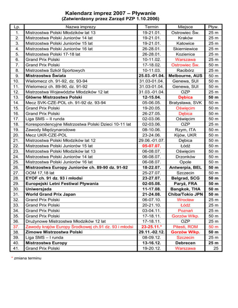 Kalendarz imprez 2007 – Pływanie (Zatwierdzony przez Zarząd PZP 1.10.2006) Lp. 1. 2. 3. 4. 5. 6. 7. 8. 9. 10. 11. 12. 13. 14. 15. 16. 17. 18. 19. 20. 21. 22. 23. 24. 25. 26. 27. 28. 29. 30. 31. 32. 33. 34. 35. 36. 37. 38. 39. 40. 41. Nazwa imprezy Mistrzostwa Polski Młodzików lat 13 Mistrzostwa Polski Juniorów 14 lat Mistrzostwa Polski Juniorów 15 lat Mistrzostwa Polski Juniorów 16 lat Mistrzostwa Polski 17-18 lat Grand Prix Polski Grand Prix Polski Mistrzostwa Szkół Sportowych Mistrzostwa Świata Wielomecz ch. 91-92, dz. 93-94 Wielomecz ch. 89-90, dz. 91-92 Mistrzostwa Województw Młodzików 12 lat Główne Mistrzostwa Polski Mecz SVK-CZE-POL ch. 91-92 dz. 93-94 Grand Prix Polski Grand Prix Polski Liga SMS – II runda Korespondencyjne Mistrzostwa Polski Dzieci 10-11 lat Zawody Międzynarodowe Mecz UKR-CZE-POL Mistrzostwa Polski Młodzików lat 12 Mistrzostwa Polski Juniorów 15 lat Mistrzostwa Polski Młodzików lat 13 Mistrzostwa Polski Juniorów 14 lat Mistrzostwa Polski Juniorów 16 lat Mistrzostwa Europy Juniorów ch. 89-90 dz. 91-92 OOM 17,18 lat EYOF ch. 91 dz. 93 i młodsi Europejski Letni Festiwal Pływania Uniwersjada World Grand Prix Japan Grand Prix Polski Grand Prix Polski Grand Prix Polski Grand Prix Polski DruŜynowe Mistrzostwa Młodzików 12 lat Zawody krajów Europy Środkowej ch.91 dz. 93 i młodsi Zimowe Mistrzostwa Polski Liga SMS – I runda Mistrzostwa Europy Grand Prix Polski * zmiana terminu Termin Miejsce 19-21.01. Ostrowiec Św. 19-21.01. Kraków 19-21.01. Katowice 26-28.01. Skierniewice 26-28.01. Kozienice 10-11.02. Warszawa 17-18.02. Ostrowiec Św. 10-11.03. Racibórz 25.03.-01.04. Melbourne, AUS 31.03-01.04. Genewa, SUI 31.03-01.04. Genewa, SUI 31.03.-01.04. OZP 12-15.04. Dębica 05-06.05. Bratysława, SVK 19-20.05. Oświęcim 26-27.05. Dębica 02-03.06. Oświęcim 02-03.06. OZP 08-10.06. Rzym, ITA 23-24.06. Kijów, UKR 29.06.-01.07. Dębica 05-07.07. Łódź 06-08.07. Oświęcim 06-08.07. Drzonków 06-08.07. Opole 18-22.07. Antwerpia, BEL 25-27.07. Szczecin 23-27.07. Belgrad, SCG 02-05.08. ParyŜ, FRA 11-17.08. Bangkok, THA 21-24.08. Chiba/Tokio JPN 06-07.10. Wrocław 20-21.10. Łódź 03-04.11. Poznań 17-18.11. Gorzów Wlkp. 17-18.11. OZP 23-25.11.* Pitesti, ROM 29.11.-02.12. Gorzów Wlkp. 08-09.12. Szczecin 13-16.12. Debrecen 19-20.12. Warszawa Pływ. 25 m 25 m 25 m 25 m 25 m 25 m 50 m 25 m 50 m 50 m 50 m 25 m 50 m 50 m 50 m 50 m 50 m 25 m 50 m 50 m 50 m 50 m 50 m 50 m 50 m 50 m 50 m 50 m 50 m 50 m 50 m 25 m 25 m 25 m 50 m 25 m 50 m 50 m 25 m 25 m 25