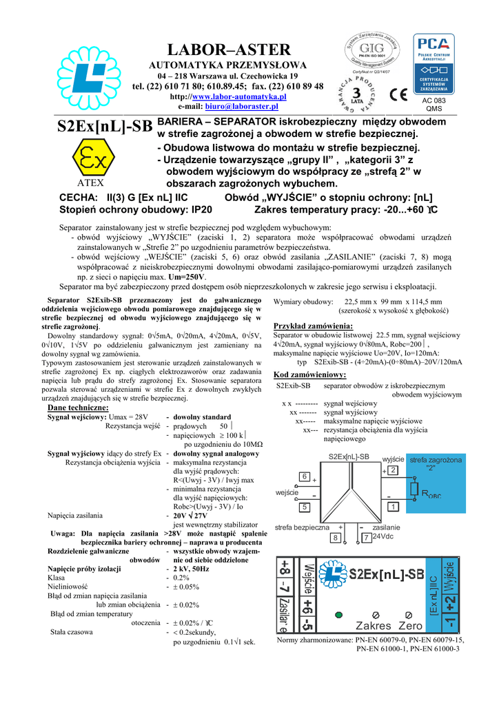 LABOR–ASTER AUTOMATYKA PRZEMYSŁOWA 04 – 218 Warszawa ul. Czechowicka 19 tel. (22) 610 71 80; 610.89.45; fax. (22) 610 89 48 http://www.labor-automatyka.pl e-mail: [email protected] – SEPARATOR iskrobezpieczny między obwodem S2Ex[nL]-SB wBARIERA strefie zagrożonej a obwodem w strefie bezpiecznej. - Obudowa listwowa do montażu w strefie bezpiecznej. - Urządzenie towarzyszące „grupy II” , „kategorii 3” z obwodem wyjściowym do współpracy ze „strefą 2” w ATEX obszarach zagrożonych wybuchem. CECHA: II(3) G [Ex nL] IIC Obwód „WYJŚCIE” o stopniu ochrony: [nL] Stopień ochrony obudowy: IP20 Zakres temperatury pracy: -20...+60 °C Separator zainstalowany jest w strefie bezpiecznej pod względem wybuchowym: - obwód wyjściowy „WYJŚCIE” (zaciski 1, 2) separatora może współpracować obwodami urządzeń zainstalowanych w „Strefie 2” po uzgodnieniu parametrów bezpieczeństwa. - obwód wejściowy „WEJŚCIE” (zaciski 5, 6) oraz obwód zasilania „ZASILANIE” (zaciski 7, 8) mogą współpracować z nieiskrobezpiecznymi dowolnymi obwodami zasilająco-pomiarowymi urządzeń zasilanych np. z sieci o napięciu max. Um=250V. Separator ma być zabezpieczony przed dostępem osób nieprzeszkolonych w zakresie jego serwisu i eksploatacji. Dane techniczne: Sygnał wejściowy: Umax = 28V - dowolny standard Rezystancja wejść - prądowych 50 Ω - napięciowych ≥ 100 kΩ po uzgodnieniu do 10MΩ Sygnał wyjściowy idący do strefy Ex - dowolny sygnał analogowy Rezystancja obciążenia wyjścia - maksymalna rezystancja dla wyjść prądowych: R<(Uwyj - 3V) / Iwyj max - minimalna rezystancja dla wyjść napięciowych: Robc>(Uwyj - 3V) / Io Napięcia zasilania - 20V ÷ 27V jest wewnętrzny stabilizator Uwaga: Dla napięcia zasilania >28V może nastąpić spalenie bezpiecznika bariery ochronnej – naprawa u producenta - wszystkie obwody wzajemRozdzielenie galwaniczne obwodów nie od siebie oddzielone - 2 kV, 50Hz Napięcie próby izolacji Klasa - 0.2% Nieliniowość - ± 0.05% Błąd od zmian napięcia zasilania lub zmian obciążenia - ± 0.02% Błąd od zmian temperatury otoczenia - ± 0.02% / °C Stała czasowa - < 0.2sekundy, po uzgodnieniu 0.1÷1 sek. Wymiary obudowy: 22,5 mm x 99 mm x 114,5 mm (szerokość x wysokość x głębokość) Przykład zamówienia: Separator w obudowie listwowej 22.5 mm, sygnał wejściowy 4÷20mA, sygnał wyjściowy 0÷80mA, Robc=200Ω, maksymalne napięcie wyjściowe Uo=20V, Io=120mA: typ S2Exib-SB - (4÷20mA)-(0÷80mA)–20V/120mA Kod zamówieniowy: S2Exib-SB separator obwodów z iskrobezpiecznym obwodem wyjściowym x x --------- sygnał wejściowy xx ------- sygnał wyjściowy xx----- maksymalne napięcie wyjściowe xx--- rezystancja obciążenia dla wyjścia napięciowego S2Ex[nL]-SB 6 wejście wyjście strefa zagrożona "2" + 2 + - - 5 1 strefa bezpieczna + 8 - zasilanie 7 24Vdc [nL] [Ex nL ]IIC Separator S2Exib-SB przeznaczony jest do galwanicznego oddzielenia wejściowego obwodu pomiarowego znajdującego się w strefie bezpiecznej od obwodu wyjściowego znajdującego się w strefie zagrożonej. Dowolny standardowy sygnał: 0÷5mA, 0÷20mA, 4÷20mA, 0÷5V, 0÷10V, 1÷5V po oddzieleniu galwanicznym jest zamieniany na dowolny sygnał wg zamówienia. Typowym zastosowaniem jest sterowanie urządzeń zainstalowanych w strefie zagrożonej Ex np. ciągłych elektrozaworów oraz zadawania napięcia lub prądu do strefy zagrożonej Ex. Stosowanie separatora pozwala sterować urządzeniami w strefie Ex z dowolnych zwykłych urządzeń znajdujących się w strefie bezpiecznej. Zakres Zero Normy zharmonizowane: PN-EN 60079-0, PN-EN 60079-15, PN-EN 61000-1, PN-EN 61000-3 Parametry bezpieczeństwa w tym maksymalne wartości pojemności i indukcyjności dołączone do wyjściowych zacisków o ograniczonej energii (zaciski nr 1, 2) separatora podane są w Tabeli 1. Uwaga: można zamówić wykonanie na uzgodnione parametry bezpieczeństwa: 0<Uo<25,2V Io ≤ Io podane w tabeli 2. Tabela 1 Wykonanie Po[W] Uo[V] Io [mA] Uwyj=24V Uwyj=22V Uwyj=20V Uwyj=18V Uwyj=16V Uwyj=14V Uwyj=12V Uwyj=10V Uwyj=8,2V Uwyj=0÷6,2V 3,1 3,0 3,0 2,9 2,7 2,5 2,3 2,0 1,8 1,4 25,2 23,1 21 18,9 16,8 14,7 12,6 10,5 8,7 6,6 120 130 140 150 160 170 180 190 200 210 Cmax[µ µF] Lo[mH] I i IIA IIB 7 6 5,5 2,5 4 2 3,4 3,2 3 2,5 2,1 1,8 1,7 1,5 1,3 1,2 3 IIC I i IIA IIB IIC 0,7 0,65 0,6 0,5 0,4 2,6 3,67 4,78 6,39 9,3 14,9 27 75 1000 dowolna 0,77 1,02 1,27 1,6 2,29 3,86 7,4 16,8 50 500 0,10 0,14 0,188 0,262 0,39 0,62 1,15 2,41 5,9 22 0,35 0,3 0,27 0,24 Separator umieszczony jest w obudowie z tworzywa samogasnącego (poliamid PA 6.6) przeznaczonej do montażu na listwę TS 35. Stopień ochrony obudowy i zacisków wynosi IP20. Montaż wyłącznie poza strefą zagrożenia wybuchowego, w pomieszczeniach suchych, niezapylonych i zabezpieczonych przed dostępem osób nie przeszkolonych w zakresie serwisu i eksploatacji separatorów. Warunki stosowania: Obwód wyjściowy separatora typu S2Ex[nL]-SB o stopniu ochrony [nL] może współpracować z beznapięciowym obwodami urządzeń zainstalowanych w „Strefie 2” mieszanin wybuchowych z powietrzem, zaliczanych do grupy wybuchowości IIA, IIB, IIC po uzgodnieniu parametrów bezpieczeństwa. Zaciski wejściowe 5, 6 oraz zaciski zasilające 7, 8 mogą współpracować z dowolnymi obwodami nieiskrobezpiecznymi urządzeń zasilanych np. z sieci o napięciu max. Um=250V. Przyłącza zewnętrzne należy prowadzić przewodami o średnicy żył ∅≤ 2.5 mm. Warunki pracy : Temperatura otoczenia - pracy - wykonanie specjalne Temperatura otoczenia - magazynowania Wilgotność względna Atmosfera otoczenia - -25 ÷ +55 oC -50 ÷ +55 oC -50 ÷ +70°C max 90% brak pyłów i gazów agresywnych 99 22,5 114,5 Szkic obudowy.