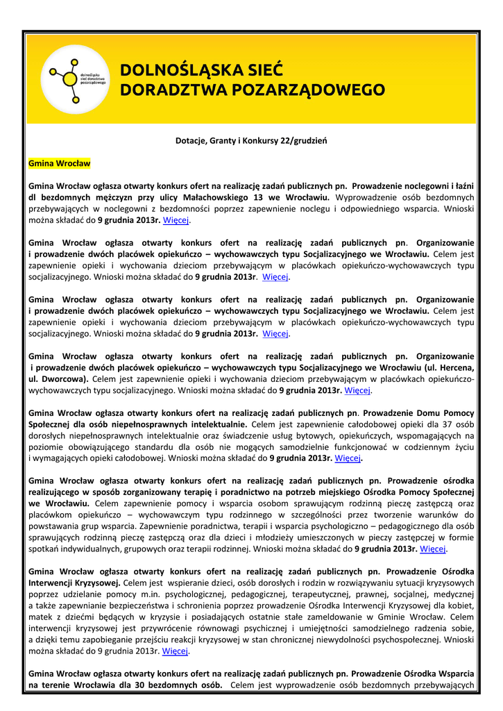 Dotacje, Granty i Konkursy 22/grudzień Gmina Wrocław Gmina Wrocław ogłasza otwarty konkurs ofert na realizację zadań publicznych pn. Prowadzenie noclegowni i łaźni dl bezdomnych mężczyzn przy ulicy Małachowskiego 13 we Wrocławiu. Wyprowadzenie osób bezdomnych przebywających w noclegowni z bezdomności poprzez zapewnienie noclegu i odpowiedniego wsparcia. Wnioski można składać do 9 grudnia 2013r. Więcej. Gmina Wrocław ogłasza otwarty konkurs ofert na realizację zadań publicznych pn. Organizowanie i prowadzenie dwóch placówek opiekuńczo – wychowawczych typu Socjalizacyjnego we Wrocławiu. Celem jest zapewnienie opieki i wychowania dzieciom przebywającym w placówkach opiekuńczo-wychowawczych typu socjalizacyjnego. Wnioski można składać do 9 grudnia 2013r. Więcej. Gmina Wrocław ogłasza otwarty konkurs ofert na realizację zadań publicznych pn. Organizowanie i prowadzenie dwóch placówek opiekuńczo – wychowawczych typu Socjalizacyjnego we Wrocławiu. Celem jest zapewnienie opieki i wychowania dzieciom przebywającym w placówkach opiekuńczo-wychowawczych typu socjalizacyjnego. Wnioski można składać do 9 grudnia 2013r. Więcej. Gmina Wrocław ogłasza otwarty konkurs ofert na realizację zadań publicznych pn. Organizowanie i prowadzenie dwóch placówek opiekuńczo – wychowawczych typu Socjalizacyjnego we Wrocławiu (ul. Hercena, ul. Dworcowa). Celem jest zapewnienie opieki i wychowania dzieciom przebywającym w placówkach opiekuńczowychowawczych typu socjalizacyjnego. Wnioski można składać do 9 grudnia 2013r. Więcej. Gmina Wrocław ogłasza otwarty konkurs ofert na realizację zadań publicznych pn. Prowadzenie Domu Pomocy Społecznej dla osób niepełnosprawnych intelektualnie. Celem jest zapewnienie całodobowej opieki dla 37 osób dorosłych niepełnosprawnych intelektualnie oraz świadczenie usług bytowych, opiekuńczych, wspomagających na poziomie obowiązującego standardu dla osób nie mogących samodzielnie funkcjonować w codziennym życiu i wymagających opieki całodobowej. Wnioski można składać do 9 grudnia 2013r. Więcej. Gmina Wrocław ogłasza otwarty konkurs ofert na realizację zadań publicznych pn. Prowadzenie ośrodka realizującego w sposób zorganizowany terapię i poradnictwo na potrzeb miejskiego Ośrodka Pomocy Społecznej we Wrocławiu. Celem zapewnienie pomocy i wsparcia osobom sprawującym rodzinną pieczę zastępczą oraz placówkom opiekuńczo – wychowawczym typu rodzinnego w szczególności przez tworzenie warunków do powstawania grup wsparcia. Zapewnienie poradnictwa, terapii i wsparcia psychologiczno – pedagogicznego dla osób sprawujących rodzinną pieczę zastępczą oraz dla dzieci i młodzieży umieszczonych w pieczy zastępczej w formie spotkań indywidualnych, grupowych oraz terapii rodzinnej. Wnioski można składać do 9 grudnia 2013r. Więcej. Gmina Wrocław ogłasza otwarty konkurs ofert na realizację zadań publicznych pn. Prowadzenie Ośrodka Interwencji Kryzysowej. Celem jest wspieranie dzieci, osób dorosłych i rodzin w rozwiązywaniu sytuacji kryzysowych poprzez udzielanie pomocy m.in. psychologicznej, pedagogicznej, terapeutycznej, prawnej, socjalnej, medycznej a także zapewnianie bezpieczeństwa i schronienia poprzez prowadzenie Ośrodka Interwencji Kryzysowej dla kobiet, matek z dziećmi będących w kryzysie i posiadających ostatnie stałe zameldowanie w Gminie Wrocław. Celem interwencji kryzysowej jest przywrócenie równowagi psychicznej i umiejętności samodzielnego radzenia sobie, a dzięki temu zapobieganie przejściu reakcji kryzysowej w stan chronicznej niewydolności psychospołecznej. Wnioski można składać do 9 grudnia 2013r. Więcej. Gmina Wrocław ogłasza otwarty konkurs ofert na realizację zadań publicznych pn. Prowadzenie Ośrodka Wsparcia na terenie Wrocławia dla 30 bezdomnych osób. Celem jest wyprowadzenie osób bezdomnych przebywających w ośrodku wsparcia z bezdomności poprzez zapewnienie schronienia i odpowiedniego wsparcia. Wnioski można składać do 9 grudnia 2013r. Więcej. Gmina Wrocław ogłasza otwarty konkurs ofert na realizację zadań publicznych pn. Prowadzenie Schroniska na terenie Wrocławia dla (maksymalnie 60) bezdomnych kobiet, kobiet z dziećmi oraz noclegowni dla (maksymalnie 16) bezdomnych kobiet. Celem jest wyprowadzenie osób bezdomnych przebywających w schronisku i noclegowni z bezdomności poprzez zapewnienie schronienia i odpowiedniego wsparcia. Wnioski można składać do 9 grudnia 2013r. Więcej. Gmina Wrocław ogłasza otwarty konkurs ofert na realizację zadań publicznych pn. Organizowanie i prowadzenie środowiskowego Domu Samopomocy Typy A. Celem jest wspieranie 25 osób z zaburzeniami psychicznymi i ich rodzin oraz kompensowanie skutków niepełnosprawności w sferze zdrowia psychicznego, a także propagowanie modelu zdrowej rodziny poprzez prowadzenie Środowiskowego Domu Samopomocy typu A. Wnioski można składać do 9 grudnia 2013r. Więcej. Gmina Wrocław ogłasza otwarty konkurs ofert na realizację zadań publicznych pn. Prowadzenie dwóch schronisk dla 120 i 95 (przebywających w jednym czasie) bezdomnych mężczyzn. Wyprowadzenie osób bezdomnych przebywających w schroniskach z bezdomności poprzez zapewnienie schronienia i odpowiedniego wsparcia. Wnioski można składać do 9 grudnia 2013r. Więcej. Gmina Wrocław ogłasza otwarty konkurs ofert na realizację zadań publicznych pn. zespołu mieszkań chronionych na 60 miejsc dla kobiet, matek z dziećmi oraz kobiet w ciąży. Celem jest Wsparcie kobiet, matek z dziećmi, kobiet w ciąży, które ze względu na trudną sytuację życiową, wiek, niepełnosprawność lub przewlekłą chorobę potrzebują wsparcia w funkcjonowaniu w codziennym życiu poprzez organizowanie i prowadzenie zespołu mieszkań chronionych na 60 miejsc we Wrocławiu. Wnioski można składać do 9 rudnia 2013r. Więcej. Gmina Wrocław ogłasza otwarty konkurs ofert na realizacj