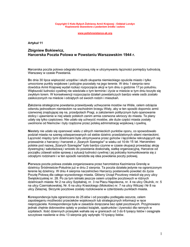 Copyright © Koło Byłych Żołnierzy Armii Krajowej - Oddział Londyn Kopiowanie dozwolone z podaniem źródła i autora www.polishresistance-ak.org Artykuł 11 Zbigniew Bokiewicz, Harcerska Poczta Polowa w Powstaniu Warszawskim 1944 r. Harcerska poczta polowa odegrała kluczową rolę w utrzymywaniu łączności pomiędzy ludnością Warszawy w czasie Powstania. Do dnia 30 lipca większość urzędów i służb okupanta niemieckiego opuściła miasto i tylko umocnione punkty wojskowe i policyjne pozostały na jego terenie. W dniu 1 sierpnia rano dowódca Armii Krajowej wydał rozkaz rozpoczęcia akcji w tym dniu o godzinie 17 po południu. Większość ludności cywilnej nie wiedziała o tym terminie i życie w mieście w tym dniu toczyło się zwykłym torem. W konsekwencji rozpoczęcia działań powstańczych bardzo wiele osób zostało zaskoczonych na mieście i odciętych od swoich rodzin i mieszkań. Założenia strategiczne powstania przewidywały uchwycenie mostów na Wiśle, celem odcięcia odwrotu jednostkom niemieckim na wschodnim brzegu Wisły, aby w ten sposób dopomóc armii czerwonej znajdującej się na, przedpolach Pragi, a założeniem politycznym było opanowanie stolicy i ujawnienie w niej władz polskich zanim armia czerwona wkroczy do miasta. Te plany udały się tylko częściowo. Nie udało się uchwycić mostów, ale duże części miasta zostały uwolnione od Niemców i były rządzone przez polską administrację wojskową i cywilną. Niestety nie udało się opanować wielu z silnych niemieckich punktów oporu, co spowodowało podział miasta na szereg odseparowanych od siebie dzielnic przedzielonych siłami niemieckimi. Łączność między tymi dzielnicami była utrzymywana przez gońców i łączników rekrutujących się przeważnie z harcerzy i harcerek z „Szarych Szeregów" w wieku od 10 do 15 lat. Harcerstwo polskie pod nazwą „Szarych Szeregów'' było bardzo czynne w czasie okupacji prowadząc akcję dywersyjną i sabotażową i wniosło do powstania doskonałą, siatkę organizacyjną. Harcerze od początku zdawali sobie sprawę z sytuacji ludności cywilnej i jej potrzeby komunikowania się z odciętymi rodzinami i w ten sposób narodziła się idea powołania poczty polowej. Pierwsza poczta polowa została zorganizowana przez harcmistrza Kazimierza Grendę w dzielnicy Śródmieście-Południe już w dniu 2 sierpnia. Ta poczta działała jedynie na ograniczonym terenie tej dzielnicy. W dniu 4 sierpnia naczelnictwo Harcerzy postanowiło powołać do życia Pocztę Polową dla całego wyzwolonego miasta. Główny Urząd Pocztowy mieścił się przy ulicy Świętokrzyskiej nr. 28. Po za tym istniało jeszcze osiem urzędów pocztowych w różnych dzielnicach miasta: Nr.2 na ulicy Szpitalnej, nr. 3 na Placu Napoleona, nr. 4 na ulicy Okulnik, nr. 5 na ulicy Czerniakowskiej, Nr. 6 na ulicy Krasickiego (Mokotów) nr. 7 na ulicy Wilczej i Nr 8 na ulicy Żelaznej. Skrzynki pocztowe zostały rozlokowane w czterdziestu punktach miasta. Korespondencja była ograniczona do 25 słów i od początku podlegała cezurze, celem zapobieganiu możliwości przecieków wojskowych lub strategicznych informacji w ręce nieprzyjaciela. Korespondencja była w zasadzie doręczana bez opłat pocztowych. Przyjmowano jednak chętnie dobrowolne opłaty w postaci książek, opatrunków i żywności dla rannych w szpitalach. Ilość dziennych przesyłek wahała się w granicach od 3 do 6 tysięcy listów i osiągnęła szczytowe nasilenie w dniu 13 sierpnia gdy wpłynęło 10 tysięcy listów. 1 Przez kilka pierwszych dni nie było żadnych pieczątek pocztowych. Pojawiły się one w dniu 6go sierpnia i miały napis w kole „Poczta harcerska" i lilijkę harcerską. Do ich produkcji używano różnych materiałów. Jedna z pierwszych była wycięta z przepołowionego kartofla, w którym scyzorykiem wyżłobiono napis Poczta Harcerska i lilijkę. Ta pieczątka po kilkakrotnym użyciu rozpadła się i należy dzisiaj do białych kruków. Inne były wycięte z linoleum, kauczuku i miękkich metali. W drugim miesiącu Powstańcza Poczta Harcerska, została wraz z całym personelem wcielona do AK i od tego czasu napis „Poczta Harcerska" został zastąpiony napisem „Poczta Polowa". W tym też miesiącu ukazały definitywne znaczki Poczty Polowej w pięciu kolorach dla pięciu dzielnic Warszawy. Działalność Poczty Polowej została zakończona w dniu 3 października dniu kapitulacji Warszawy. Zalążek mojego zbioru powstał w latach 1957 - 1964 i od tego czasu jest on stale uzupełniany w miarę zdobywania nowego materiału. Pierwsza partia listów Poczty Harcerskiej trafiła do mych rąk w dość niezwykły sposób. W roku 1956 w czasie odgruzowywania ruin Poczty Głównej od strony ulicy Wareckiej robotnicy znaleźli szkielet harcerza z torbą listonosza zawierającą kilkaset niedoręczonych listów z okresu Powstania. Listy te zanieśli do znanego kupca filatelistycznego p. K. de Juliena celem ich spieniężenia. P. de Julien, który stracił syna w Powstaniu, listy te kupił, a następnie sporządził ich spis z nazwiskami nadawców i odbiorców i ogłosił w popularnej prasie warszawskiej ustalając 3 miesięczny termin ich odbioru. Większa część z nich została odebrana, a z pozostałej części kilkanaście trafiło do moich rąk stając się początkiem mego zbioru. Zbiór ten uzupełniany na przestrzeni lat, poza wartością filatelistyczną ma dużą wartość historyczną. Ze względu na treść listów, które malują obraz powstania, widziany oczami ich uczestników, zarówno żołnierzy AK jak i ludności cywilnej, a nawet żołnierza niemieckiego walczącego przeciwko nam. Jeden z listów datowany 7 sierpnia zawiera dramatyczny opis pędzenia ludności cywilnej przed czołgami niemieckimi na pozycje polskie. Ocalał również list pisany przeze mnie do matki, która mi go przywiozła w roku 1957. Ostatnio pokazano mi w Warszawie fotokopię listu pisanego d