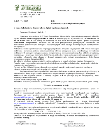 Warszawa, dn. 23 lutego 2017 r. ul. Długa 16, 00-238 Warszawa tel. 635-45-54, 831-38-58 fax. 635-27-72 L.DZ. 71/ 2017 P.T. Kierownicy Aptek Ogólnodostępnych V Sesja Szkoleniowa Kierowników Aptek Ogólnodostępnych Szanowne Koleżanki i Koledzy ! Uprzejmie informujemy, iż V Sesja Szkoleniowa Kierowników Aptek Ogólnodostępnych odbędzie się w Centrum Konferencyjnym GREEN PARK w Serocku przy ul. Wyzwolenia 63, w terminie od 25 do 26 marca 2017 r. (od soboty do niedzieli). W tym roku poświęcona będzie przede wszystkim ratownictwu medycznemu. Szkolenie ma na celu przygotowanie potencjalnych ratowników do prowadzenia podstawowych zabiegów resuscytacyjnych oraz obsługi automatycznych defibrylatorów zewnętrznych Podzielone jest na część teoretyczną obejmującą zagadnienia związane z algorytmem BSL i AED oraz część praktyczną – ćwiczenia, podczas których uczestnicy zdobędą umiejętność m.in.: samodzielnego prowadzenia podstawowych zabiegów ratujących życie, postępowania z osobą nieprzytomną, bez oddechu i krążenia, bezpiecznego i sprawnego stosowania defibrylatora AED, stosowania zastępczej wentylacji, postępowania w przypadku obecności ciała obcego w drogach oddechowych, obsługi automatycznego defibrylatora zewnętrznego wraz z elementami BLS. Za udział w szkoleniu można uzyskać 4 punkty edukacyjne w ramach szkolenia ciągłego farmaceutów. Ponadto każdy z uczestników otrzyma niezależnie imienny certyfikat poświadczający ukończenie szkolenia z zakresu pierwszej pomocy. Z uwagi na fakt , iż będą Państwo aktywnie uczestniczyć w części praktycznej, uprzejmie prosimy o zabranie strojów sportowych – nie krępujących ruchów. Zaplanowaliśmy również posiedzenia naukowo-szkoleniowe z zakresu gastroenterologii dziecięcej a także dietetyki. Będą mogli Państwo skorzystać z indywidualnych bezpłatnych konsultacji z dietetykami Zbiórka w dniu wyjazdu (sobota 25 marca) o godz. 7.30 na parkingu przy ul. Świętojerskiej, obok ambasady Chin w Warszawie. Wyjazd autobusu najpóźniej o godz. 8.00. Powrót do Warszawy w niedzielę 26 marca ok. godz. 16.00 (wyjazd z Serocka po obiedzie ok. godz. 14.50). Warunki uczestnictwa w Sesji. Za udział w Sesji: zakwaterowanie, wyżywienie członkowie Izby wnoszą jedynie symboliczną opłatę w wysokości 123 zł . Udział w posiedzeniach naukowo-szkoleniowych oraz indywidualnych konsultacjach jest bezpłatny. Zgłoszenia na sesję prosimy przesłać pocztą, faxem (22 635- 27-72) lub e-mailem: [email protected] najpóźniej do poniedziałku 13 marca. Opłaty gotówką (123 zł.) przyjmowane będą w biurze Izby do piątku 10 marca br. W pierwszej połowie marca program Sesji będzie zamieszczony na stronie internetowej www.warszawa.oia.org.pl w zakładce „aktualności”. Szczegółowy program otrzymają Państwo w dniu wyjazdu. Przed złożeniem karty zgłoszenia prosimy o uregulowanie składek członkowskich (co najmniej do lutego 2017 r.) w biurze Izby lub przelewem na konto: 21 1240 1138 1111 0000 0209 2153 Kwotę zaległości można sprawdzić telefonicznie u p. Bożeny Olech (tel. 785 66 - 55 – 17) UWAGA !!! W związku z wyjazdem na V Sesję Szkoleniową, w marcu nie odbędzie się czwartkowe spotkanie Komisji. Załącznik: - karta zgłoszenia na Sesję Prezes Okręgowej Rady Aptekarskiej mgr farm. Michał Byliniak