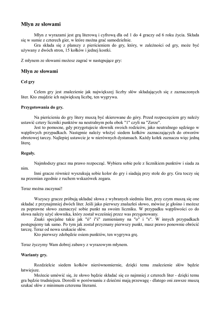Młyn ze słowami Młyn z wyrazami jest grą literową i cyfrową dla od 1 do 4 graczy od 6 roku życia. Składa się w sumie z czterech gier, w które można grać samodzielnie. Gra składa się z planszy z pierścieniem do gry, który, w zależności od gry, może być używany z dwóch stron, 15 kołków i jednej kostki. Z młynem ze słowami możesz zagrać w następujące gry: Młyn ze słowami Cel gry Celem gry jest znalezienie jak największej liczby słów składających się z zaznaczonych liter. Kto znajdzie ich największą liczbę, ten wygrywa. Przygotowania do gry. Na pierścieniu do gry litery muszą być skierowane do góry. Przed rozpoczęciem gry należy ustawić cztery liczniki punktów na neutralnym polu obok "1" czyli na "Zerze". Jest to pomocne, gdy przygotujecie słownik swoich rodziców, jako neutralnego sędziego w wątpliwych przypadkach. Następnie należy włożyć siedem kołków zaznaczających do otworów obrotowej tarczy. Najlepiej ustawcie je w nierównych dystansach. Każdy kołek zaznacza więc jedną literę. Reguły. Najmłodszy gracz ma prawo rozpocząć. Wybiera sobie pole z licznikiem punktów i siada za nim. Inni gracze również wyszukują sobie kolor do gry i siadają przy stole do gry. Gra toczy się na przemian zgodnie z ruchem wskazówek zegara. Teraz można zaczynać! Wszyscy gracze próbują układać słowa z wybranych siedmiu liter, przy czym muszą się one składać z przynajmniej dwóch liter. Jeśli jako pierwszy znalazłeś słowo, mówisz je głośno i możesz za poprawne słowo zaznaczyć sobie punkt na swoim liczniku. W przypadku wątpliwości co do słowa należy użyć słownika, który został wcześniej przez was przygotowany. Znaki specjalne takie jak "ó" i"ś" zamieniamy na "o" i "s". W innych przypadkach postępujemy tak samo. Po tym jak został przyznany pierwszy punkt, masz prawo ponownie obrócić tarczę. Teraz od nowa szukacie słów. Kto pierwszy zdobędzie osiem punktów, ten wygrywa grę. Teraz życzymy Wam dobrej zabawy z wyrazowym młynem. Warianty gry. Rozdzielcie siedem kołków nierównomiernie, dzięki temu znalezienie słów będzie łatwiejsze. Możecie umówić się, że słowo będzie składać się co najmniej z czterech liter - dzięki temu gra będzie trudniejsza. Dorośli w porównaniu z dziećmi mają przewagę - dlatego oni zawsze muszą szukać słów z minimum czterema literami. Express ze słowami. W drugiej grze - "Ekspresie ze słowami" chodzi o szybkość! Przygotowania do gry. Tak samo jak w "Młynie ze słowami". Dodatkowo potrzebujecie kostki. Reguły. Znowu chodzi o to aby z siedmiu zaznaczonych liter ułożyć słowa. Rozpoczyna najmłodszy gracz i usiłuje ułożyć słowo z co najmniej trzech wylosowanych liter. Jeśli takie słowo znalazłeś musisz je głośno powiedzieć. Za każde ułożone słowo otrzymujesz jeden punkt. Masz jednak ograniczony czas na szukanie. Następny gracz rzuca kostką, podczas gdy ty rozmyślasz. Jeśli wyrzuci on kostką "6" to Twój czas się kończy. Jeśli to tego momentu nie znalazłeś słowa, to nie otrzymujesz punktu a kolejka przechodzi do następnego gracza. Wygrywa ten, kto pierwszy uzbiera 8 punktów. Warianty gry - podobnie jak w Młynie ze słowami w grze możecie zmieniać liczbę kołków i konieczną liczbę liter. Każdemu graczowi przysługuje ten sam czas na znalezienie słowa, na przykład jedna minuta. Puzzle słowne. Cel gry. Podobnie jak w innych grach, wygrywa ten kto pierwszy zdobędzie osiem punktów. Reguły. Jednocześnie z innymi graczami próbujesz ułożyć co najmniej trójliterowe słowa z zaznaczonych liter. Ułożone słowa nie są jednak natychmiast wymawiane ale zapisane i ukryte, tak aby żaden z innych graczy nie mógł przeczytać twoich słów. Wyszukiwanie słów kończy się wtedy, gdy minie wcześniej uzgodniony czas albo gdy wszyscy gracze stwierdzą, że wyszukiwanie jest już zakończone. Teraz pokazujecie swoje listy wyrazów i liczycie punkty jak następuje: - 2 punkty otrzymujesz za każde słowo, które znalazłeś tylko ty - 1 punkt otrzymujesz za słowo, które masz wspólne z innymi graczami, ale nie ze wszystkimi, - nie dostajesz żadnego punktu za słowo, które mają wszyscy gracze. Punkty zaznacza się na polu na punkty. Następnie najmłodszy gracz ma prawo rzucić kostką i przekręcić tarczę tyle razy ile wyrzucił oczek. Grę wygrywa ten, kto jako pierwszy zdobędzie osiem punktów, które są notowane na polu punktów. MISTRZ LICZENIA. Przygotowania do gry. Z drugiej strony pierścienia z literami znajdują się cyfry. W grze w Mistrza liczenia u góry muszą znajdować się cyfry. Cel gry. Wynik zabawy w mistrza liczenia jest ustalony: poprzez dodawanie i odejmowanie musicie uzyskać "24" jako końcowy wynik działania. Zwycięzcą gry jest ten, kto jako pierwszy ośmiokrotnie wykona trafne działanie. Reguły. Należy w dowolny sposób zaznaczyć cztery cyfry i dowolnie przekręcić tarczę. Jeśli uda Ci się jako pierwszemu poprzez odejmowanie i dodawanie wylosowanych liczb uzyskać wynik 24, masz prawo przyznać sobie jeden punkt. Na przykład: zaznaczone są liczby 1, 7, 12 i 30, można zatem ułożyć równanie: 30 - 7 + 1 = 24. Nie trzeba zatem używać wszystkich zaznaczonych liczb, każdą jednak można użyć tylko raz. Otrzymujesz punkt, jeśli jako pierwszy znajdziesz prawidłowe działanie. Dotyczy to również przypadku, gdy znacznik trafi na 24. W następnej rundzie najmłodszy gracz może rzucić kostką i obrócić tarczę tyle razy ile wyrzucił oczek na kostce. Również w przypadku, gdy wszyscy gracze zgodzą się, że z wylosowanych liczb nie uda się ułożyć prawidłowego równania, tarczę należy obrócić tyle razy ile zostało wylosowanych oczek na kostce. Warianty gry. Jeśli użyje się większej liczby kołków łatwiej jest znaleźć odpowiednie równanie. Jeśli wszyscy jesteście dobrzy w dodawaniu i odejmowaniu dla utrudnienia możecie zacząć używać dziel