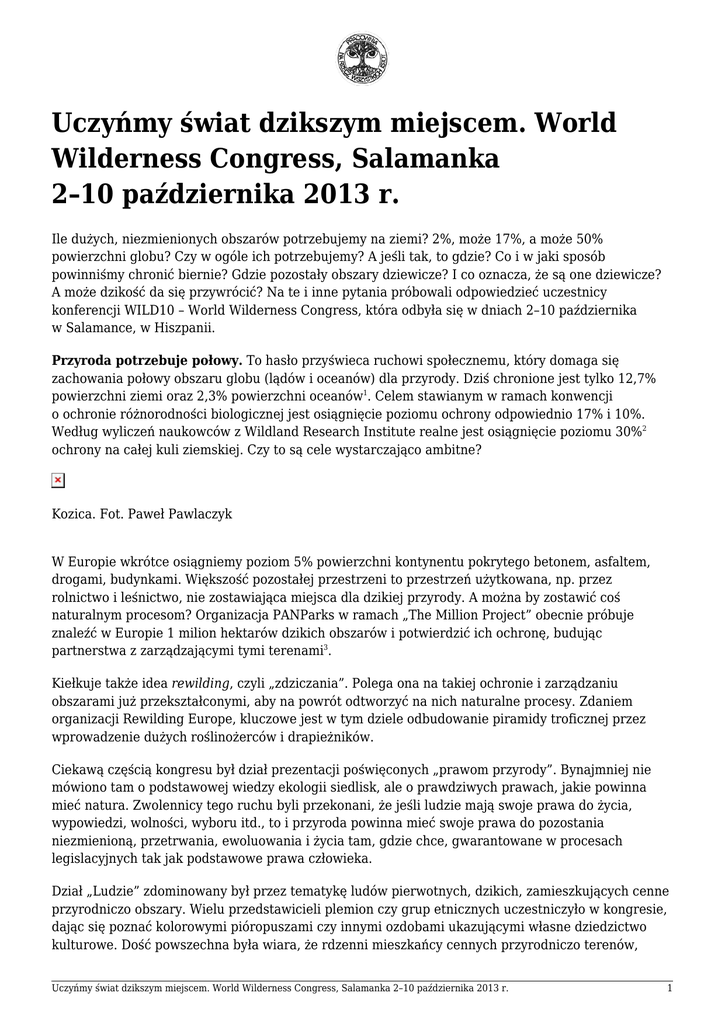 Uczyńmy świat dzikszym miejscem. World Wilderness Congress, Salamanka 2–10 października 2013 r. Ile dużych, niezmienionych obszarów potrzebujemy na ziemi? 2%, może 17%, a może 50% powierzchni globu? Czy w ogóle ich potrzebujemy? A jeśli tak, to gdzie? Co i w jaki sposób powinniśmy chronić biernie? Gdzie pozostały obszary dziewicze? I co oznacza, że są one dziewicze? A może dzikość da się przywrócić? Na te i inne pytania próbowali odpowiedzieć uczestnicy konferencji WILD10 – World Wilderness Congress, która odbyła się w dniach 2–10 października w Salamance, w Hiszpanii. Przyroda potrzebuje połowy. To hasło przyświeca ruchowi społecznemu, który domaga się zachowania połowy obszaru globu (lądów i oceanów) dla przyrody. Dziś chronione jest tylko 12,7% powierzchni ziemi oraz 2,3% powierzchni oceanów1. Celem stawianym w ramach konwencji o ochronie różnorodności biologicznej jest osiągnięcie poziomu ochrony odpowiednio 17% i 10%. Według wyliczeń naukowców z Wildland Research Institute realne jest osiągnięcie poziomu 30%2 ochrony na całej kuli ziemskiej. Czy to są cele wystarczająco ambitne? Kozica. Fot. Paweł Pawlaczyk W Europie wkrótce osiągniemy poziom 5% powierzchni kontynentu pokrytego betonem, asfaltem, drogami, budynkami. Większość pozostałej przestrzeni to przestrzeń użytkowana, np. przez rolnictwo i leśnictwo, nie zostawiająca miejsca dla dzikiej przyrody. A można by zostawić coś naturalnym procesom? Organizacja PANParks w ramach „The Million Project” obecnie próbuje znaleźć w Europie 1 milion hektarów dzikich obszarów i potwierdzić ich ochronę, budując partnerstwa z zarządzającymi tymi terenami3. Kiełkuje także idea rewilding, czyli „zdziczania”. Polega ona na takiej ochronie i zarządzaniu obszarami już przekształconymi, aby na powrót odtworzyć na nich naturalne procesy. Zdaniem organizacji Rewilding Europe, kluczowe jest w tym dziele odbudowanie piramidy troficznej przez wprowadzenie dużych roślinożerców i drapieżników. Ciekawą częścią kongresu był dział prezentacji poświęconych „prawom przyrody”. Bynajmniej nie mówiono tam o podstawowej wiedzy ekologii siedlisk, ale o prawdziwych prawach, jakie powinna mieć natura. Zwolennicy tego ruchu byli przekonani, że jeśli ludzie mają swoje prawa do życia, wypowiedzi, wolności, wyboru itd., to i przyroda powinna mieć swoje prawa do pozostania niezmienioną, przetrwania, ewoluowania i życia tam, gdzie chce, gwarantowane w procesach legislacyjnych tak jak podstawowe prawa człowieka. Dział „Ludzie” zdominowany był przez tematykę ludów pierwotnych, dzikich, zamieszkujących cenne przyrodniczo obszary. Wielu przedstawicieli plemion czy grup etnicznych uczestniczyło w kongresie, dając się poznać kolorowymi pióropuszami czy innymi ozdobami ukazującymi własne dziedzictwo kulturowe. Dość powszechna była wiara, że rdzenni mieszkańcy cennych przyrodniczo terenów, Uczyńmy świat dzikszym miejscem. World Wilderness Congress, Salamanka 2–10 października 2013 r. 1 dzięki tradycyjnej wiedzy i umiejętnościom przekazywanym z pokolenia na pokolenie, mieliby być lepszymi ich zarządcami, niż jakikolwiek naukowiec czy ekolog. Podawano wiele przykładów z całego świata, gdzie ten system świetnie się sprawdza i mieszkańcy żyją w równowadze, użytkując zasoby tylko w takiej ilości, w jakiej mogą się one odnawiać. We wszystkich prezentacjach panował swoisty kult ludów pierwotnych, zapominano jednak o wielu sytuacjach, gdzie mieszkańcy doprowadzili do wytrzebienia gatunków czy wyniszczenia siedlisk (np. wycinka lasów na wyspie Wielkanocnej). Grupą, która skupiała na sobie uwagę, byli – poza rdzennymi mieszkańcami wszystkich kontynentów – młodzi specjaliści ochrony przyrody. Brali oni udział w organizacji kongresu oraz prowadzili całą sekcję prezentacji pod hasłem: CoalitionWILD. Ma być to grupa młodych specjalistów, przyszłych liderów ochrony przyrody z całego świata, która wzajemnie się wspiera, wymienia doświadczeniami i wiedzą. Spora część wystąpień dotyczyła możliwości zarabiania na obszarach dzikich, tworzenia lokalnych biznesów opartych na tradycji czy zrównoważonej turystyce przyrodniczej. Wiele było także wystąpień na temat zrównoważonej turystyki, pokazujących przykłady z parków narodowych w Europie, jak np. fińska Oulanka czy włoska Majella. Seminarium organizacji i firmy Rewilding Europe pokazywało, w jaki sposób mieszkańcy dziczejących terenów mogą zarabiać poprzez promowanie lokalnych produktów spożywczych i rękodzielniczych, zakładanie restauracji i hoteli. Niestety nie trafiłam na prezentacje o wartości dzikiej, niezmienionej przyrody, nieocenianej w kategoriach pieniężnych. Jeśli nawet w swoim gronie, ochroniarzy przyrody, bazujemy na ekonomicznej wartości dzikiej przyrody, to czy naprawdę jesteśmy przekonani, że zachowanie wszystkich gatunków i ich siedlisk jest naszym obowiązkiem i odpowiedzialnością tak po prostu, dlatego, że są? Organizatorzy zadbali także o emocjonalną i kulturalną warstwę, planując codzienne koncerty, pokazy filmów i spektakli, wystawy fotografii grupy Wild Wonders of Europe oraz związku fotografów przyrodniczych czy wystawy znanej młodej artystki Asher Jay, zaangażowanej w tematykę ochrony przyrody. Monika Kotulak Monika Kotulak – od 2 lat pracowniczka Klubu Przyrodników, obecnie także stypendystka programu Klausa Toepfera dla przyszłych liderów ochrony przyrody, chce się zajmować wdrażaniem idei wilderness w Polsce. *** Uczyńmy świat dzikszym miejscem… Światowy kongres Wilderness tym razem tak blisko – w hiszpańskiej Salamance. Taka okazja długo się nie powtórzy, trzeba więc tę wykorzystać, być, poczuć się częścią wspólnoty, dla której „dzikość” jest ważna. Tym razem organizatorzy wybrali Europę, dostrzegając, że – paradoksalnie 