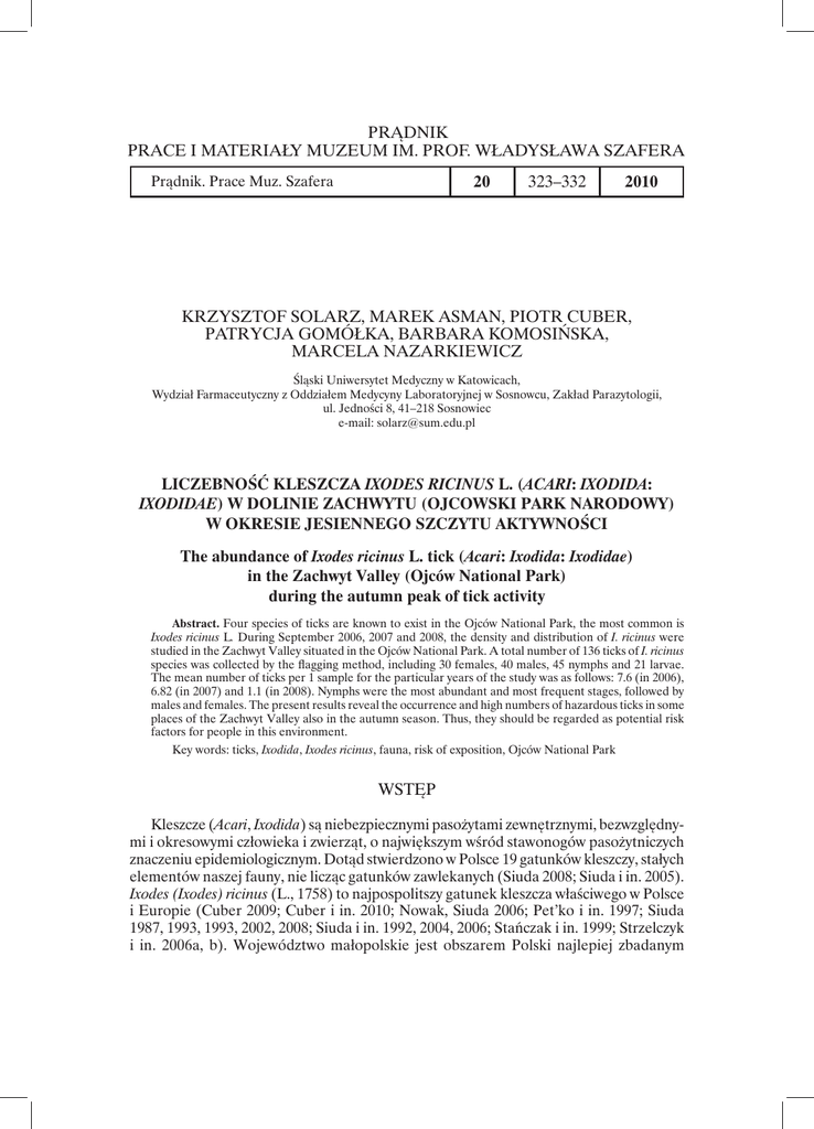 PRĄDNIK PRACE I MATERIAŁY MUZEUM IM. PROF. WŁADYSŁAWA SZAFERA 20 Prądnik. Prace Muz. Szafera 323–332 2010 Krzysztof Solarz, Marek Asman, Piotr Cuber, Patrycja Gomółka, Barbara Komosińska, Marcela Nazarkiewicz Śląski Uniwersytet Medyczny w Katowicach, Wydział Farmaceutyczny z Oddziałem Medycyny Laboratoryjnej w Sosnowcu, Zakład Parazytologii, ul. Jedności 8, 41–218 Sosnowiec e-mail: [email protected] Liczebność kleszcza Ixodes ricinus l. (Acari: Ixodida: Ixodidae) w dolinie Zachwytu (Ojcowski Park Narodowy) w okresie jesiennego szczytu aktywności The abundance of Ixodes ricinus L. tick (Acari: Ixodida: Ixodidae) in the Zachwyt Valley (Ojców National Park) during the autumn peak of tick activity Abstract. Four species of ticks are known to exist in the Ojców National Park, the most common is Ixodes ricinus L. During September 2006, 2007 and 2008, the density and distribution of I. ricinus were studied in the Zachwyt Valley situated in the Ojców National Park. A total number of 136 ticks of I. ricinus species was collected by the flagging method, including 30 females, 40 males, 45 nymphs and 21 larvae. The mean number of ticks per 1 sample for the particular years of the study was as follows: 7.6 (in 2006), 6.82 (in 2007) and 1.1 (in 2008). Nymphs were the most abundant and most frequent stages, followed by males and females. The present results reveal the occurrence and high numbers of hazardous ticks in some places of the Zachwyt Valley also in the autumn season. Thus, they should be regarded as potential risk factors for people in this environment. Key words: ticks, Ixodida, Ixodes ricinus, fauna, risk of exposition, Ojców National Park Wstęp Kleszcze (Acari, Ixodida) są niebezpiecznymi pasożytami zewnętrznymi, bezwzględnymi i okresowymi człowieka i zwierząt, o największym wśród stawonogów pasożytniczych znaczeniu epidemiologicznym. Dotąd stwierdzono w Polsce 19 gatunków kleszczy, stałych elementów naszej fauny, nie licząc gatunków zawlekanych (Siuda 2008; Siuda i in. 2005). Ixodes (Ixodes) ricinus (L., 1758) to najpospolitszy gatunek kleszcza właściwego w Polsce i Europie (Cuber 2009; Cuber i in. 2010; Nowak, Siuda 2006; Pet’ko i in. 1997; Siuda 1987, 1993, 1993, 2002, 2008; Siuda i in. 1992, 2004, 2006; Stańczak i in. 1999; Strzelczyk i in. 2006a, b). Województwo małopolskie jest obszarem Polski najlepiej zbadanym 324 K. Solarz, M. Asman, P. Cuber, P. Gomółka, B Komosińska, M. Nazarkiewicz pod względem występowania tego gatunku (Siuda i in. 2001 a, b; Nowak i in. 2009). W przypadku Wyżyny Krakowsko-Częstochowskiej dotychczasowe badania wykazały, że kleszcz pospolity I. ricinus występuje najliczniej w jej południowej części (Siuda i in. 1992, 2001a, b, 2004; Nowak i in. 2009). Fauna kleszczy na terenie parków narodowych Polski jest bardzo słabo zbadana w porównaniu z innymi grupami roztoczy (Napierała i in. 2006). Spośród pięciu parków narodowych województwa małopolskiego, Ojcowski Park Narodowy (OPN) został najlepiej zbadany pod względem występowania i liczebności kleszczy (Siuda 1990; Siuda i in. 1991, 1992, 2004; Nowak, Siuda 2006). Na obszarze tego Parku stwierdzono dotąd 4 gatunki kleszczy właściwych; oprócz kleszcza pospolitego są to gatunki Ixodes (Exopalpiger) trianguliceps Birula, 1895, Ixodes (Pholeoixodes) hexagonus Leach, 1815 oraz Ixodes (Eschatocephalus) vespertilionis Koch, 1844 (Rafalski 1977; Pawlik i in. 1973; Siuda, Pawlik 1971; Siuda i in. 1972; Siuda 1990; Nowak, Siuda 2006). Pod koniec lat 80. XX w. występowanie I. ricinus notowano na całym obszarze OPN. Najliczniejsze występowanie tego gatunku stwierdzono w Dolinie Zachwytu (Siuda i in. 1992; Solarz i in. 2007). Dlatego też na obszarze tej Doliny przeprowadziliśmy badania nad liczebnością I. ricinus w okresie jesiennego szczytu aktywności kleszczy. Należy podkreślić, że w Europie, także w Polsce, kleszcz I. ricinus stanowi potencjalne zagrożenie dla turystów, zbieraczy runa leśnego, a także dla pracowników leśnictwa, rolników, osób związanych z eksploatacją lasu i ochroną przyrody (Dutkiewicz 1998; Cisak 2003). Jest nie tylko niebezpiecznym dla człowieka i zwierząt pasożytem okresowym, ale także rezerwuarem i wektorem wielu patogenów, m.in. wirusów kleszczowego zapalenia mózgu i opon mózgowo-rdzeniowych (KZM), wirusów choroby skokowej owiec, riketsji gorączki Q (Coxiella burnetti), riketsji z rodzajów Anaplasma i Ehrlichia, krętków wywołujących krętkowicę kleszczową (boreliozę) z Lyme (Borrelia burgdorferi sensu lato), pałeczek tularemii (Francisella tularensis), pierwotniaków Babesia, Theileria i Toxoplasma gondii (Dutkiewicz 1998; Cisak i in. 2005; Derdáková i in. 2003; Christowa, Gladnishka 2005; Magnarelli i in. 1995; Wodecka 2003; Tylewska-Wierzbanowska i in. 2001; Siuda 1991, 2002, 2008; Skotarczak i in. 2002, 2004, 2008; Stańczak i in. 2002). Miejsce badań, materiał i metodyka Badania przeprowadzono w północnej części Doliny Zachwytu na terenie Ojcowskiego Parku Narodowego we wrześniu 2006, 2007 i 2008 r. w okresie jesiennego szczytu aktywności kleszczy w poszukiwaniu żywiciela (Siuda i in. 2001a). Zastosowano metodę flagowania (Szymański 1986), powszechnie wykorzystywaną w celu odłowu kleszczy do badań nad ich liczebnością. Metoda ta polega na wyzbieraniu z wyznaczonych stanowisk flagą flanelową aktywnych, głodnych larw, nimf i postaci dorosłych kleszczy wzdłuż szlaków, dróg, wąskich ścieżek i przecinek leśnych. Na pojedynczą próbę (stanowisko) składało się 0,5 h omiatania zarośli, traw, krzewów wzdłuż Doliny Zachwytu, po stronie zadrzewionej. Co kilka koszeń oglądano flagę i zdejmowano z jej powierzchni kleszcze, które konserwowano w 70% alkoholu etylowym. Zbadano w ten sposób 37 prób, 5 w 2006, 11 w 2007 i 21 w 2008 r. (tab. 1–3). Liczebność kleszcza Ixodes ricinus L. w Dolinie Zachwytu (Ojcowski Park Narodowy) 325 Tabela 1. Licz