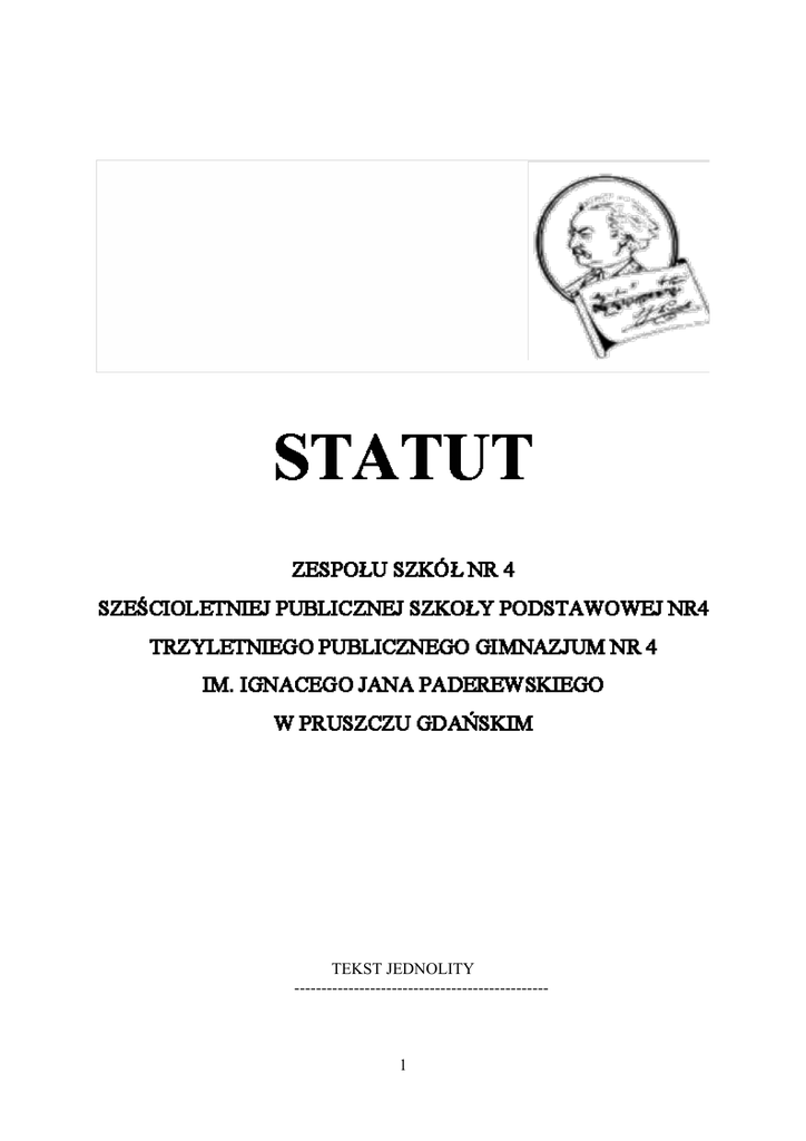 TEKST JEDNOLITY ----------------------------------------------- 1 PODSTAWA PRAWNA Statut Zespołu Szkół Nr 4 w Pruszczu Gdańskim został opracowany w oparciu o obowiązujące przepisy prawne: 1. Ustawę o systemie oświaty z dnia 7 IX 1991 roku z późniejszymi zmianami. 2. Ustawa z dnia 11 kwietnia 2007r. o zmianie ustawy o systemie oświaty oraz zmianie niektórych innych ustaw. 3. Rozporządzenie Ministra Edukacji Narodowej i Sportu z dnia 21.05.2001 roku w sprawie ramowych statutów publicznej szkoły podstawowej, publicznego gimnazjum. 4.Rozporządzenie Ministra Edukacji Narodowej i Sportu z dnia 20 lutego 2004r. w sprawie warunków i trybu przyjmowania uczniów do szkół publicznych oraz przechodzenia z jednych typów szkół do innych. 5.Rozporządzenie Ministra Edukacji Narodowej z dnia 23 marca 2009 r. zmieniające rozporządzenie w sprawie ramowych planów nauczania w szkołach publicznych 6. Deklarację Praw Dziecka. 7. Konstytucję Rzeczypospolitej Polskiej. 8. Kodeks Rodzinny i Opiekuńczy. 9. Kartę Nauczyciela z dnia 06.04.2000 roku z późniejszymi zmianami. 10. Rozporządzenia Ministra Edukacji Narodowej i Sportu w sprawie warunków i sposobu oceniania, klasyfikowania i promowania ucznia z dnia 07.09.2004 roku. 11. Rozporządzenie Ministra Edukacji Narodowej z dnia 09.02.2007 r. zmieniające rozporządzenie w sprawie ramowych statutów publicznego przedszkola oraz publicznych szkół. 12. Rozporządzenie Ministra Edukacji Narodowej z dnia 30 kwietnia 2007 w sprawie warunków i sposobu oceniania, klasyfikowania i promowania uczniów i słuchaczy oraz przeprowadzania sprawdzianów i egzaminów w szkołach publicznych. 13. Rozporządzenie Ministra Edukacji Narodowej i Sportu z dnia 31 grudnia 2002r. w sprawie bezpieczeństwa i higieny w publicznych i niepublicznych szkołach i placówkach. 14.Rozporządzenie Ministra Edukacji Narodowej z dnia 20 sierpnia 2010 r. zmieniające rozporządzenie w sprawie warunków oceniania, klasyfikowania i promowania uczniów i słuchaczy oraz przeprowadzania sprawdzianów i egzaminów w szkołach publicznych. 15. Rozporządzenie Ministra Edukacji Narodowej z dnia 17 listopada 2010 w sprawie zasad udzielania i organizacji pomocy psychologiczno-pedagogicznej w publicznych przedszkolach, szkołach i placówkach. 16. Rozporządzenia Ministra Edukacji Narodowej z dnia 14 listopada 2007 r. w sprawie warunków i sposobu wykonywania przez przedszkola, szkoły i placówki publiczne zadań umożliwiających podtrzymywanie poczucia tożsamości narodowej, etnicznej i językowej uczniów należących do mniejszości narodowych i etnicznych oraz społeczności posługującej się językiem regionalnym. 2 ROZDZIAŁ I. POSTANOWIENIA OGÓLNE §1 1. Zespół Szkół Nr 4 w Pruszczu Gdańskim jest szkołą publiczną. W skład Zespołu Szkół nr 4 wchodzą: - Szkoła Podstawowa nr 4 - Gimnazjum nr 4 2. Siedzibą zespołu jest budynek w Pruszczu Gdańskim przy ul. Kasprowicza16 i ul. Obrońców Westerplatte 30. 3. Szkołę prowadzi Gmina Miejska Pruszcz Gdański. 4. Szkołę nadzoruje Pomorski Kurator Oświaty. 5. Zespół Szkół nr 4 nosi imię Ignacego Jana Paderewskiego od dnia 14 czerwca 1996 roku. 6. Czas trwania cyklu kształcenia w Zespole Szkół nr 4 zgodnie z zarządzeniem Ministra Edukacji Narodowej i Sportu o ramowych planach nauczania wynosi: - w Szkole Podstawowej nr 4 - w Gimnazjum nr 4 - 6 lat -3 lata Świadectwo ukończenia klasy szóstej jest równoważne ze świadectwem ukończenia szkoły podstawowej i uprawnia do ubiegania się o przyjęcie do szkoły gimnazjalnej. Świadectwo ukończenia szkoły gimnazjalnej uprawnia do ubiegania się o przyjęcie do wszystkich szkół ponadgimnazjalnych. 7. Szkoła prowadzi również oddziały zatwierdzone przez organ nadzorujący: - oddziały przedszkolne - oddziały integracyjne 8. Szkole nadaje imię organ prowadzący, czyli Rada Miasta w Pruszczu Gdańskim na wniosek Dyrektora Szkoły, Rady Pedagogicznej oraz przedstawicieli rodziców i uczniów. 9. Ustalona nazwa szkoły oraz jej imię są używane przez szkołę w pełnym brzmieniu. Na pieczątkach i stemplach może być używany czytelny skrót nazwy szkoły i imienia. 3 ROZDZIAŁ II CELE I ZADANIA SZKOŁY §2 1. Zespół realizuje cele i zadania określone w ustawie oraz przepisach wydanych na jej podstawie, a w szczególności: a) umożliwia zdobycie wiedzy i umiejętności niezbędnych do uzyskania świadectwa ukończenia szkoły. b) umożliwia absolwentom dokonania świadomego wyboru dalszego kierunku kształcenia c) kształtuje środowisko wychowawcze sprzyjające realizowaniu celów i zasad określonych w ustawie, stosownie do warunków szkoły i wieku uczniów d) sprawuje opiekę nad uczniami odpowiednio do ich potrzeb oraz możliwości szkoły e) realizuje indywidualne programy nauczania 2. Szkoła umożliwia uczniom podtrzymywanie poczucia tożsamości narodowej, etnicznej, językowej i religijnej poprzez: a) realizację programów nauczania wszystkich przedmiotów b) organizację lekcji religii i etyki w miarę potrzeb c) przygotowanie dzieci i młodzieży do aktywnego i twórczego życia, do umiejętności wiązania podstawowych wątków tradycji kultury europejskiej i narodowej z wiedzą o kulturze i historii własnego miasta i regionu. d) naukę języka kaszubskiego na poziomie szkoły podstawowej * nauka odbywa się na zasadzie dobrowolności (wnioski składane są przez rodziców ucznia do dyrektora szkoły, do końca marca roku poprzedzającego rozpoczęcie nauki) *uczniowie mogą rozpocząć naukę w dowolnej klasie szkoły podstawowej *ocena z przedmiotu j. kaszubski jest oceną liczoną do średniej ocen, a przedmiot wpisany jest w rubryce przedmiotów obowiązkowych 3. W oddziałach klas integracyjnych uczą się wspólnie dzieci pełnosprawne i niepełnosprawne - uczniowie niepełnosprawni przyjmowani są do klasy integracyjnej na podstawie orzeczenia kwalifikacyjnego wydanego przez Poradnię Psychologiczno – Pedagogic