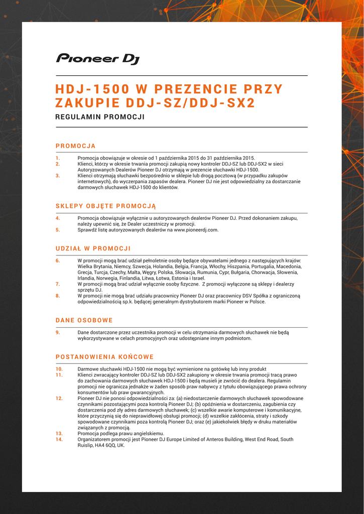 HDJ-1500 W PREZENCIE PRZY ZAKUPIE DDJ-SZ/DDJ-SX2 R E GU L AMI N P R O MO C J I PROMOCJA 1. Promocja obowiązuje w okresie od 1 października 2015 do 31 października 2015. 2. Klienci, którzy w okresie trwania promocji zakupią nowy kontroler DDJ-SZ lub DDJ-SX2 w sieci Autoryzowanych Dealerów Pioneer DJ otrzymają w prezencie słuchawki HDJ-1500. 3. Klienci otrzymają słuchawki bezpośrednio w sklepie lub drogą pocztową (w przypadku zakupów internetowych), do wyczerpania zapasów dealera. Pioneer DJ nie jest odpowiedzialny za dostarczanie darmowych słuchawek HDJ-1500 do klientów. SKLEPY OBJĘTE PROMOCJĄ 4. Promocja obowiązuje wyłącznie u autoryzowanych dealerów Pioneer DJ. Przed dokonaniem zakupu, należy upewnić się, że Dealer uczestniczy w promocji. 5. Sprawdź listę autoryzowanych dealerów na www.pioneerdj.com. UDZIAŁ W PROMOCJI 6. W promocji mogą brać udział pełnoletnie osoby będące obywatelami jednego z następujących krajów: Wielka Brytania, Niemcy, Szwecja, Holandia, Belgia, Francja, Włochy, Hiszpania, Portugalia, Macedonia, Grecja, Turcja, Czechy, Malta, Węgry, Polska, Słowacja, Rumunia, Cypr, Bułgaria, Chorwacja, Słowenia, Irlandia, Norwegia, Finlandia, Litwa, Łotwa, Estonia i Israel. 7. W promocji mogą brać udział wyłącznie osoby fizyczne. Z promocji wyłączone są sklepy i dealerzy sprzętu DJ. 8. W promocji nie mogą brać udziału pracownicy Pioneer DJ oraz pracownicy DSV Spółka z ograniczoną odpowiedzialnością sp.k. będącej generalnym dystrybutorem marki Pioneer w Polsce. DANE OSOBOWE 9. Dane dostarczone przez uczestnika promocji w celu otrzymania darmowych słuchawek nie będą wykorzystywane w celach promocyjnych oraz udostępniane innym podmiotom. P O S TA N O W I E N I A KO Ń C O W E 10. Darmowe słuchawki HDJ-1500 nie mogą być wymienione na gotówkę lub inny produkt 11. Klienci zwracający kontroler DDJ-SZ lub DDJ-SX2 zakupiony w okresie trwania promocji tracą prawo do zachowania darmowych słuchawek HDJ-1500 i będą musieli je zwrócić do dealera. Regulamin promocji nie ogranicza jednakże w żaden sposób praw nabywcy z tytułu obowiązującego prawa ochrony konsumentów lub praw gwarancyjnych. 12. Pioneer DJ nie ponosi odpowiedzialności za: (a) niedostarczenie darmowych słuchawek spowodowane czynnikami pozostającymi poza kontrolą Pioneer DJ; (b) opóźnienia w dostarczeniu, zagubienia czy dostarczenia pod zły adres darmowych słuchawek; (c) wszelkie awarie komputerowe i komunikacyjne, które przyczynią się do nieprawidłowej obsługi promocji; (d) wszelkie zakłócenia, straty i szkody spowodowane czynnikami poza kontrolą Pioneer DJ; oraz (e) jakiekolwiek błędy w druku materiałów związanych z promocją. 13. Promocja podlega prawu angielskiemu. 14. Organizatorem promocji jest Pioneer DJ Europe Limited of Anteros Building, West End Road, South Ruislip, HA4 6QQ, UK.