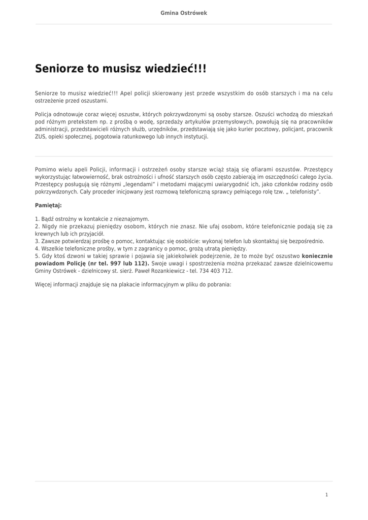 Gmina Ostrówek Seniorze to musisz wiedzieć!!! Seniorze to musisz wiedzieć!!! Apel policji skierowany jest przede wszystkim do osób starszych i ma na celu ostrzeżenie przed oszustami. Policja odnotowuje coraz więcej oszustw, których pokrzywdzonymi są osoby starsze. Oszuści wchodzą do mieszkań pod różnym pretekstem np. z prośbą o wodę, sprzedaży artykułów przemysłowych, powołują się na pracowników administracji, przedstawicieli różnych służb, urzędników, przedstawiają się jako kurier pocztowy, policjant, pracownik ZUS, opieki społecznej, pogotowia ratunkowego lub innych instytucji. Pomimo wielu apeli Policji, informacji i ostrzeżeń osoby starsze wciąż stają się ofiarami oszustów. Przestępcy wykorzystując łatwowierność, brak ostrożności i ufność starszych osób często zabierają im oszczędności całego życia. Przestępcy posługują się różnymi „legendami” i metodami mającymi uwiarygodnić ich, jako członków rodziny osób pokrzywdzonych. Cały proceder inicjowany jest rozmową telefoniczną sprawcy pełniącego rolę tzw. „ telefonisty”. Pamiętaj: 1. Bądź ostrożny w kontakcie z nieznajomym. 2. Nigdy nie przekazuj pieniędzy osobom, których nie znasz. Nie ufaj osobom, które telefonicznie podają się za krewnych lub ich przyjaciół. 3. Zawsze potwierdzaj prośbę o pomoc, kontaktując się osobiście: wykonaj telefon lub skontaktuj się bezpośrednio. 4. Wszelkie telefoniczne prośby, w tym z zagranicy o pomoc, grożą utratą pieniędzy. 5. Gdy ktoś dzwoni w takiej sprawie i pojawia się jakiekolwiek podejrzenie, że to może być oszustwo koniecznie powiadom Policję (nr tel. 997 lub 112). Swoje uwagi i spostrzeżenia można przekazać zawsze dzielnicowemu Gminy Ostrówek - dzielnicowy st. sierż. Paweł Rozankiewicz - tel. 734 403 712. Więcej informacji znajduje się na plakacie informacyjnym w pliku do pobrania: 1