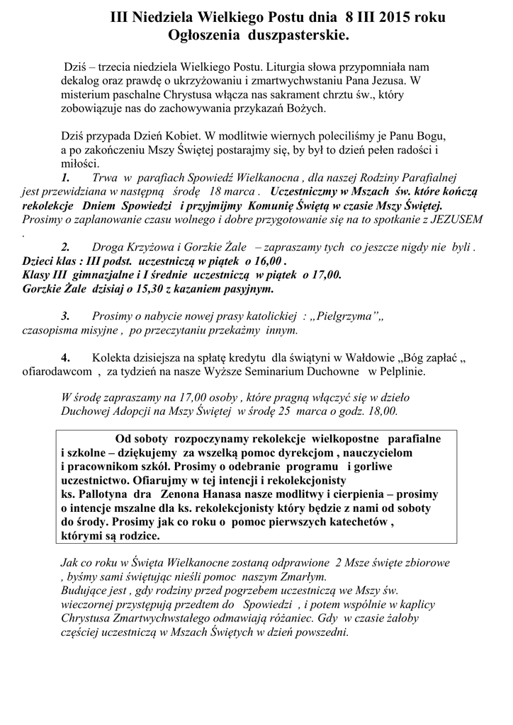 III Niedziela Wielkiego Postu dnia 8 III 2015 roku Ogłoszenia