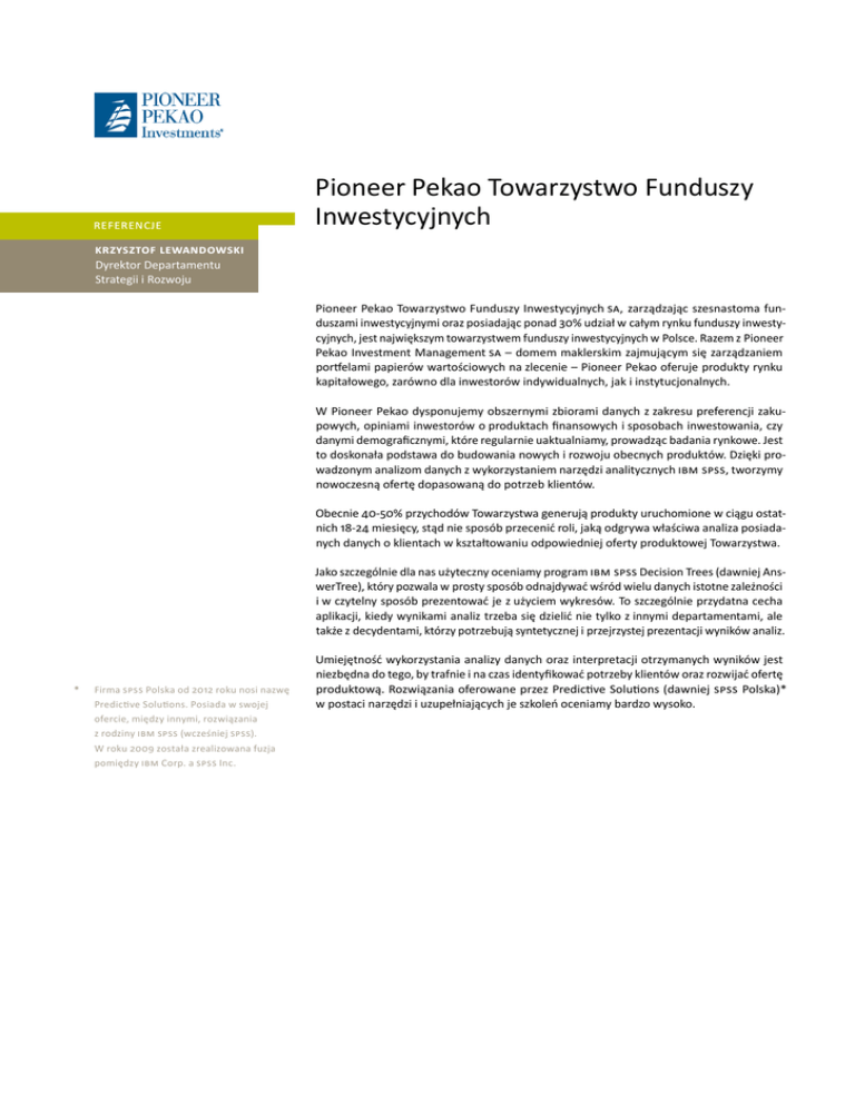referencje Pioneer Pekao Towarzystwo Funduszy Inwestycyjnych Krzysztof Lewandowski Dyrektor Departamentu Strategii i Rozwoju Pioneer Pekao Towarzystwo Funduszy Inwestycyjnych SA, zarządzając szesnastoma funduszami inwestycyjnymi oraz posiadając ponad 30% udział w całym rynku funduszy inwestycyjnych, jest największym towarzystwem funduszy inwestycyjnych w Polsce. Razem z Pioneer Pekao Investment Management SA – domem maklerskim zajmującym się zarządzaniem portfelami papierów wartościowych na zlecenie – Pioneer Pekao oferuje produkty rynku kapitałowego, zarówno dla inwestorów indywidualnych, jak i instytucjonalnych. W Pioneer Pekao dysponujemy obszernymi zbiorami danych z zakresu preferencji zakupowych, opiniami inwestorów o produktach finansowych i sposobach inwestowania, czy danymi demograficznymi, które regularnie uaktualniamy, prowadząc badania rynkowe. Jest to doskonała podstawa do budowania nowych i rozwoju obecnych produktów. Dzięki prowadzonym analizom danych z wykorzystaniem narzędzi analitycznych IBM SPSS, tworzymy nowoczesną ofertę dopasowaną do potrzeb klientów. Obecnie 40-50% przychodów Towarzystwa generują produkty uruchomione w ciągu ostatnich 18-24 miesięcy, stąd nie sposób przecenić roli, jaką odgrywa właściwa analiza posiadanych danych o klientach w kształtowaniu odpowiedniej oferty produktowej Towarzystwa. Jako szczególnie dla nas użyteczny oceniamy program IBM SPSS Decision Trees (dawniej AnswerTree), który pozwala w prosty sposób odnajdywać wśród wielu danych istotne zależności i w czytelny sposób prezentować je z użyciem wykresów. To szczególnie przydatna cecha aplikacji, kiedy wynikami analiz trzeba się dzielić nie tylko z innymi departamentami, ale także z decydentami, którzy potrzebują syntetycznej i przejrzystej prezentacji wyników analiz. *Firma SPSS Polska od 2012 roku nosi nazwę Predictive Solutions. Posiada w swojej ofercie, między innymi, rozwiązania z rodziny IBM SPSS (wcześniej SPSS). W roku 2009 została zrealizowana fuzja pomiędzy IBM Corp. a SPSS Inc. Umiejętność wykorzystania analizy danych oraz interpretacji otrzymanych wyników jest niezbędna do tego, by trafnie i na czas identyfikować potrzeby klientów oraz rozwijać ofertę produktową. Rozwiązania oferowane przez Predictive Solutions (dawniej SPSS Polska)* w postaci narzędzi i uzupełniających je szkoleń oceniamy bardzo wysoko.