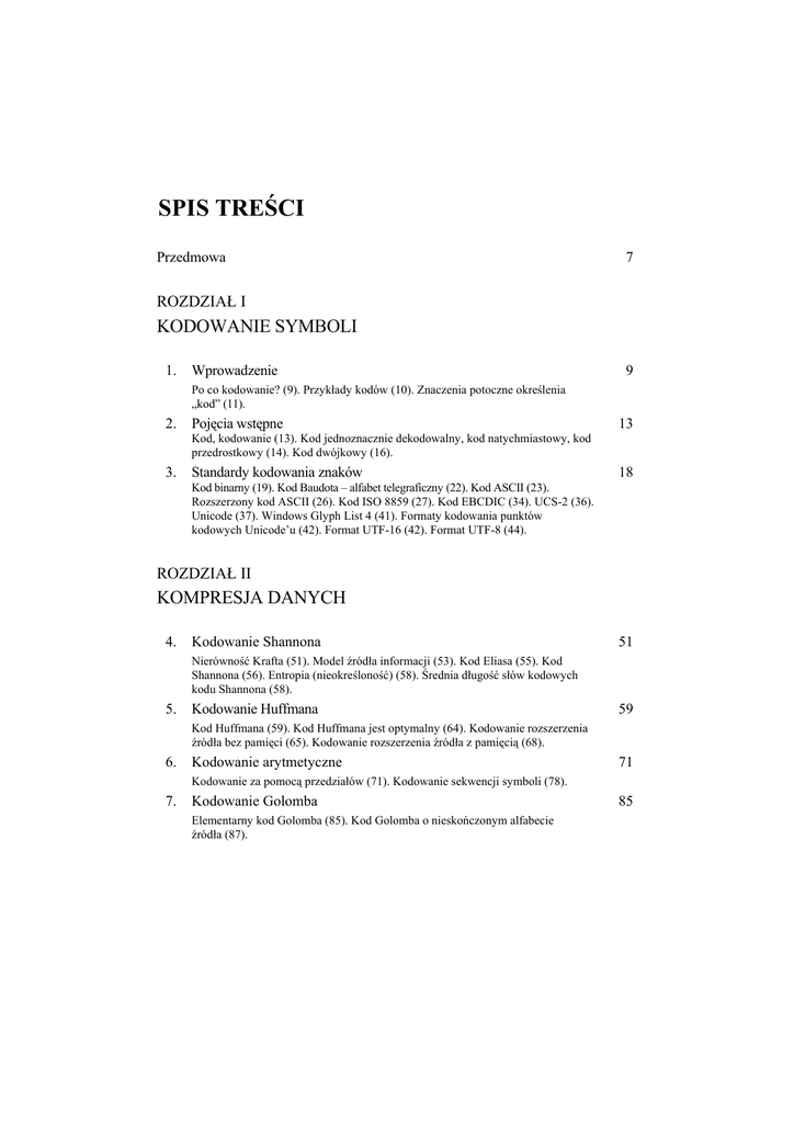 SPIS TREŚCI Przedmowa 7 ROZDZIAŁ I KODOWANIE SYMBOLI 1. Wprowadzenie 9 Po co kodowanie? (9). Przykłady kodów (10). Znaczenia potoczne określenia „kod” (11). 2. Pojęcia wstępne 13 Kod, kodowanie (13). Kod jednoznacznie dekodowalny, kod natychmiastowy, kod przedrostkowy (14). Kod dwójkowy (16). 3. Standardy kodowania znaków 18 Kod binarny (19). Kod Baudota – alfabet telegraficzny (22). Kod ASCII (23). Rozszerzony kod ASCII (26). Kod ISO 8859 (27). Kod EBCDIC (34). UCS-2 (36). Unicode (37). Windows Glyph List 4 (41). Formaty kodowania punktów kodowych Unicode’u (42). Format UTF-16 (42). Format UTF-8 (44). ROZDZIAŁ II KOMPRESJA DANYCH 4. Kodowanie Shannona 51 Nierówność Krafta (51). Model źródła informacji (53). Kod Eliasa (55). Kod Shannona (56). Entropia (nieokreśloność) (58). Średnia długość słów kodowych kodu Shannona (58). 5. Kodowanie Huffmana 59 Kod Huffmana (59). Kod Huffmana jest optymalny (64). Kodowanie rozszerzenia źródła bez pamięci (65). Kodowanie rozszerzenia źródła z pamięcią (68). 6. Kodowanie arytmetyczne 71 Kodowanie za pomocą przedziałów (71). Kodowanie sekwencji symboli (78). 7. Kodowanie Golomba Elementarny kod Golomba (85). Kod Golomba o nieskończonym alfabecie źródła (87). 85 4 8. Kodowanie słownikowe 89 Metoda LZ77 (89). Modyfikacje LZ77 (97). 9. Kompresja bezstratna 97 ROZDZIAŁ III KODOWANIE NADMIAROWE 10. Sumy kontrolne 101 Formalizacja sprawdzania parzystości (103). Kongruencje liczbowe (105). 11. Liniowe kody detekcyjne 108 Model transmisji danych binarnych (108). Wykrywanie błędów pojedynczych (110). Minimalna odległość między wektorami kodowymi kodu wykrywającego błędy pojedyncze (111). 12. Liniowe kody korekcyjne 113 Wielokrotna kontrola parzystości (113). Kod Hamminga (114). Minimalna odległość kodu Hamminga (117). Kod Hamminga jako kod liniowy (118). Zdolność detekcyjna i korekcyjna kodu a odległość minimalna kodu (124). 13. Kody cykliczne 127 Działania na wielomianach (127). Kod wielomianowy (128). Kod cykliczny (133). 14. Kody BCH 137 Rozszerzenia ciał skończonych (137). Pierwiastki wielomianów (140). Wielomian minimalny (142). Kod BCH (143). 15. Kody Reeda–Solomona 147 Wielomiany o współczynnikach z ciała GF(2l) (148). Kod RS (150). 16. Metody implementacji kodów cyklicznych 152 Sprzętowa realizacja kodera i dekodera dla kodu cyklicznego (152). Programowa realizacja kodera i dekodera dla kodu cyklicznego (156). 17. Zastosowania kodowania nadmiarowego 158 Weryfikacja integralności danych (158). Korekcja i detekcja błędów w urządzeniach transmisji i przechowywania danych (162). Pamięć ECC (163). ROZDZIAŁ IV KODOWANIE SYGNAŁÓW 18. Sygnały 167 Cyfryzacja (167). Sygnał jako nośnik informacji (167). Sygnał jako funkcja (168). Sygnał analogowy (169). Sygnał cyfrowy (169). 19. 20. Próbkowanie Kwantyzacja 170 176 5 21. Zapis binarny liczb 181 Pozycyjny system liczbowy (181). Binarny kod znak-moduł (183). Kod uzupełnieniowy (183). Kod uzupełnień do dwóch (184). Zapis stałoprzecinkowy (185). Błędy zaokrągleń (187). Zapis zmiennoprzecinkowy (188). 22. Modulacja impulsowo-kodowa 191 Modulacja (191). Modulacja PCM (192). Błędy kwantyzacji (194). Modulacja DPCM (194). 23. Podstawowe standardy kodowania sygnału audio 197 Format WAVE (197). Kwantyzacja logarytmiczna (202). ROZDZIAŁ V KODOWANIE TRANSMISYJNE 24. Kody linii przesyłowych 205 Kody unipolarne (208). Kody bipolarne RZ i NRZ (208). Kody bifazowe (210). Kody NRZI (215). 25. Kodowanie złożone 216 Kod 4B/5B (217). Kod 8B/10B (219). LITERATURA 223