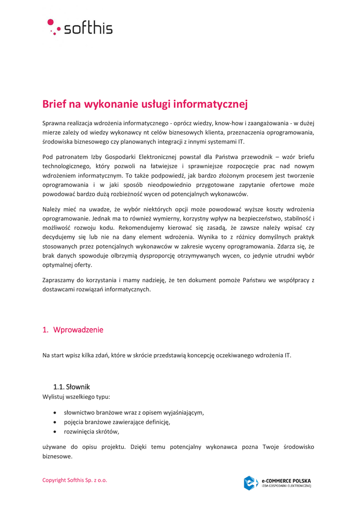 Brief na wykonanie usługi informatycznej Sprawna realizacja wdrożenia informatycznego - oprócz wiedzy, know-how i zaangażowania - w dużej mierze zależy od wiedzy wykonawcy nt celów biznesowych klienta, przeznaczenia oprogramowania, środowiska biznesowego czy planowanych integracji z innymi systemami IT. Pod patronatem Izby Gospodarki Elektronicznej powstał dla Państwa przewodnik – wzór briefu technologicznego, który pozwoli na łatwiejsze i sprawniejsze rozpoczęcie prac nad nowym wdrożeniem informatycznym. To także podpowiedź, jak bardzo złożonym procesem jest tworzenie oprogramowania i w jaki sposób nieodpowiednio przygotowane zapytanie ofertowe może powodować bardzo dużą rozbieżność wycen od potencjalnych wykonawców. Należy mieć na uwadze, że wybór niektórych opcji może powodować wyższe koszty wdrożenia oprogramowanie. Jednak ma to również wymierny, korzystny wpływ na bezpieczeństwo, stabilność i możliwość rozwoju kodu. Rekomendujemy kierować się zasadą, że zawsze należy wpisać czy decydujemy się lub nie na dany element wdrożenia. Wynika to z różnicy domyślnych praktyk stosowanych przez potencjalnych wykonawców w zakresie wyceny oprogramowania. Zdarza się, że brak danych spowoduje olbrzymią dysproporcję otrzymywanych wycen, co jedynie utrudni wybór optymalnej oferty. Zapraszamy do korzystania i mamy nadzieję, że ten dokument pomoże Państwu we współpracy z dostawcami rozwiązań informatycznych. 1. Wprowadzenie Na start wpisz kilka zdań, które w skrócie przedstawią koncepcję oczekiwanego wdrożenia IT. 1.1. Słownik Wylistuj wszelkiego typu: słownictwo branżowe wraz z opisem wyjaśniającym, pojęcia branżowe zawierające definicję, rozwinięcia skrótów, używane do opisu projektu. Dzięki temu potencjalny wykonawca pozna Twoje środowisko biznesowe. Copyright Softhis Sp. z o.o. 1.2. Aktorzy To osoby lub systemy, które będą wykorzystywały funkcjonalności nowego rozwiązania IT, np. Użytkownik niezalogowany, Użytkownik zalogowany, Moderator treści, Administrator, System obsługi płatności itp. 2. Opis przedmiotu zamówienia Rozdział generalnie powinien zawierać ogólne informacje o projekcie. 2.1. Cel projektu Cel biznesowy projektu jaki ma zostać osiągnięty w wyniku planowanego wdrożenia informatycznego. 2.2. Harmonogram Oczekiwany plan czasowy realizacji projektu jaki powinien lub musi być przestrzegany. Jeśli projekt nie posiada harmonogramu, rozdział powinien zawierać informację o jego braku. 2.3. Otoczenie biznesowe Określ istniejące otoczenie biznesowe nowego projektu. Poprzez otoczenie biznesowe rozumie się wszelkiego typu inne systemy, które są aktualnie wykorzystywane przez zamawiającego, które będą w jakimkolwiek stopniu powiązane z planowanym wdrożeniem. Warto określić jakie to systemy (np. księgowy, CRM, ERP, produkcyjny, rozliczeniowy) i/lub w jaki sposób mają być ze sobą powiązane. Nie trzeba uwzględniać systemów IT, które dopiero będą wykorzystywane ze względu na realizację zamawianego projektu. 2.4. Wymagania technologiczne Wszelkiego typu wymagania odnośnie technologii realizacji projektu - np. system musi być implementowany w języku JAVA, a baza danych to MySQL. Jeśli nie ma sprecyzowanych wymagań zostaną one zasugerowane. 2.5. Wersje językowe Dodaj informację o tym jakie wersje językowe system musi zawierać przy pierwszym uruchomieniu oraz czy i o jakie języki jest planowana rozbudowa w przyszłości. 2.6. Migracja danych Odpowiedz na pytanie: czy do systemu mają być inicjująco migrowane jakiekolwiek dane z innego lub innych systemów? Jeśli żadne dane nie będą migrowane, należy tę informację również zamieścić. 2.7. Integracja z systemami zewnętrznymi Lista systemów z jakimi oczekiwane rozwiązanie ma się integrować - informacje o API lub innych metodach integracji. W rozdziale nie trzeba opisywać API, wystarczy informacja jaki to system i skąd można uzyskać dostęp do dokumentacji. Copyright Softhis Sp. z o.o. 3. Wymagania funkcjonalne Główny rozdział zawierający wszelką posiadaną wiedzę o planowanej funkcjonalności systemu. 3.1. Funkcjonalności front end (dla użytkownika) Znane funkcjonalności określane jako front-end - czyli funkcjonalności, z których korzysta użytkownik końcowy za pomocą dostępnego interfejsu. 3.2. Funkcjonalności back end (dla administratora) Znane funkcjonalności określane jako back-end - czyli funkcjonalności, z których korzysta określony pracownik w celu konfiguracji systemu, sprawdzania jego działania itp. 3.3. Model uprawnień Informacje na temat modelu uprawnień jaki należy przyjąć przy projektowaniu systemu. Modele można podzielić na 3 główne grupy: Uprawnienia permanentne – ustalone na etapie specyfikacji rozwiązania, jakakolwiek zmiana uprawnień dla określonego typu użytkownika związana jest z koniecznością modyfikacji kodu systemu przez programistę. Model najprostszy, a tym samym najszybszy w implementacji i najtańszy w wytworzeniu, ale wymaga każdorazowej ingerencji programisty przy chęci jakiejkolwiek modyfikacji. Uprawnienia w oparciu o role – na etapie specyfikacji projektu ustalane są role jakie mogą pełnić użytkownicy w systemie. Każdemu użytkownikowi można przypisać wiele ról, a każda z nich posiada zdefiniowane uprawnienia. Administrator ma możliwość modyfikacji powiązania użytkowników z rolami, a tym samym samodzielnego przyznawania określonych uprawnień wybranym użytkownikom. Role posiadają permanentnie przypisane uprawnienia i jakakolwiek zmiana uprawnień przypisanych do roli związana jest z koniecznością modyfikacji kodu systemu. Model średnio złożony, czas implementacji dłuższy niż w poprzednim modelu, co powoduje wzrost kosztów wytworzenia, ale możliwa jest ograniczona konfiguracja uprawnień bez udziału programisty. Uprawnienia dynamiczne – najbardziej złożony model uprawnień, d