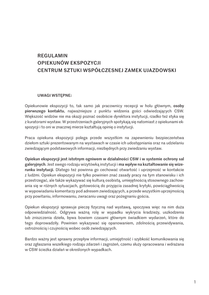 REGULAMIN OPIEKUNÓW EKSPOZYCJI CENTRUM SZTUKI WSPÓŁCZESNEJ ZAMEK UJAZDOWSKI Uwagi wstępne: Opiekunowie ekspozycji to, tak samo jak pracownicy recepcji w holu głównym, osoby pierwszego kontaktu, najważniejsze z punktu widzenia gości odwiedzających CSW. Większość widzów nie ma okazji poznać osobiście dyrektora instytucji, rzadko też styka się z kuratorami wystaw. W przestrzeniach galeryjnych spotykają się natomiast z opiekunami ek spozycji i to oni w znacznej mierze kształtują opinię o instytucji. Praca opiekuna ekspozycji polega przede wszystkim na zapewnieniu bezpieczeństwa dziełom sztuki prezentowanym na wystawach w czasie ich udostępniania oraz na udzielaniu zwiedzającym podstawowych informacji, niezbędnych przy zwiedzaniu wystaw. Opiekun ekspozycji jest istotnym ogniwem w działalności CSW i w systemie ochrony sal galeryjnych. Jest swego rodzaju wizytówką instytucji i ma wpływ na kształtowanie się wize runku instytucji. Dlatego też powinna go cechować otwartość i uprzejmość w kontakcie z ludźmi. Opiekun ekspozycji nie tylko powinien znać zasady pracy na tym stanowisku i ich przestrzegać, ale także wykazywać się kulturą osobistą, umiejętnością stosownego zachow ania się w różnych sytuacjach, gotowością do przyjęcia zasadnej krytyki, powściągliwością w wypowiadaniu komentarzy pod adresem zwiedzających, a przede wszystkim uprzejmością przy powitaniu, informowaniu, zwracaniu uwagi oraz pożegnaniu gościa. Opiekun ekspozycji sprawuje pieczę fizyczną nad wystawą, spoczywa więc na nim duża odpowiedzialność. Odgrywa ważną rolę w wypadku wykrycia kradzieży, uszkodzenia lub zniszczenia dzieła, bywa bowiem czasami głównym świadkiem wydarzeń, które do tego doprowadziły. Powinien wykazywać się opanowaniem, zdolnością przewidywania, ostrożnością i czujnością wobec osób zwiedzających. Bardzo ważny jest sprawny przepływ informacji, umiejętność i szybkość komunikowania się oraz zgłaszania wszelkiego rodzaju zdarzeń i zagrożeń, czemu służy opracowana i wdrażana w CSW ścieżka działań w określonych wypadkach. 1 I. ZASADY OGÓLNE OBOWIĄZUJĄCE SZEFA OPIEKUNÓW EKSPOZYCJI I PODLEGŁYCH MU PRACOWNIKÓW 1. Osobą odpowiedzialną za sale ekspozycyjne jest Szef Opiekunów Ekspozycji. a) Sprawuje on bezpośredni nadzór nad stanem powierzonej ekspozycji. b) Wszelkie prace i zmiany dokonywane w obrębie otwartej dla widzów wystawy mogą się odbywać tylko za zgodą kuratora, kierownika Działu Techniczno Administracyjnego oraz wiedzą Szefa Opiekunów Ekspozycji i muszą być zakończone przed udostępnieniem ekspozycji dla zwiedzających. 2. Wszyscy opiekunowie ekspozycji są zobowiązani dbać o schludny wygląd i właściwy strój, spełniający wymogi Zleceniodawcy (kolorystyka i estetyka). Zleceniodawca zastrzega so bie możliwość zgłaszania stosownych uwag w tym zakresie i muszą być one na bieżąco uwzględniane. 3. Obowiązujący strój służbowy (wersja podstawowa): • garnitury/garsonki granatowe (spodnie/spódnice w kolorze marynarki) • białe koszule z kołnierzykiem • granatowe krawaty, • czarne pantofle • czarne skarpety/rajstopy • identyfikator ze zdjęciem • identyfikator dla osoby porozumiewającej się w języku angielskim W niektórych sytuacjach istnieje możliwość, a nawet konieczność odstąpienia od pod stawowego stroju służbowego – na zgłoszony przez CSW wniosek, mający związek z działalnością merytoryczną bądź edukacyjną i upowszechnieniową, a także wizerun kiem CSW. CSW zastrzega sobie możliwość całkowitej zmiany obowiązującego stroju służbowego opiekunów galerii w trakcie trwania współpracy/umowy w związku z ogólną zmianą wizerunku CSW lub założeń dotyczących pracy opiekunów galerii. 4. Opiekunowie ekspozycji są zobowiązani do utrzymywania porządku i czystości w salach wystawowych oraz w pokoju socjalnym. 5. Szef Opiekunów Ekspozycji wyznacza dyżurującego pracownika, który wraz z pracowniki em Działu TA dokonuje codziennie przed otwarciem wystaw dla widzów obchodu galerii, sprawdzając stan ekspozycji i prezentowanych prac. W weekend obchód odbywa się bez udziału pracownika Działu TA. W razie stwierdzenia nieprawidłowości powiadamia o nich Szefa Opiekunów Ekspozycji oraz kierownika Działu TA. Szef Opiekunów Ekspozycji wprowadza stosowną notatkę do Karty Zmiany Stanu Ekspozycji (wzór w załączniku), która jest zostawiana codziennie po zamknięciu galerii na Portierni. 6. System powiadamiania o wszelkich niepokojących zmianach na ekspozycjach: opiekun ekspozycji informuje Szefa Opiekunów Ekspozycji, a ten powiadamia niezwłocznie o zaistniałym fakcie kierownika Działu TA. 7. Wszyscy opiekunowie ekspozycji są zobowiązani do uczestniczenia w organizowanych comiesięcznie przez Dział Edukacji i Upowszechniania odprawach, w których udział biorą wyznaczeni pracownicy Działu TA, koordynatorzy, edukatorzy i kuratorzy prezentowanych wystaw. Odprawy mogą mieć charakter zebrań, szkoleń bądź warsztatów. 2 8. Szef Opiekunów ekspozycji odpowiada za procedurę liczenia frekwencji na wystawach, opracowaną przez Dział Edukacji i Upowszechniania. Jest też w tym obszarze w regular nym ścisłym kontakcie z wyznaczonymi osobami z Działu Edukacji i Upowszechniania 9. Szef Opiekunów Ekspozycji odpowiada za wprowadzenie komunikatu przypominającego gościom galerii o zamykaniu wystaw na kwadrans przed godziną 19.00 lub 21.00 (czwar tki). Informację tę przekazują zwiedzającym opiekunowie sal. 10.Praca opiekunów ekspozycji rozpoczyna się 20 min. przed godziną udostępnienia galerii dla zwiedzających, a kończy 20 min. po zamknięciu galerii dla zwiedzających. W związku z zajęciami edukacyjnymi prowadzonymi regularnie w przestrzeniach wystawowych dwie osoby wyznaczone z ekipy opiekunów ekspozycji zaczynają codziennie pracę o godzinie 10.00 i kończą o 17.00. Możliwe są odstęp