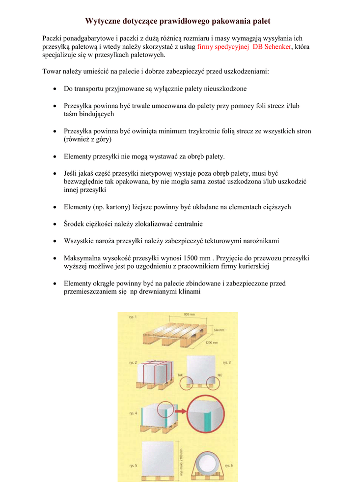 Wytyczne dotyczące prawidłowego pakowania palet Paczki ponadgabarytowe i paczki z dużą różnicą rozmiaru i masy wymagają wysyłania ich przesyłką paletową i wtedy należy skorzystać z usług firmy spedycyjnej DB Schenker, która specjalizuje się w przesyłkach paletowych. Towar należy umieścić na palecie i dobrze zabezpieczyć przed uszkodzeniami:  Do transportu przyjmowane są wyłącznie palety nieuszkodzone  Przesyłka powinna być trwale umocowana do palety przy pomocy foli strecz i/lub taśm bindujących  Przesyłka powinna być owinięta minimum trzykrotnie folią strecz ze wszystkich stron (również z góry)  Elementy przesyłki nie mogą wystawać za obręb palety.  Jeśli jakaś część przesyłki nietypowej wystaje poza obręb palety, musi być bezwzględnie tak opakowana, by nie mogła sama zostać uszkodzona i/lub uszkodzić innej przesyłki  Elementy (np. kartony) lżejsze powinny być układane na elementach cięższych  Środek ciężkości należy zlokalizować centralnie  Wszystkie naroża przesyłki należy zabezpieczyć tekturowymi narożnikami  Maksymalna wysokość przesyłki wynosi 1500 mm . Przyjęcie do przewozu przesyłki wyższej możliwe jest po uzgodnieniu z pracownikiem firmy kurierskiej  Elementy okrągłe powinny być na palecie zbindowane i zabezpieczone przed przemieszczaniem się np drewnianymi klinami