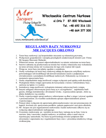 REGULAMIN BAZY NURKOWEJ MR JACQUES ORŁOWO 1. Teren bazy nurkowej i jej bezpośrednie otoczenie są własnością prywatną. 2. Wyłącznym gospodarzem i zarządcą przyległych oznakowanych terenów jest Firma Mr Jacques Sławomir Mularski. 3. Właściciel terenu nie ponosi odpowiedzialności za mienie wniesione na teren bazy. 4. Surowo zabrania się przebywania na terenie bez wiedzy właściciela oraz wchodzenia na teren od innej strony niż wyznaczone do tego celu wejście lub wjazd. 5. Wstęp na teren bazy jest płatny zgodnie z cennikiem. 6. Osoby wchodzące na teren bazy nurkowej oddają do depozytu certyfikaty nurkowe potwierdzające ich kwalifikacje lub dowód tożsamości razem z podpisanym oświadczeniem o posiadaniu kwalifikacji nurkowych. Dokumenty są zwracane w momencie opuszczania bazy. 7. Osoby niepełnoletnie mają możliwość wstępu wyłącznie pod opieką osób dorosłych. 8. Wykupienie biletu wstępu upoważnia do korzystania z terenu i infrastruktury bazy , zarówno na lądzie i w wodzie. 9. Instruktorzy mają możliwość wykupienia imiennej całorocznej karty wstępu. 10. Innymi usługami oferowanymi przez bazę są w szczególności : napełnianie butli gazem, obsługa instruktorska i divemaster’owska , wypożyczalnia sprzętu , które są płatne dodatkowo wg cennika. 11. Osoby wypożyczające sprzęt nurkowy zobowiązane są dbać o niego i używać zgodnie z przeznaczeniem. Za wszelkie uszkodzenia sprzętu odpowiedzialność ponosi wypożyczający. 12. Pomost służy wyłącznie do uprawiania płetwonurkowania i nie jest przeznaczony do kąpieli, łowienia ryb, spożywania posiłków, palenia papierosów oraz picia alkoholu. 13. Mr Jacques nie jest organizatorem nurkowania i każde nurkowanie odbywa się na wyłączną odpowiedzialność nurkującego. 14. Uczestnicy nurkowania po wjeździe na teren bazy wpisują się na listę. Lista ta zawiera: imię i nazwisko, stopień nurkowy, nr telefonu, adres e-mail oraz nr rejestracyjny samochodu. Na liście tej potwierdzają również podpisem fakt otrzymania i zapoznania się z regulaminem bazy oraz z procedurą ratunkową i drogą ewakuacyjną. 15. Uczestnicy wypełniają niezbędne formularze medyczne (jeśli nie posiadają orzeczenia lekarskiego) i pozostawiają w depozycie certyfikat nurkowy, który będzie zwrócony w momencie opuszczania bazy. 16. Baza zapewnia niezbędne środki bezpieczeństwa w postaci tlenu medycznego oraz apteczki 17. Goście bazy zobowiązani są do zachowania porządku, poszanowania środowiska i korzystania z pojemników na odpadki oraz toalet. 18. Psy i inne zwierzęta wprowadzane na teren bazy muszą być trzymane na smyczy i mieć założony kaganiec. Zamiar ich wprowadzenia musi być wcześniej zgłoszony pracownikowi Mr Jacques, przy czym pracownik ma prawo odmówić prawa wstępu z uwagi na bezpieczeństwo uczestników na terenie bazy. Właściciel zwierzęcia musi mieć nad nim pełną kontrolę i nie pozostawiać zwierzęcia bez opieki. Właściciel jest zobowiązany do sprzątania po zwierzęciu! 19. Na terenie bazy obowiązuje zakaz wnoszenia kusz podwodnych i innych podobnych urządzeń służących podwodnemu łowiectwu, jak również broni palnej i innych urządzeń niebezpiecznych. 20. Na terenie całego jeziora obowiązuje absolutny i bezwzględny zakaz kłusowania. Zakaz ten jest bardzo rygorystycznie przestrzegany. Wszelkie przypadki kłusownictwa są natychmiast zgłaszane na policję. 21. Osoby nurkujące zobowiązane są do przestrzegania przepisów określających zasady nurkowania rekreacyjnego w Polsce, zobowiązują się do przestrzegania zasad bezpieczeństwa wynikających ze standardów szkoleniowych federacji, do których należą, ze zdrowego rozsądku oraz z dobrej praktyki nurkowej, w szczególności powinny: a. posiadać ważne orzeczenie lekarskie o zdolności do uprawiania nurkowania lub wypełnić deklarację medyczną - oświadczenie. b. posiadać stosowne uprawnienia do nurkowania, c. nurkować zgodnie z posiadanymi uprawnieniami i umiejętnościami, d. posiadać sprzęt niezbędny do nurkowania w polskich wodach, e. nie nurkować pod wpływem alkoholu lub środków odurzających. Szczegółowe zasady nurkowania w Bazie Mr Jacques Orłowo: 1. Wszyscy nurkujący w Bazie zobowiązani są do wpisania się przed nurkowaniem do rejestru nurkowań wyłożonego w widocznym i oznaczonym miejscu. 2. Osoba nurkująca powinna robić to zgodnie z posiadanymi kwalifikacjami i dobrą praktyką nurkową oraz zgodnie z przygotowanym planem nurkowania 3. Przed wejściem do wody osoba nurkująca sprawdza sprawność sprzętu który ma być używany do nurkowania 4. Niedopuszczalne jest przekraczanie głębokości wynikającej z posiadanych kwalifikacji oraz z nieprzekraczalnego ciśnienia cząstkowego tlenu: 0,16MPa. 5. Niedopuszczalne jest nurkowanie po użyciu alkoholu i innych podobnie działających środków. 6. Po zakończeniu nurkowania, osoba kierująca nurkowaniem lub sam nurkujący uzupełnia rejestr: wypełnia godziny wyjścia z wody oraz czas i głębokość nurkowania. 7. Brak wpisu o powrocie z nurkowania o planowanej godzinie powoduje rozpoczęcie akcji poszukiwawczej. 8. Kosztami nieuzasadnionego uruchomienia akcji poszukiwawczej w całości zostanie obciążona osoba, która nie wywiązała się z obowiązku wpisu lub przedłużyła nurkowanie ponad zaplanowany czasokres. 9. Zapoznanie się z niniejszym regulaminem jest wymagane od każdego nurkującego w bazie i każdej osoby dorosłej przebywającej na terenie bazy, które mają obowiązek powiadomienia o zasadach niniejszego regulaminu osoby małoletnie. 10. Osoby nie przestrzegające niniejszego regulaminu, lub w inny sposób łamiące zasady bezpiecznego nurkowania, nie mają wstępu do bazy lub mogą zostać z bazy usunięte. 11. Nieznajomość regulaminu nie zwalnia z obowiązku stosowania się do zasad obowiązujących w bazie, w szczególności zasad nurkowania. 12. W sprawach nie objętych