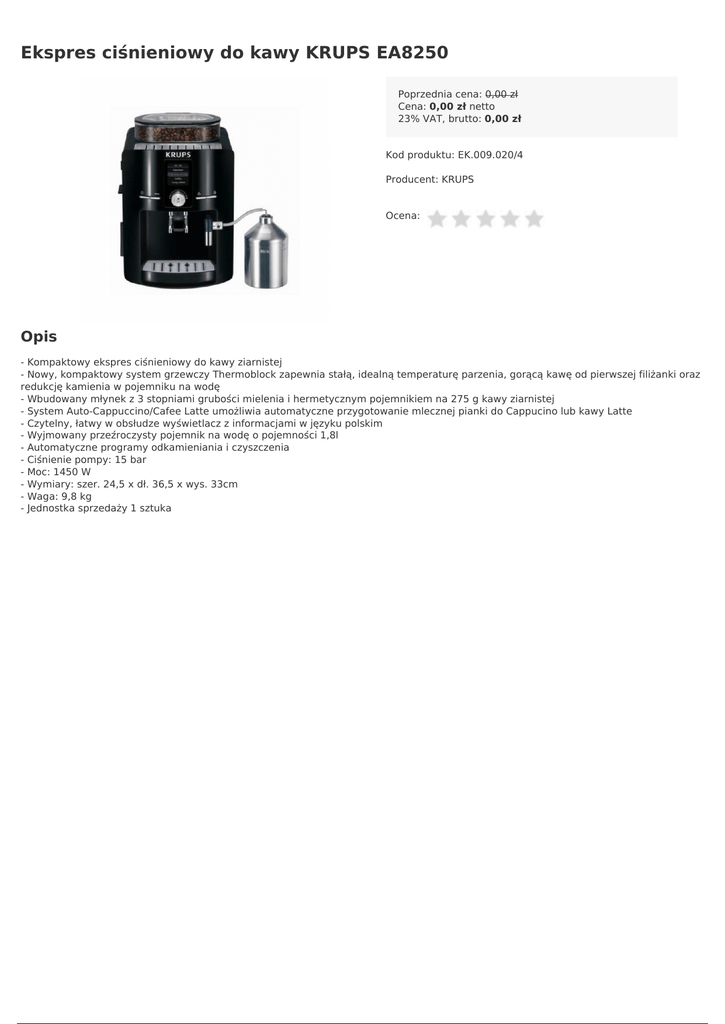 Ekspres ciśnieniowy do kawy KRUPS EA8250 Poprzednia cena: 0,00 zł Cena: 0,00 zł netto 23% VAT, brutto: 0,00 zł Kod produktu: EK.009.020/4 Producent: KRUPS Ocena: Opis - Kompaktowy ekspres ciśnieniowy do kawy ziarnistej - Nowy, kompaktowy system grzewczy Thermoblock zapewnia stałą, idealną temperaturę parzenia, gorącą kawę od pierwszej filiżanki oraz redukcję kamienia w pojemniku na wodę - Wbudowany młynek z 3 stopniami grubości mielenia i hermetycznym pojemnikiem na 275 g kawy ziarnistej - System Auto-Cappuccino/Cafee Latte umożliwia automatyczne przygotowanie mlecznej pianki do Cappucino lub kawy Latte - Czytelny, łatwy w obsłudze wyświetlacz z informacjami w języku polskim - Wyjmowany przeźroczysty pojemnik na wodę o pojemności 1,8l - Automatyczne programy odkamieniania i czyszczenia - Ciśnienie pompy: 15 bar - Moc: 1450 W - Wymiary: szer. 24,5 x dł. 36,5 x wys. 33cm - Waga: 9,8 kg - Jednostka sprzedaży 1 sztuka Powered by TCPDF (www.tcpdf.org)