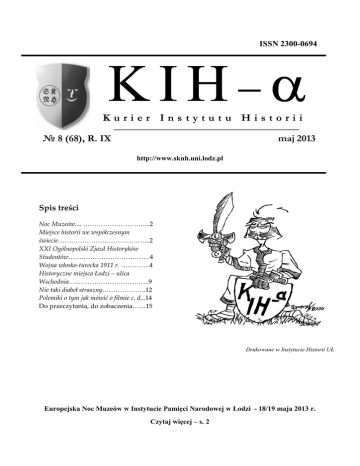 ISSN 2300-0694 ΚΙΗ−α Kurier Instytutu Historii № 8 (68), R. IX maj 2013 http://www.sknh.uni.lodz.pl Spis treści Noc Muzeów.... ………………………....2 Miejsce historii we współczesnym świecie…………………………………...2 XXI Ogólnopolski Zjazd Historyków Studentów……………………………….4 Wojna włosko-turecka 1911 r. ………….4 Historyczne miejsca Łodzi – ulica Wschodnia…..…………………………..9 Nie taki diabeł straszny………………..12 Polemiki o tym jak mówić o filmie c. d...14 Do przeczytania, do zobaczenia…....15 Drukowane w Instytucie Historii UŁ Europejska Noc Muzeów w Instytucie Pamięci Narodowej w Łodzi - 18/19 maja 2013 r. Czytaj więcej – s. 2 Europejska Noc Muzeów w Instytucie Pamięci Narodowej w Łodzi – 18/19 maja 2013 r. Z apraszamy studentów Instytutu Historii Uniwersytetu Łódzkiego do wzięcia udziału w Turnieju Gier Planszowych, organizowanym w ramach Europejskiej Nocy Muzeów. Tym razem uczestnikom turnieju proponujemy grę edukacyjną „ZnajZnak”. „ZnajZnak” jest grą edukacyjną przeznaczoną dla dwóch graczy, składa się ze 132 kart. Na każdej znajduje się 12 różnych symboli dotyczących najnowszej historii Polski. Jeżeli weźmiemy dowolne dwie karty i uważnie się im przyjrzymy okaże się, że mają jeden wspólny symbol. 132 karty, 133 symbole i zawsze tylko jeden wspólny znak na dwóch kartach. Gracz ma za zadanie jak najszybciej znaleźć ten wspólny symbol na dwóch leżących na stole kartach i podać jego nazwę. Jeżeli mu się to uda, swoja kartę oddaje przeciwnikowi. Jeżeli nie zna nazwy znaku, odwraca kartę, odczytuje definicję symbolu, a na stół wykłada nową kartę i gra toczy się dalej. Wygrywa ten kto pierwszy pozbędzie się wszystkich kart z ręki. Na kartach pojawiają się symbole dotyczące najnowszej historii Polski – nie tylko najważniejsze godła czy odznaczenia, ale także kluczowe dla naszej historii daty. Do gry trafiło kilkanaście symbolicznych postaci takich jak Józef Piłsudski, Janusz Korczak, ks. Jerzy Popiełuszko, czy Anna Walentynowicz. Wśród symboli znaleźć można czy historyczne graffiti. charakterystyczne pomniki, symboliczne zdjęcia, Takie jak malowana czarną farbą „Polska Walcząca”, czy krasnal Pomarańczowej Alternatywy. Turniej zaczynamy o 20.00 w siedzibie Oddziału Instytutu Pamięci Narodowej w Łodzi przy ul. Elizy Orzeszkowej 31/35. Na zwycięzców czekają nagrody książkowe! Zachęcamy do sprawdzenia swojej wiedzy historycznej! mgr Adam Sitarek, IPN – Oddział Łódzki MIEJSCE HISTORII WE WSPÓŁCZESNYM ŚWIECIE P odczas XIII Festiwalu Kultury, Nauki i Techniki została przeprowadzona ankieta. Pytaliśmy gości festiwalu gdzie ich zdaniem można spotkać się z historią na co dzień. Uzyskaliśmy wiele interesujących odpowiedzi, jednak moim zdaniem ankieta powinna być uzupełniona o dodatkowe pytanie – czym w ogóle jest historia. Można było bowiem wywnioskować, że nieomal każdy inaczej rozumiał to pojęcie. W przeważającej większości, udzielając odpowiedzi na nasze pytanie, ludzie postrzegali historię instytucjonalnie. Najczęściej bowiem padało stwierdzenie: w szkole. Można więc stwierdzić, że dla większości badanych historia jest jednym z przedmiotów nauczania, obowiązkowym w programie szkolnym. Duża część respondentów uznała zaś, że historię można utożsamić z dorobkiem historiograficznym i stwierdzała, że z historią można spotkać się w książkach. Po dłuższej rozmowie, można jednak było wywnioskować, że respondentom chodziło raczej o podręczniki szkolne niż pozycje monograficzne, albumy czy biografie. Wielu badanych, uznało, że z historią na co dzień można spotkać się w telewizji i Internecie. Część z nich wymieniała kanały „branżowe” typu TVP Historia czy ViaSatHistory. Ta grupa badanych utożsamiała historię z programami telewizyjnymi o niej opowiadającymi. Rozwijając swoje wypowiedzi, mówili o tym że takie programy są potrzebne ponieważ jesteśmy zabiegani 2 i nie mamy czasu czytać - to dla nas często jedyne źródło wiedzy o przeszłości. Przedstawiciele starszego pokolenia, podkreślali pożyteczność tego typu programów, ale jednocześnie przyznawali pół żartem, pół serio, że oni sami stanowią historię. Jednocześnie jakby na potwierdzenie tych słów, z nostalgią przyglądali się peerelowskim przedmiotom stanowiącym element ekspozycji stworzonej przez nasze Koło i zauważali, że pamiętają kiedy te obecnie relikty, stanowiły przedmioty codziennego użytku. Jedną z ciekawszych moim zdaniem opinii wyraziła pewna gimnazjalistka stwierdzając, że historią jest to co nas otacza i że sami po części ją tworzymy. Podkreśliła w swojej wypowiedzi, że historia nie jest czymś statycznym, że ciągle trwa. Interesująca jest nie tylko treść tej opinii, ale również wiek osoby, która ją wyraziła. Pojawiło się jeszcze kilka wypowiedzi w podobnym tonie, zwracających uwagę na fakt, iż ślady historii można znaleźć we wszystkim co nas otacza. Część osób wyrażających taką opinię, utożsamiało historię z zabytkowymi budynkami, inni ze starszymi osobami, które stanowią ich zdaniem żywe pomniki dziejów ojczystych, jeszcze inni upatrywali śladów historii w każdym otaczającym nas zjawisku czy osobie. Pojawiła się także odosobniona co prawda opinia, będąca parafrazą powiedzenia, że historia kołem się toczy. Jedna z respondentek przyznała, iż tak naprawdę choć pozornie świat się zmienia, to wokół słychać wiele ech PRL-u i że filmy S. Barei mimo zmiany ustroju nie utraciły nic ze swojej aktualności. Podsumowując, opinie, które udało nam się uzyskać na temat tego gdzie możemy odnaleźć historię we współczesnym świecie były bardzo zróżnicowane. Optymizmem napawa fakt iż większość respondentów uznała historię za 