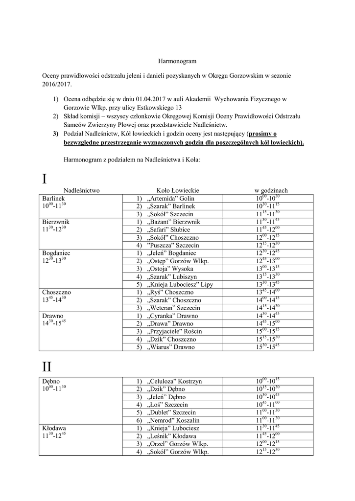 Harmonogram Oceny prawidłowości odstrzału jeleni i danieli pozyskanych w Okręgu Gorzowskim w sezonie 2016/2017. 1) Ocena odbędzie się w dniu 01.04.2017 w auli Akademii Wychowania Fizycznego w Gorzowie Wlkp. przy ulicy Estkowskiego 13 2) Skład komisji – wszyscy członkowie Okręgowej Komisji Oceny Prawidłowości Odstrzału Samców Zwierzyny Płowej oraz przedstawiciele Nadleśnictw. 3) Podział Nadleśnictw, Kół łowieckich i godzin oceny jest następujący (prosimy o bezwzględne przestrzeganie wyznaczonych godzin dla poszczególnych kół łowieckich). Harmonogram z podziałem na Nadleśnictwa i Koła: I Nadleśnictwo Barlinek 1000-1130 Bierzwnik 1130-1230 Bogdaniec 1230-1330 Choszczno 1345-1430 Drawno 1430-1545 1) 2) 3) 1) 2) 3) 4) 1) 2) 3) 4) 5) 1) 2) 3) 1) 2) 3) 4) 5) Koło Łowieckie „Artemida” Golin „Szarak” Barlinek „Sokół” Szczecin „Bażant” Bierzwnik „Safari” Słubice „Sokół” Choszczno ”Puszcza” Szczecin „Jeleń” Bogdaniec „Ostęp” Gorzów Wlkp. „Ostoja” Wysoka „Szarak” Lubiszyn „Knieja Lubociesz” Lipy „Ryś” Choszczno „Szarak” Choszczno „Weteran” Szczecin „Cyranka” Drawno „Drawa” Drawno „Przyjaciele” Rościn „Dzik” Choszczno „Wiarus” Drawno w godzinach 1000-1030 1030-1115 1115-1130 1130-1145 1145-1200 1200-1215 1215-1230 1230-1245 1245-1300 1300-1315 1315-1330 1330-1345 1345-1400 1400-1415 1415-1430 1430-1445 1445-1500 1500-1515 1515-1530 1530-1545 1) 2) 3) 4) 5) 6) 1) 2) 3) 4) „Celuloza” Kostrzyn „Dzik” Dębno „Jeleń” Dębno „Łoś” Szczecin „Dublet” Szczecin „Nemrod” Koszalin „Knieja” Lubociesz „Leśnik” Kłodawa „Orzeł” Gorzów Wlkp. „Sokół” Gorzów Wlkp. 1000-1015 1015-1030 1030-1045 1045-1100 1100-1130 1100-1130 1130-1145 1145-1200 1200-1215 1215-1230 II Dębno 1000-1130 Kłodawa 1130-1245 Karwin 1245-1345 Lubniewice 1345-1445 5) 1) 2) 3) 4) 5) 6) 7) 1) 2) 3) 4) 5) „Wilk” Gorzów Wlkp. „Darz Bór” Drezdenko „Noteć” Gościm „Puszcza” Lipki „Wilk” Gorzów Wlkp. „Cietrzew” z Guzowa „Żerań” Warszawa „Jeleń” Drezdenko „Cyranka” Krzeszyce „Lis” Gorzów Wlkp. „Jelonek” Rzepin „Bory Lubuskie” „Jeleń” Sulęcin 1230-1245 1245-1300 1300-1315 1300-1315 1315-1330 1330-1345 1330-1345 1345 -1400 1400-1415 1415-1430 1415-1445 1445-1500 1500-1515 1) 2) 3) 4) 1) 2) 3) 4) 5) 1) 2) 1) 2) 3) 4) 5) 6) 7) „Rogacz” Międzyrzecz „Żuraw” Brójce „Żuraw” Przytoczna „Drop” Zielona Góra „Jeleń” Krobielewko „Sokół” Gorzów Wlkp. „Żuraw” Przytoczna „Szarotka” Skwierzyna „Celuloza” Kostrzyn „Jeleń” Myślibórz „Grzywacz” Halinów „Bór” Słubice „Cyranka” Krzeszyce „Dzik” Słońsk „Knieja” Ośno Lubuskie „Łyska” Słońsk „Tumak” Ośno Lubuskie „Jeleń” Sulęcin 1000-1030 1030-1045 1045-1115 1115-1130 1130-1145 1145-1200 1200-1215 1215-1230 1230-1245 1245-1300 1300-1315 1315-1330 1330-1400 1400-1415 1415-1430 1430-1445 1445-1500 1500-1515 1) 2) 3) 1) 2) 3) 4) 5) 1) 2) 3) 1) 2) 3) 4) „Jeleń” Rzepin „Bór” Słubice „Drop” Zielona Góra „Cietrzew” Myślibórz „Diana” Myślibórz „Dzik” Myślibórz „Jeleń” Myślibórz „Darz Bór” Szczecin „Jeleń” Sulęcin „Szop” Wędrzyn „Cis” Ośno Lubuskie „Czarny Bór” Klesno „Knieja” Strzelce Kraj. „Ryś” Dobiegniew „Św. Hubert” Drezdenko 1000-1030 1030-1045 1030-1045 1045-1115 1115-1130 1130-1145 1145-1215 1145-1215 1215-1230 1230-1300 1300-1315 1315-1345 1345-1415 1415-1445 1445-1515 III Międzyrzecz 1000-1130 Międzychód 1130-1245 Myślibórz 1245-1315 Ośno Lubuskie 1315-1500 IV Rzepin 1000-1045 Różańsko 1045-1215 Sulęcin 1215-1315 Smolarz 1315-1515 V Strzelce Krajeńskie 1000-1230 Skwierzyna 1230-1345 Trzciel 1345-1445 1) 2) 3) 4) 5) 6) 7) 1) 2) 3) 4) 5) 1) 2) 3) 4) „Brzoza” Strzelce Kraj. „Jeleń” Drezdenko „Knieja” Strzelce Kraj. „Ostoja” Strzelce Kraj. „Św. Hubert” Drezdenko „Cyranka Lubuska” „Soból” Warszawa „Bory Lubuskie” „Korona” Międzyrzecz „Ponowa” Słubice „Szarotka” Skwierzyna „Wadera” Warszawa „Gon” Poznań „Ponowa” Międzyrzecz „Żuraw” Brójce „Jeleń” Międzyrzecz 1000-1015 1015-1045 1045-1100 1100-1130 1100-1130 1130-1200 1200-1230 1230-1245 1245-1300 1300-1315 1315-1330 1330-1345 1345-1415 1415-1430 1430-1445 1445-1500 VI Wycena trofeów medalowych odbędzie się w dniu 01.04.2017 w godzinach 1000-1400 w auli Akademii Wychowania Fizycznego w Gorzowie Wlkp. przy ulicy Estkowskiego 13. VII Ocena Ostateczna w celu umożliwienia przedłożenia trofeów do oceny w wszystkich myśliwych odbędzie się 04.04.2017r. w siedzibie ZO PZŁ w Gorzowie Wlkp. (sala szkoleniowa parter) w godzinach 1000-1200. VIII Posiedzenie Okręgowej Komisji Oceny Trofeów odbędzie się w dniu 01.04.2017 o godzinie 830 w auli Akademii Wychowania Fizycznego w Gorzowie Wlkp. przy ulicy Estkowskiego 13