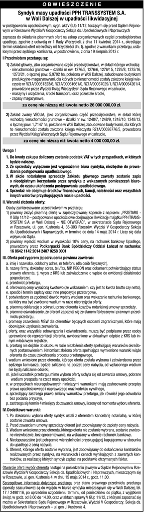 OBWIESZCZENIE Syndyk masy upadłości PPH TRANSSYSTEM S.A. w Woli Dalszej w upadłości likwidacyjnej w postępowaniu upadłościowym, sygn. akt V GUp 11/12, toczącym się przed Sądem Rejonowym w Rzeszowie Wydział V Gospodarczy Sekcja ds. Upadłościowych i Naprawczych zaprasza do składania pisemnych ofert na zakup zorganizowanych części przedsiębiorstwa upadłego, zgodnie z uchwałą nr 1 Rady Wierzycieli, z dnia 11 kwietnia 2014 r., określając termin składania ofert nie krótszy niż trzydzieści dni, tj. zgodnie z warunkami przetargu, ustalonymi przez sędziego komisarza, w postanowieniu, z dnia 19 sierpnia 2013 r. I Przedmiotem przetargu są: 1) Zakład główny, jako zorganizowana część przedsiębiorstwa, w skład którego wchodzą: - nieruchomości gruntowe – działki nr ew. 1276/5, 1276/6, 1276/15, 1276/8, 1275/16, 1273/21, o łącznej pow. 5,9702 ha, położona w Woli Dalszej, zabudowane budynkami produkcyjno-magazynowymi, dla których to nieruchomości zostały założone księgi wieczyste nr RZ1A/00051323/6, RZ1A/00061661/0, RZ1A/00037029/1, RZ1A/00054261/4, prowadzone przez Wydział Ksiąg Wieczystych Sądu Rejonowego w Łańcucie, - maszyny i urządzenia, środki transportu oraz pozostałe środki, - zapasy magazynowe, za cenę nie niższą niż kwota netto 26 000 000,00 zł. 2) Zakład zwany VEOLIA, jako zorganizowana część przedsiębiorstwa, w skład której wchodzą nieruchomości gruntowe – działki nr ew. 1248/7, 1248/9, 1248/10, 1248/13, o łącznej pow. 1,7147 ha, położone w Woli Dalszej, zabudowane budynkami, dla których to nieruchomości została założona księga wieczysta RZ1A/00036776/5, prowadzona przez Wydział Ksiąg Wieczystych Sądu Rejonowego w Łańcucie, za cenę nie niższą niż kwota netto 4 000 000,00 zł. Uwaga ! 1. Do kwoty zakupu doliczony zostanie podatek VAT w tych przypadkach, w których będzie należny. 2. Ze sprzedaży wyłączone jest wyposażenie biura syndyka, niezbędne do prowadzenia postępowania upadłościowego. 3. W akcie notarialnym sprzedaży Zakładu głównego zawarty zostanie zapis o nieodpłatnym korzystaniu przez syndyka z wskazanych pomieszczeń biurowych, do czasu ukończenia postępowania upadłościowego. 4. Sprzedaż nie obejmuje środków finansowych, kaucji, należności oraz wszystkich innych walorów przysługujących masie upadłości. II. Warunki złożenia oferty: Osoby zainteresowane uczestnictwem w przetargu: 1) powinny złożyć pisemną ofertę w zapieczętowanej kopercie z napisem: „PRZETARG V GUp 11/12 – postępowanie upadłościowe obejmujące likwidację majątku PPH TRANSSYSTEM S.A. w Woli Dalszej – NIE OTWIERAĆ”, w sekretariacie Sądu Rejonowego w Rzeszowie, ul. gen. Kustronia 4, 35-303 Rzeszów, Wydział V Gospodarczy Sekcja ds. Upadłościowych i Naprawczych, w terminie do dnia 14 maja 2014 r. Liczy się data wpływu do Sądu. 2) powinny wpłacić wadium w wysokości 10% ceny, na rachunek bankowy Upadłego, prowadzony przez Podkarpacki Bank Spółdzielczy Oddział Łańcut nr rachunku: 16 8642 1142 2014 2407 0258 0001 III. Oferta pod rygorem jej odrzucenia powinna zawierać: a. imię i nazwisko, dokładny adres, nr telefonu (dla osób fizycznych), b. nazwę firmy, dokładny adres, tel./fax, NIP, REGON oraz dokument potwierdzający status prawny oferenta, tj. wypis z KRS lub zaświadczenie o wpisie do ewidencji działalności gospodarczej, c. przedmiot przetargu, d. oferowaną cenę wyrażoną kwotowo (ze wskazaniem, czy jest to kwota brutto czy netto), e. sposób i termin zapłaty oraz inne propozycje przetargowe, f. potwierdzony za zgodność dowód wpłaty wadium oraz wskazanie rachunku bankowego, na który ma być zwrócone wadium w razie nieprzyjęcia oferty, g. pisemną deklarację o pokryciu przez oferenta kosztów notarialnej umowy sprzedaży, h. pisemne oświadczenie, że oferent zapoznał się ze stanem faktycznym i prawnym przedmiotu przetargu, i. promesę zezwolenia MSW dla oferentów będących osobami zagranicznymi, które mają obowiązek uzyskania zezwolenia. j. oferty, oraz wszystkie zobowiązania i oświadczenia, muszą być podpisane przez osoby uprawnione do reprezentacji oferenta, uwidocznione w aktualnym odpisie z KRS lub innym właściwym rejestrze, k. przetarg nie dojdzie do skutku w razie niezłożenia oferty spełniającej warunków określonych postanowieniem. Natomiast złożona oferta spełniająca wymienione warunki wiąże oferenta do czasu zakończenia procesu przetargowego, l. wadium wniesione przez oferenta, którego oferta została wybrana i zatwierdzona przez sędziego komisarza, będzie zaliczona na poczet ceny nabycia, od wpłaconego wadium nie będą naliczone odsetki, m. jeżeli uczestnik przetargu, mimo wyboru oferty uchyla się od zawarcia umowy, pobrane wadium przepada na rzecz masy upadłości, n. w przypadkach nieuregulowanych niniejszymi warunkami mają zastosowanie przepisy prawa upadłościowego i naprawczego oraz kodeksu cywilnego, o. sprzedający zastrzega prawo zmiany warunków przetargu, jak również jego odwołania bez podania przyczyn, p. zastrzega się termin 4 miesięcy do zawarcia umowy, liczony od momentu wyboru oferenta. IV. Dodatkowe warunki: 1. Po dokonaniu wyboru oferty syndyk ustali z oferentem kancelarię notarialną, w której zostanie zawarta umowa. 2. Przed zawarciem umowy sprzedaży oferent jest zobowiązany do zapłaty ceny nabycia. 3. Wadium wniesione przez oferenta, którego oferta nie zostanie wybrana, zostanie zwrócone niezwłocznie, bez oprocentowania, na wskazany w ofercie rachunek bankowy. 4. Niedopuszczalne jest potrącenie wierzytelności przysługującej kupującemu w stosunku do upadłego z ceną nabycia. 5. Oferent, którego oferta zostanie wybrana, jest zobowiązany do dokończenia kontraktów realizowanych przez syndyka, na warunkach i cenach wynikających z zawartych kontraktów, za realizację których syndyk zapłaci na podstawie otrzymanych faktur. Otwarcie ofert i wybór oferenta nast