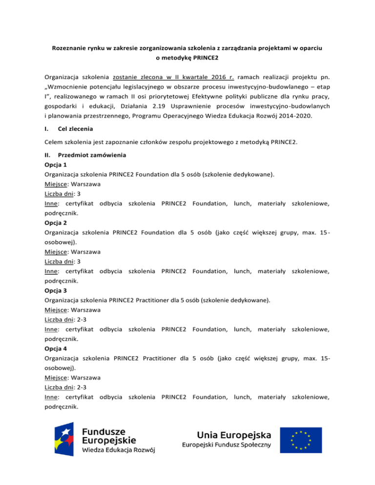 Rozeznanie rynku w zakresie zorganizowania szkolenia z zarządzania projektami w oparciu o metodykę PRINCE2 Organizacja szkolenia zostanie zlecona w II kwartale 2016 r. ramach realizacji projektu pn. „Wzmocnienie potencjału legislacyjnego w obszarze procesu inwestycyjno-budowlanego – etap I”, realizowanego w ramach II osi priorytetowej Efektywne polityki publiczne dla rynku pracy, gospodarki i edukacji, Działania 2.19 Usprawnienie procesów inwestycyjno -budowlanych i planowania przestrzennego, Programu Operacyjnego Wiedza Edukacja Rozwój 2014-2020. I. Cel zlecenia Celem szkolenia jest zapoznanie członków zespołu projektowego z metodyką PRINCE2. II. Przedmiot zamówienia Opcja 1 Organizacja szkolenia PRINCE2 Foundation dla 5 osób (szkolenie dedykowane). Miejsce: Warszawa Liczba dni: 3 Inne: certyfikat odbycia szkolenia PRINCE2 Foundation, lunch, materiały szkoleniowe, podręcznik. Opcja 2 Organizacja szkolenia PRINCE2 Foundation dla 5 osób (jako część większej grupy, max. 15 osobowej). Miejsce: Warszawa Liczba dni: 3 Inne: certyfikat odbycia szkolenia PRINCE2 Foundation, lunch, materiały szkoleniowe, podręcznik. Opcja 3 Organizacja szkolenia PRINCE2 Practitioner dla 5 osób (szkolenie dedykowane). Miejsce: Warszawa Liczba dni: 2-3 Inne: certyfikat odbycia szkolenia PRINCE2 Foundation, lunch, materiały szkoleniowe, podręcznik. Opcja 4 Organizacja szkolenia PRINCE2 Practitioner dla 5 osób (jako część większej grupy, max. 15osobowej). Miejsce: Warszawa Liczba dni: 2-3 Inne: certyfikat odbycia szkolenia PRINCE2 Foundation, lunch, materiały szkoleniowe, podręcznik.