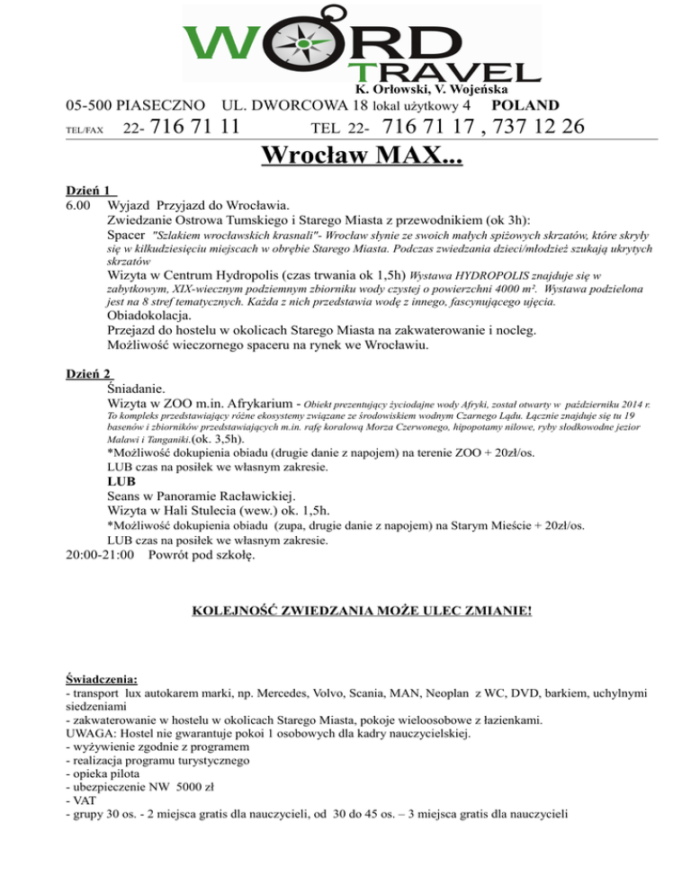 05-500 PIASECZNO TEL/FAX 22- 716 K. Orłowski, V. Wojeńska UL. DWORCOWA 18 lokal użytkowy 4 POLAND 71 11 TEL 22- 716 71 17 , 737 12 26 Wrocław MAX... Dzień 1 6.00 Wyjazd Przyjazd do Wrocławia. Zwiedzanie Ostrowa Tumskiego i Starego Miasta z przewodnikiem (ok 3h): Spacer "Szlakiem wrocławskich krasnali"- Wrocław słynie ze swoich małych spiżowych skrzatów, które skryły się w kilkudziesięciu miejscach w obrębie Starego Miasta. Podczas zwiedzania dzieci/młodzież szukają ukrytych skrzatów Wizyta w Centrum Hydropolis (czas trwania ok 1,5h) Wystawa HYDROPOLIS znajduje się w zabytkowym, XIX-wiecznym podziemnym zbiorniku wody czystej o powierzchni 4000 m². Wystawa podzielona jest na 8 stref tematycznych. Każda z nich przedstawia wodę z innego, fascynującego ujęcia. Obiadokolacja. Przejazd do hostelu w okolicach Starego Miasta na zakwaterowanie i nocleg. Możliwość wieczornego spaceru na rynek we Wrocławiu. Dzień 2 Śniadanie. Wizyta w ZOO m.in. Afrykarium - Obiekt prezentujący życiodajne wody Afryki, został otwarty w październiku 2014 r. To kompleks przedstawiający różne ekosystemy związane ze środowiskiem wodnym Czarnego Lądu. Łącznie znajduje się tu 19 basenów i zbiorników przedstawiających m.in. rafę koralową Morza Czerwonego, hipopotamy nilowe, ryby słodkowodne jezior Malawi i Tanganiki.(ok. 3,5h). *Możliwość dokupienia obiadu (drugie danie z napojem) na terenie ZOO + 20zł/os. LUB czas na posiłek we własnym zakresie. LUB Seans w Panoramie Racławickiej. Wizyta w Hali Stulecia (wew.) ok. 1,5h. *Możliwość dokupienia obiadu (zupa, drugie danie z napojem) na Starym Mieście + 20zł/os. LUB czas na posiłek we własnym zakresie. 20:00-21:00 Powrót pod szkołę. KOLEJNOŚĆ ZWIEDZANIA MOŻE ULEC ZMIANIE! Świadczenia: - transport lux autokarem marki, np. Mercedes, Volvo, Scania, MAN, Neoplan z WC, DVD, barkiem, uchylnymi siedzeniami - zakwaterowanie w hostelu w okolicach Starego Miasta, pokoje wieloosobowe z łazienkami. UWAGA: Hostel nie gwarantuje pokoi 1 osobowych dla kadry nauczycielskiej. - wyżywienie zgodnie z programem - realizacja programu turystycznego - opieka pilota - ubezpieczenie NW 5000 zł - VAT - grupy 30 os. - 2 miejsca gratis dla nauczycieli, od 30 do 45 os. – 3 miejsca gratis dla nauczycieli Cena: 200 zł/min. 40 os. - max. 45 os. płacących Cena: 220 zł/min. 35 os. - max. 39 os. płacących Cena: 240 zł/min. 30 os. - max. 34 os. płacących +dodatkowo bilety wstępu od 50 do 70 zł/os. (kwota ta jest uzależniona od opcji w programie i konkretnych wejść, którymi jesteście Państwo zainteresowani) *Możliwość dokupienia obiadu w ostatnim dniu wycieczki: 1. na Starym Mieście ( zupa, drugie danie, napój) + 20zł/os. LUB 2. na terenie Zoo (drugie danie, napój) + 20zł/os. Standardowy rozmiar naszych autokarów to 49 miejsc (do dyspozycji grupy wraz z opiekunami). Na Państwa życzenie możemy zarezerwować autokary 57-70 miejsc (w tym przypadku prosimy o kontakt z biurem w celu sprawdzenia kalkulacji na ponadstandardowy pojazd i jego dostępności w wybranym przez Państwa terminie). W celu podpisania umowy i rezerwacji konkretnego terminu prosimy o telefon do biura 022 716 71 11 lub 022 716 71 17 lub mail [email protected] Zaliczka konieczna do podpisania umowy: 100 zł/os. Ze względu na szczyt sezonu wycieczek szkolnych w miesiącach maj-czerwiec sugerujemy dokonanie rez. wstępnej. Termin, który Państwa interesuje, potwierdzamy po sprawdzeniu dostępności wolnych miejsc w hotelu. Dokonujemy rezerwacji wstępnej na czas zebrania zaliczek przez nauczyciela (najczęściej nie dłużej niż 4 tyg.). KWOTĘ NA BILETY WSTĘPU POTWIERDZAMY PRZED DOPŁATĄ ZGODNIE Z OBOWIĄZUJĄCYMI CENNIKAMI Wyciąg z warunków uczestnictwa imprez turystycznych organizowanych przez B.P. Word Travel (pełna wersja warunków uczestnictwa dostępna jest u nauczyciela organizującego wycieczkę): 13. W przypadku rezygnacji lub nie uczestniczenia Uczestnika w wykupionej imprezie Organizator uprawniony jest do potrącenia RZECZYWIŚCIE PONIESIONYCH KOSZTÓW. 14. Zmiana uczestnika nie pociąga za sobą kosztów finansowych. 18. Uczestnik odpowiada za wszelkie szkody materialne wyrządzone w trakcie trwania imprezy (zniszczenia w hotelu, autokarze). 15. Jeżeli w programie jest wyjazd poza granicę Polski - uczestnik winien posiadać na miejscu zbiórki aktualnie obowiązujące dokumenty uprawniające do przekroczenia granic krajów objętych programem imprezy (wyłącznie dowód osobisty lub paszport ważny min. 6 m-cy od daty powrotu). 9 B. W przypadku chorób uznawanych za przewlekłe uczestnik winien na własny koszt wykupić dodatkowe ubezpieczenie ! (dotyczy wycieczek zagranicznych). Klient przez dokonanie wpłaty (całkowitej lub częściowej) akceptuje program wycieczki i warunki uczestnictwa.