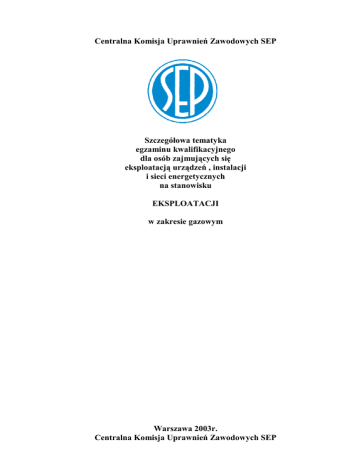 Centralna Komisja Uprawnień Zawodowych SEP Szczegółowa tematyka egzaminu kwalifikacyjnego dla osób zajmujących się eksploatacją urządzeń , instalacji i sieci energetycznych na stanowisku EKSPLOATACJI w zakresie gazowym Warszawa 2003r. Centralna Komisja Uprawnień Zawodowych SEP Szczegółowa tematyka egzaminu kwalifikacyjnego dla osób zajmujących się eksploatacją urządzeń , instalacji i sieci energetycznych na stanowisku EKSPLOATACJI w zakresie gazowym 1. Podstawa prawna ustalenia szczegółowej tematyki egzaminu Postawę prawną do ustalenia szczegółowej tematyki egzaminu stanowi par.8 ust.4 Rozporządzenia Ministra Gospodarki , Pracy i Polityki Społecznej z dnia 28 kwietnia 2003 r. w sprawie szczegółowych zasad stwierdzania posiadania kwalifikacji przez osoby zajmujące się eksploatacją urządzeń , instalacji i sieci . (Dz.U. Nr 89 , poz. 828). 2.Określenie osób na stanowiskach eksploatacji Są to osoby zajmujące się eksploatacją urządzeń , instalacji i sieci energetycznychgazowych i wykonujące prace w zakresie : obsługi , konserwacji , remontu , montaŜu i kontrolno-pomiarowym. 3.Postanowienia ogólne Szczegółowa tematyka egzaminacyjna powinna zapewniać jednolitość wymagań stawianych egzaminowanym. Powinna ona być podana pisemnie do wiadomości kandydatom ubiegającym się o potwierdzenie kwalifikacji co najmniej na 14 dni przed wyznaczoną datą egzaminu. Tematykę opracowano w układzie wymaganych wiadomości w zakresie energetycznym-gazowym określonym w par.6 pkt.1 Rozporządzenia Ministra Gospodarki, Pracy i Polityki Społecznej z dnia 28 kwietnia 2003 r. 4.Szczegółowa tematyka egzaminu Szczegółowa tematyka egzaminu obejmuje zakres wymagań odnośnie wiedzy jaką powinny się wykazać osoby zajmujące się eksploatacją na stanowisku Eksploatacji , a określonych w par. 6 pkt.1 Rozporządzenia Ministra Gospodarki , Pracy i Polityki Społecznej z dnia 28 kwietnia 2003 r. w zaleŜności od eksploatowanych urządzeń instalacji i sieci energetycznych-gazowych , podanych w załączniku nr 1 (Grupa 3) do wyŜej wymienionego Rozporządzenia . 4.1.Zasady budowy, działania oraz warunki techniczne obsługi urządzeń , instalacji i sieci energetycznych-gazowych - Ogólna charakterystyka przepisów i norm dotyczących budowy urządzeń , instalacji i sieci energetycznych-gazowych . - Zasady budowy i działania urządzeń energetycznych-gazowych oraz ich parametry techniczne (typ, rodzaj , moc, ciśnienie itp.). - WyposaŜenie urządzeń w aparaturę kontrolno-pomiarową i regulacyjno-zabezpieczeniową . 2 - Oznaczenia techniczne i eksploatacyjne na urządzeniach i instalacjach energetycznychgazowych . 4.2.Zasady eksploatacji oraz instrukcje eksploatacji urządzeń , instalacji i sieci energetycznych-gazowych - Znajomość instrukcji eksploatacji w zakresie wykonywanych czynności eksploatacyjnych . - Czynności związane z prawidłowym uruchamianiem , prowadzeniem ruchu i zatrzymaniem urządzenia energetyczno-gazowego . - Zakresy i częstotliwość wykonywania zapisów ruchowych wskazań aparatury kontrolnopomiarowej. - Terminy i zakresy przeprowadzania oględzin , przeglądów , napraw, remontów oraz prób i pomiarów . 4.3.Zasady i warunki wykonywania prac kontrolno-pomiarowych i montaŜowych -Zasady wykonywania pomiarów eksploatacyjnych w zakresie : • • • • parametrów charakteryzujących urządzenia, instalacje i sieci energetyczno-gazowe, sprawności agregatów, urządzeń i instalacji gazowych, jakości nośników energetycznych, kontroli wskazań aparatury kontrolno – pomiarowej. -Sporządzenie protokołu z badań i pomiarów. -Interpretacja wyników pomiarów. -Zasady wykonywania prac montaŜowych urządzeń , instalacji i sieci energetycznychgazowych, wymagane przepisami i normami. 4.4.Zasady i wymagania bezpieczeństwa pracy i ochrony przeciwpoŜarowej oraz umiejętności udzielania pierwszej pomocy - Obowiązki pracowników w zakresie bhp . - Znajomość zagroŜeń występujących na stanowisku pracy . - Zasady organizacji prac przy urządzeniach i instalacjach energetycznych-gazowych. - Rodzaje poleceń i zasady przygotowania miejsca pracy . - Narzędzia pracy, sprzęt ochronny i odzieŜ ochronna do prac przy urządzeniach energetyczno-gazowych. - Zasady bezpieczeństwa poŜarowego przy urządzeniach energetycznych-gazowych . -Sprzęt przeciwpoŜarowy i zasady jego stosowania do gaszenia poŜarów w urządzeniach i instalacjach energetycznych-gazowych . -Umiejętność udzielania pierwszej pomocy. 4.5.Instrukcje postępowania w razie awarii , poŜaru lub innego zagroŜenia bezpieczeństwa obsługi urządzeń lub zagroŜenia Ŝycia , zdrowia i środowiska 3 - Znajomość instrukcji postępowania w razie awarii , poŜaru lub innego zagroŜenia bezpieczeństwa obsługi i otoczenia . - Sposoby informowania osób kierownictwa oraz instytucji powołanych do usuwania awarii , gaszenia poŜaru , itp. - Znajomość telefonów i systemów alarmowych . Uwaga: Osoba przystępująca do egzaminu kwalifikacyjnego powinna wykazywać się ogólną znajomością postanowień zawartych w obowiązującej Ustawie z dnia 10.04.1997r. „Prawo Energetyczne” , w Ustawie z 7.07.1994r. ”Prawo Budowlane” oraz rozporządzeniach wykonawczych do tych Ustaw. Ponadto powinna znać zasady wynikające z Przepisów Budowy Urządzeń Energetycznych, Przepisów Eksploatacji Urządzeń Energetycznych, Norm, Kodeksu Pracy oraz instrukcji stanowiskowych i zakładowych – wszystko w zakresie określonym „Wnioskiem o sprawdzenie kwalifikacji ”- a takŜe praktyczną umiejętność udzielenia pomocy przedlekarskiej. Wybrane akty prawne i normy 1. Ustawa z dnia 10 kwietnia 1997r. Prawo energetyczne (Jednolity tekst Dz.U. Nr 153, poz. 1504 z 2003r.) 2. Ustawa z dnia 7 lipca 1994r. Prawo budowlane (Jednolity tekst Dz.U. Nr 106 , poz. 1126 z 2000r.). 3. Kodeks pracy. Tekst ujednolicony. Dział 4 i 10 (Dz.U. z 1998r. Nr 21, poz. 94 z późn. zm.). 4. Rozporzą