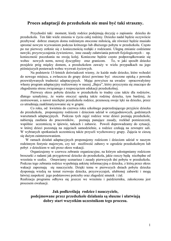 Proces adaptacji do przedszkola nie musi być taki straszny. Przychodzi taki moment, kiedy rodzice podejmują decyzję o zapisaniu dziecka do przedszkola. Ten fakt wiele zmienia w życiu całej rodziny. Dziecko nadal będzie oczywiście przebywać dobrze znanym domu rodzinnym otoczone miłością, ale również będzie musiało sprostać nowym wyzwaniom podczas krótszego lub dłuższego pobytu w przedszkolu. Często po raz pierwszy zetknie się z koniecznością rozłąki z rodzicami. Ulegną zmianie codzienne nawyki, przyzwyczajenia żywieniowe, inne zasady załatwiania potrzeb fizjologicznych - np. konieczność poczekania na swoją kolej. Konieczne będzie często podporządkowanie się wobec nowych norm, nowej dyscypliny oraz granicom. To, w jaki sposób dziecko przejdzie próg między domem, a przedszkolem zaważy w wielu przypadkach na jego późniejszych postawach wobec wyzwań życiowych. Na podstawie 13-letnich doświadczeń wiemy, że każde małe dziecko, które wchodzi do nowego miejsca, a zwłaszcza do grupy dzieci powinno być otoczone opieką z powodu przewidywanych trudności adaptacyjnych. Mając powyższe na uwadze opracowałyśmy własny program adaptacyjny realizowany w naszej „Bajce”, który przyczynia się znacząco do złagodzenia stresu związanego z rozpoczęciem edukacji przedszkolnej. Pierwszy okres pobytu dziecka w przedszkolu to trudny czas także dla rodziców, dlatego uznałyśmy, że warto otoczyć opieką także rodzinę dziecka, tym bardziej, że zestresowani, a nawet niechętni przedszkolu rodzice, przenoszą swoje lęki na dziecko, przez co utrudniają zaaklimatyzowanie się w grupie. Co roku, od kwietnia do czerwca roku szkolnego poprzedzającego przyjście dziecka do przedszkola, proponujemy rodzicom i dzieciom udział w cotygodniowych, godzinnych warsztatach adaptacyjnych. Podczas tych zajęć rodzice wraz dzieci poznają przedszkole, nabierają zaufania do pracowników, poznają panujące zasady, rozkład pomieszczeń, wspólnie uczestniczą w śpiewie, tańcach i zabawie. Powoli doprowadzamy do sytuacji, w której dzieci pozostają na zajęciach samodzielnie, a rodzice czekają na zewnątrz sali. W wybranych spotkaniach uczestniczą także przyszli wychowawcy grupy. Zajęcia te cieszą się dużym zainteresowaniem. W ramach działań adaptacyjnych proponujemy rodzicom i dzieciom udział w naszym rodzinnym festynie majowym, czy też możliwość zabawy w ogrodzie przedszkolnym lub pobyt z dzieckiem w sali przez okres wakacji. Organizujemy w czerwcu zebranie organizacyjne, na którym udostępniamy rodzicom broszurki z radami jak przygotować dziecko do przedszkola, jakie rzeczy będą niezbędne od września w szafce. Omawiamy scenariusz i zasady pierwszych dni pobytu w przedszkolu. Podczas tego zebrania rodzice wypełniają ankietę informacyjną o dziecku, z którą przez okres wakacji zapoznają się nauczyciele. Dzięki temu w pierwszych dniach pobytu dziecka dysponują wiedzą na temat rozwoju dziecka, przyzwyczajeń, ulubionej zabawki i mogą łatwiej zaspokoić jego podstawowe potrzeby oraz złagodzić smutek i żal. Realizacja programu odbywa się jeszcze we wrześniu i październiku, zakończona jest procesem ewaluacji. Jak podkreślają rodzice i nauczyciele, podejmowane przez przedszkole działania są słuszne i ułatwiają dobry start wszystkim uczestnikom tego procesu. 1 Obserwowane sukcesy po wdrożeniu programu adaptacyjnego. Dzieci: * znają nowe otoczenie; * znają pracowników przedszkola a w szczególności wychowawców grupy; * znają inne dzieci z grupy; * posiadają poczucie przynależności do danej grupy; * mają poczucie bezpieczeństwa; * podejmują zabawy w sali i w ogrodzie przedszkolnym; Rodzice: * znają pracowników przedszkola; * znają rozkład i wyposażenie wszystkich pomieszczeń; * znają wychowawców swoich dzieci; * znają wewnętrzne przepisy obowiązujące w przedszkolu ( Statut, Ramowy rozkład dnia, Regulamin Rady Rodziców, zasady odbioru dzieci); * posiadają wiedzę psychologiczną o problemach związanych z przystosowaniem się małych dzieci; * posiadają wiedzę na temat zasadności współpracy z nauczycielami i odpowiedniego przygotowania dzieci do przedszkola. Nauczyciele: * znają dzieci i rodziców; * posiadają informację o przyzwyczajeniach dzieci, ich ulubionych zabawach, ewentualnych jednostkach chorobowych, lękach. * ograniczają w środowisku przedszkolnym liczbę bodźców utrudniających adaptację; 2
