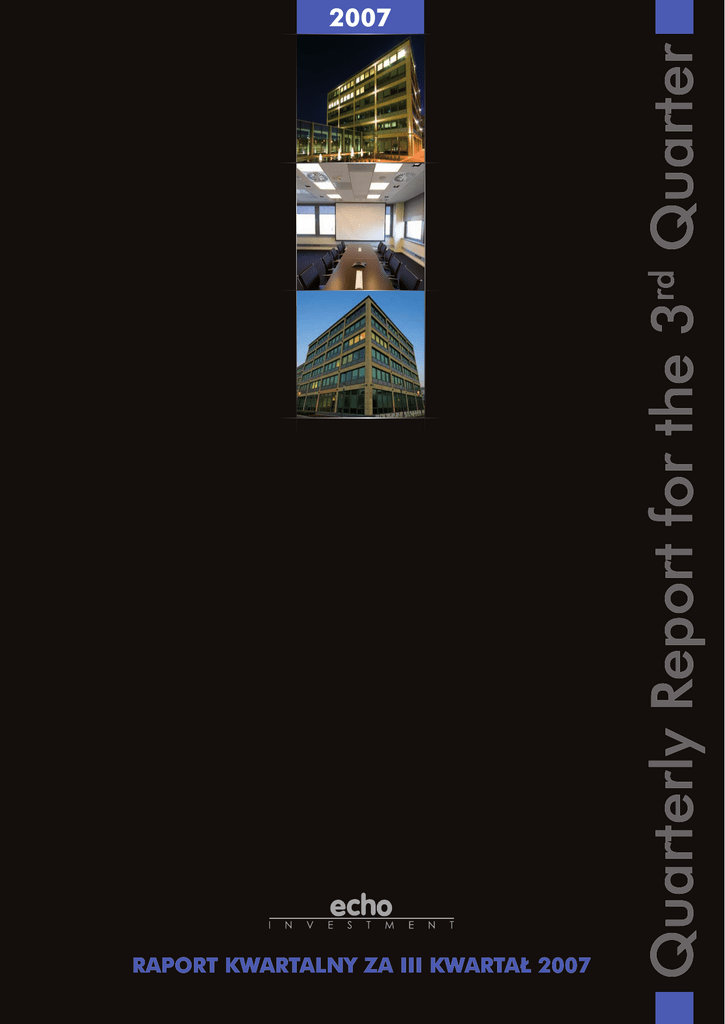 rd Quarterly Report for the 3 Quarter 2007 Raport Kwartalny za III kwartał 2007 rd Quarterly Report for the 3 Quarter 2007 Raport Kwartalny za III kwartał 2007 Spis treści Contents Wyniki Grupy po trzech kwartałach 1 The Group’s results after three quarters Wybrane skonsolidowane dane finansowe 2 Selected Consolidated Financial Data Echo na Giełdzie 3 Echo in Stock Exchange Echo Investment S.A. w III kwartale 2007 r. 4 Echo Investment S.A. during the 3rd Quarter of 2007 Skonsolidowane sprawozdanie finansowe 13 Condensed Financial Statement Wyniki Grupy po trzech kwartałach Grupa Kapitałowa Echo Investment po 3 kwartałach 2007 roku osiągnęła zysk netto w wysokości 268 mln PLN i jest to rezultat o ponad 10 proc. wyższy niż w analogicznym okresie roku poprzedniego. Echo Investment Capital Group obtained, after 3 quarters of 2007, a net income in the amount of 268 mln PLN and it is a result higher by more than 10% than the resulf for the identical period of last year. Na osiągnięty wynik wpływ miały przede wszystkim aktualizacja wyceny nieruchomości posiadanych przez Grupę Kapitałową, a także rozliczenie transakcji sprzedaży dwóch projektów biurowych i dwóch centrów handlowych w Łodzi i Kielcach. Na zwiększenie wartości przychodów wpłynęły również środki uzyskane z wynajmu powierzchni komercyjnych i sprzedaży projektów mieszkaniowych. Acquired result was in the first place, an outcome of updating of pricing on real property owned by the Capital Group and also settlement of sale transactions of two office projects and two shopping centers in Łódź and Kielce. Obtained result was also influenced by income acquired from the lease of commercial areas and sale of residential projects. Obecnie przygotowywany jest szereg nowych inwestycji i pozyskiwane są nieruchomości gruntowe pod kolejne realizacje. W minionym kwartale Grupa nabyła tereny pod realizację m.in.: budynków mieszkalnych w Łodzi (o powierzchni około 53 tys. mkw.; będzie to 800 mieszkań na sprzedaż), business parków w Katowicach (o powierzchni wynajmowalnej około 45 tys. mkw.) i Łodzi (o powierzchni wynajmowanej ok. 23 tys. mkw.), a także nowoczesnego, regionalnego centrum handlowo-rozrywkowego w Kaliszu (o powierzchni wynajmowalnej ok. 40 tys. mkw.). At the moment a number of new investments are in the pipeline and new land property is acquired for successive projects. In the past quarter the Group purchased land for realization of, among others: residential buildings in Łódź (of the area of approximately 53 thousand sq. m., with 800 apartmements for sale), business parks in Katowice (of the lease area of approximately 45 thousand sq. m.) and Łódź (of the lease area of approximately 23 thousand sq.m.) and also a modern regional shopping-entertainment center in Kalisz (of the lease area of approximately 40 thousand sq. m.). Zgodnie z przyjętą strategią rozwoju, zakładającą ograniczenie ryzyka prowadzonej działalności, Echo Investment zmierza do geograficznego zróżnicowania planowanych przedsięwzięć i inwestuje w krajach Europy Środkowej i Wschodniej. Pursuing its adopted development strategy, assuming limitation of risk in conducted activity, Echo Investment aims at geographical differentiation of its planned enterprises and invests in countries of Middle and Eastern Europe. Pod koniec września została sfinalizowana transakcja zakupu gruntów w rumuńskim mieście Brasov. Na pozyskanej działce powstanie nowoczesne centrum handlowo-rozrywkowe. Obecnie trwają przygotowania do wejścia na nowy rynek – przedstawiciele Spółki pracują nad możliwościami realizacji nowych projektów na Ukrainie i prowadzą szczegółowe analizy tamtejszego rynku nieruchomości. Quarterly Report for the 3rd Quarter of 2007 The Group’s results after three quarters At the end of September 2007 a transaction of land purchase was finalized in Romanian city, Brasov. On the acquired plot a modern shopping-entertainment center shall be erected. Presently the Company prepares to enter a new market - Company’s representatives are making their way to obtain possibilities of realization of new projects in Ukraine and they conduct detailed analyses of local real estate market. Raport Kwartalny za III kwartał 2007 r. 1 Wybrane skonsolidowane dane finansowe Quarterly Report for the 3rd Quarter of 2007 Selected Consolidated Financial Data Wybrane pozycje rachunku zysku i strat 2003 Przychody netto ze sprzedaży towarów i produktów (w tys. PLN) 312 407 2004* 332 114 SELECTED INCOME STATEMENT ITEMS 2005* 257 939 2006* 333 249 od 01.01.2007 do 30.09.2007* 285 228 Net income from sales of goods and products (PLN ‘000) Zysk przed opodatkowaniem i uwzględnieniem przychodów/kosztów finansowych (w tys. PLN) 78 605 (24 101) 291 992 381 025 351 267 Profit before tax and financial income/expenses (PLN ‘000) Zysk brutto (tys. PLN) 42 639 34 354 266 806 346 053 335 314 Profit before taxation (PLN ‘000) Zysk netto (tys. PLN) 28 735 26 399 194 414 278 132 268 237 Net profit (PLN ‘000) Kapitał akcyjny (tys. PLN) 21 000 21 000 21 000 21 000 21 000 Share capital (PLN ‘000) 917 103 1 195 243 1 463 471 Shareholders’ equity of parent company’s shareholders. (PLN ‘000) Kapitał własny przypadający akcjonariuszom jednostki dominującej (tys. PLN) Zysk na jedną akcję (PLN) Wartość księgowa jednej akcji (PLN) 340 017 722 119 2,74 2,51 18,41 6,62 7,31 Profit per share (PLN) 32,38 68,77 87,24 28,46 34,84 Book value per share (PLN) 1 Jan. 2007 to 30 Sep. 2007* * Skonsolidowane Sprawozdanie Finansowe sporządzone zostało na podstawie Międzynarodowych Standardów Sprawozdawczości Finansowej, zgodnie z obowiązkiem ustawowym wprowadzonym w 2005 r. 2 Raport Kwartalny za III kwartał 2007 r. *The Consolidated Financial Statement has been prepared on the basis of International Financial Reporting Standards, according to legal obligation enforced in 2005. Echo na Giełdzie Akcjonariat 30